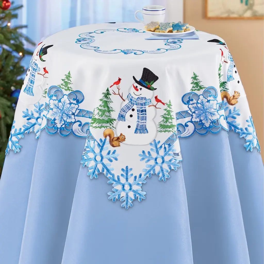 This Charming Snowman Table Linen Design Includes A Border Of Beautiful Blue Snowflakes. They're Perfect On Their Own Or With A Coordinating Tablecloth Underneath (Sold Separately). Machine Wash. Polyester; Imported. Choose: Runner (67 1/2"L X 13 1/2"W) Or Square (33 1/2"Sq.).
