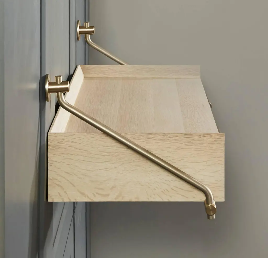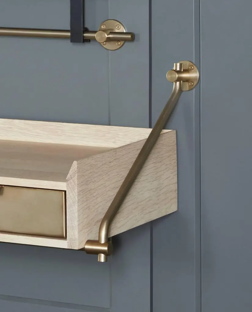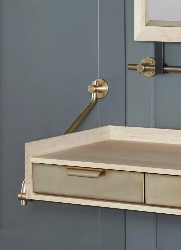 Amuneal’s wall hanging bleached oak console table uses our traditional Collector’s Shelving hardware to support this two-drawer unit with raised knife-edge surround. The scale of the unit and its unique floating design make it a great entry table, home office desk, make-up table or bathroom vanity. The solid white oak is milled in-house and the color of the wood is extracted using Amuneal’s special bleach formulation. The metalwork is solid brass with a warm pewter patina giving it a champagne appearance as a perfect compliment to the bleached oak. This modern unit is fabricated in our Philadelphia-based furniture studio and is customizable in different metal and wood finishes and in different sizes and configurations.Dimensions listed are for the overall size including hardware.