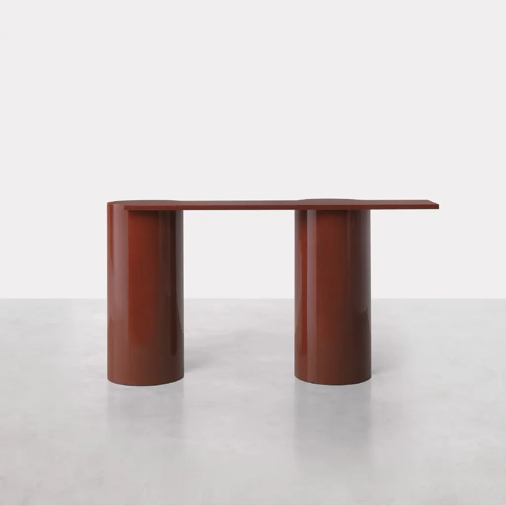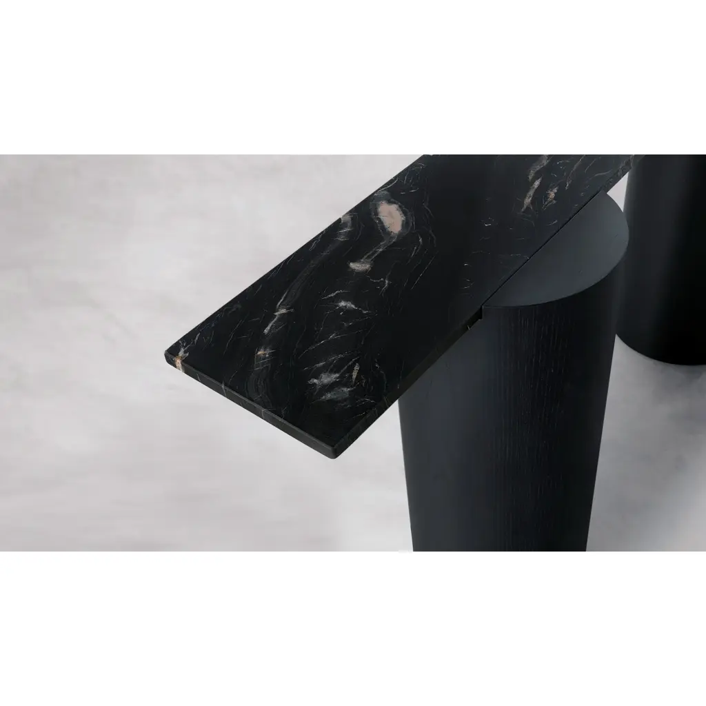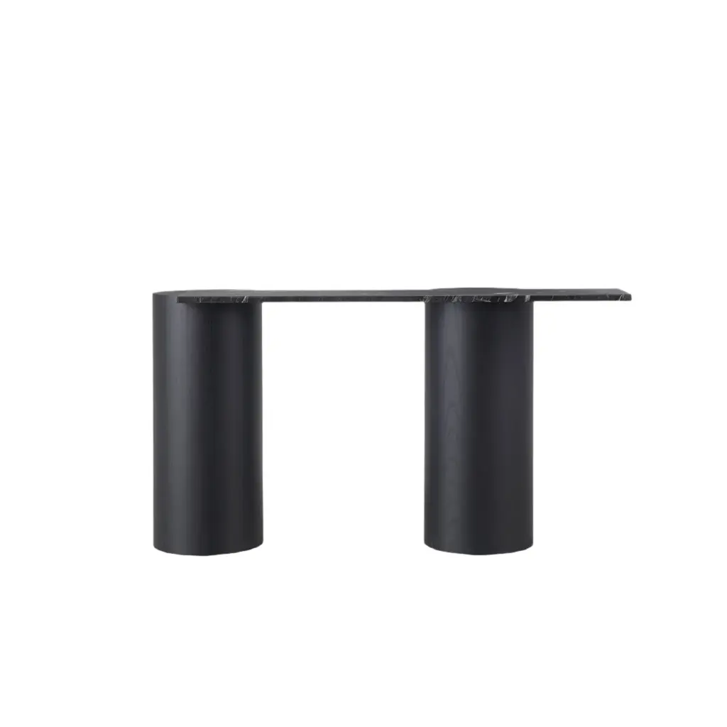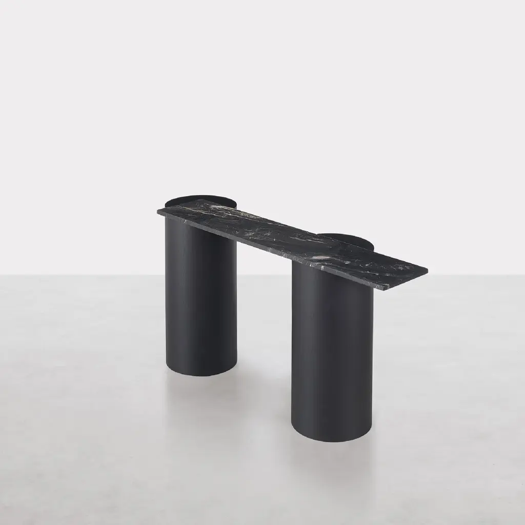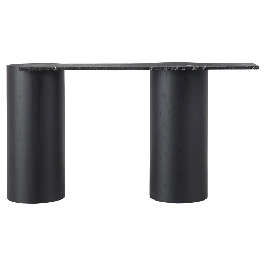 Introducing the Plinto Console, where ancient temple legs meet contemporary design. The column legs, crafted from lightened mdf, add a sophisticated touch while the cantilevered top in marble or lacquered mdf adds a playful contrast. This double sided table is both historic and modern, bringing a sense of elegance and balance to any space.