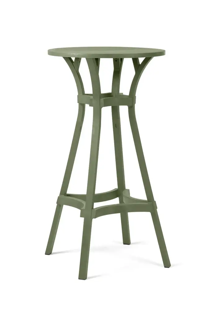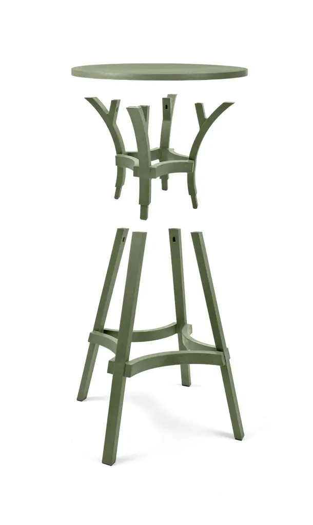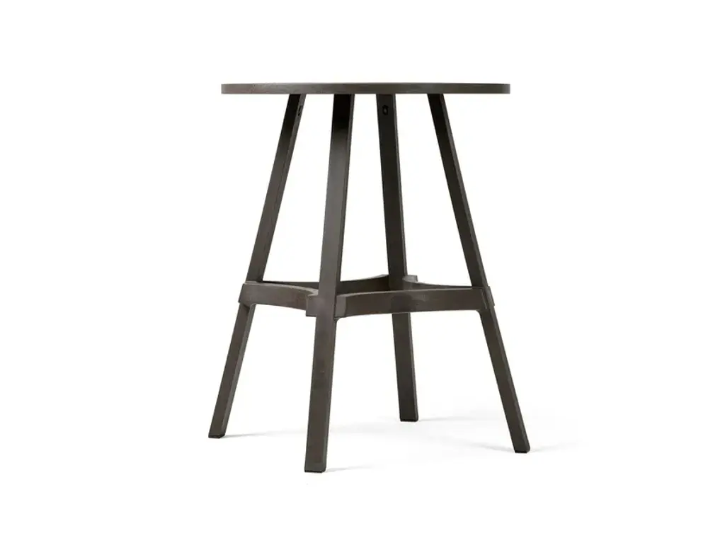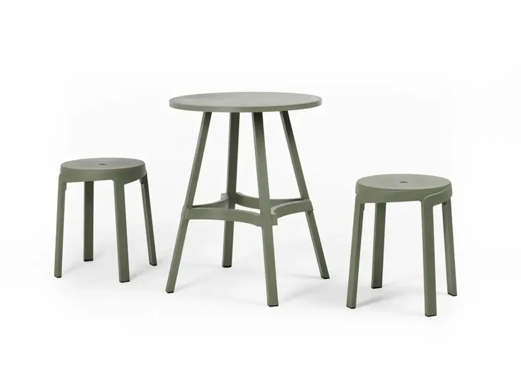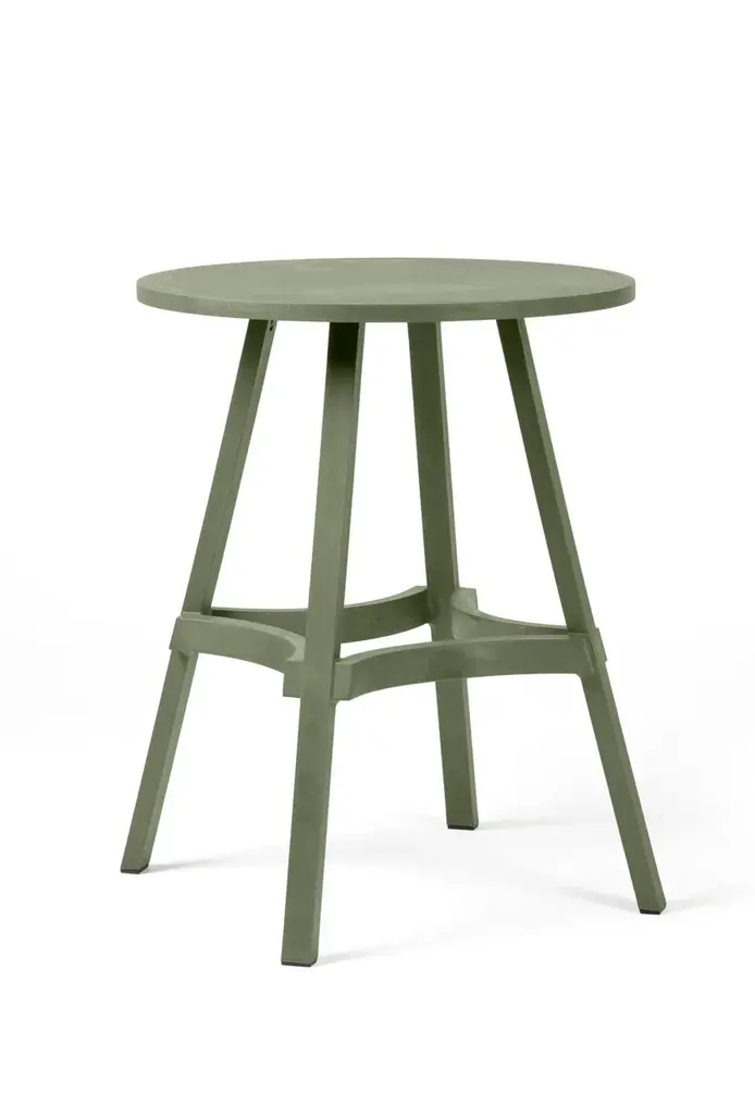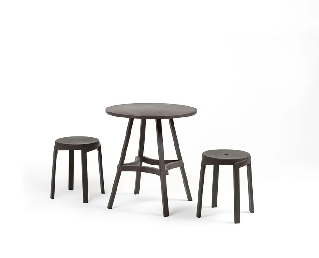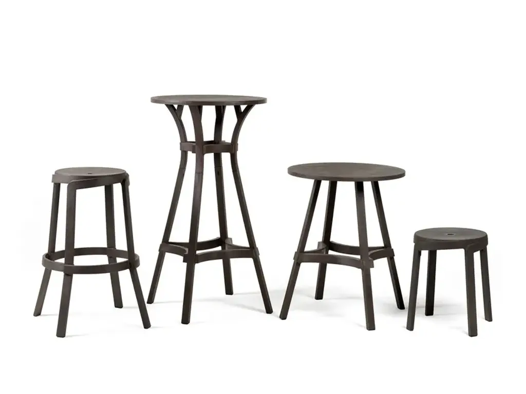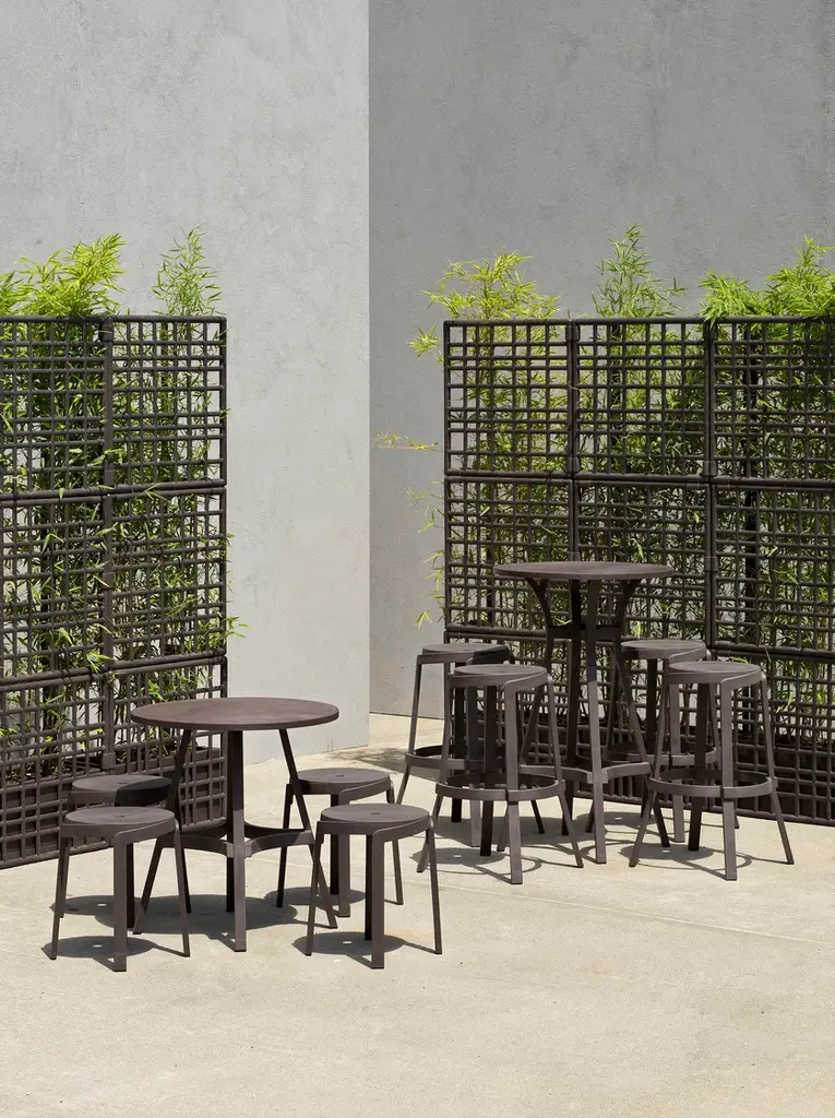 Combo is a table featuring straight lines and a round top.New colours for 100% eco-friendly outdoor furnitureA range of three new colours enhances the Stack and Combo collection of outdoor stools and tables made of recycled plastic, which is also 100% recyclable (the Nardi Regeneration industrial programme). The iconic colour Terra is now accompanied by new attractive colours, Gesso, Basalto and Cactus, which highlight intentional streaks and an opaque texture. This greater choice of colours, suiting contemporary tastes and designed for maximum versatility when it comes to using furniture, allows the inclusion of Stack and Combo arrangements in various contexts, from the most vintage to the trendiest.Texture and functionality Contemporary, smart and sustainable, the Stack and Combo collection includes functional designer stools and tables that are sturdy and ergonomic. They feature a linear shape and extra thick sections inspired by strips of wood.With their exceptional textured aesthetic, conceived to harmoniously integrate with contract environments, they are perfect for fitting out places such as bars, pubs and wine bars. The Stack stool, available in two versions with different seat heights - Mini and Maxi - has an innovative spiral design, allowing one stool to be stacked on top of another. It has a hole in the centre of the seat for easy handling and water drainage. By contrast, Combo, the table with a round top featuring straight and curved lines, can convert into a high table (Combo High) by adding an extension.The collection requires no special maintenance, is weatherproof and occupies little space when stored.Stack and Combo belong to the Regeneration industrial programme by Nardi, which uses regenerated plastic to produce outdoor furniture.The collection received the Green Good Design Award 2022 and the Prize Designs for Modern Furniture and Lighting® Award 2022.