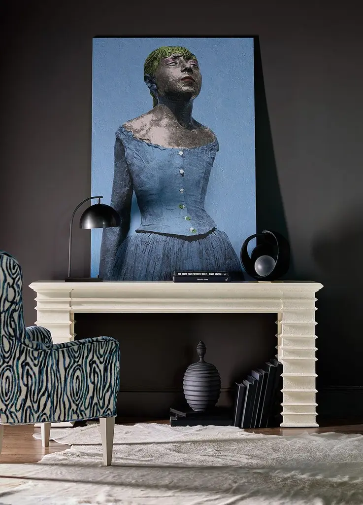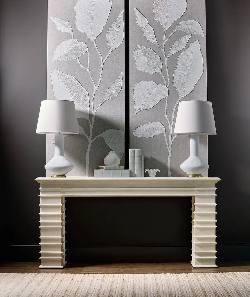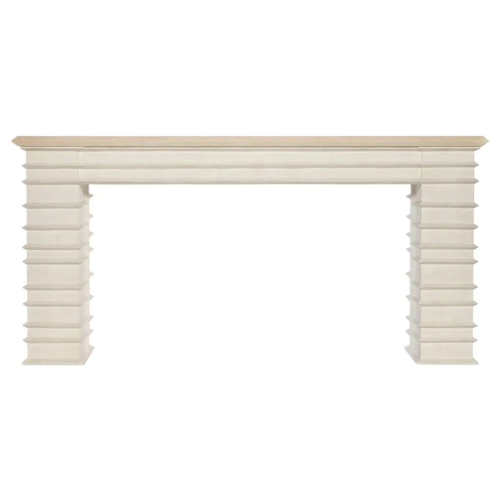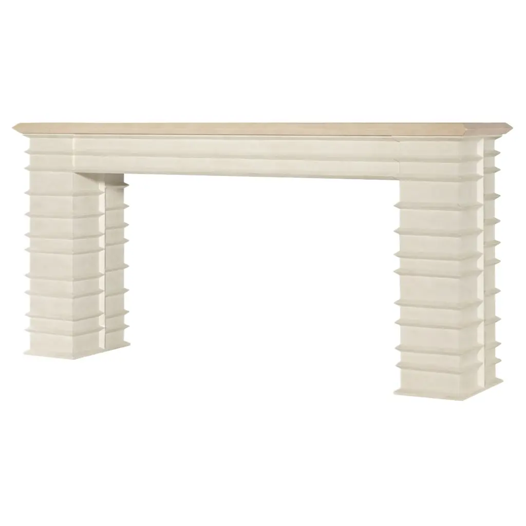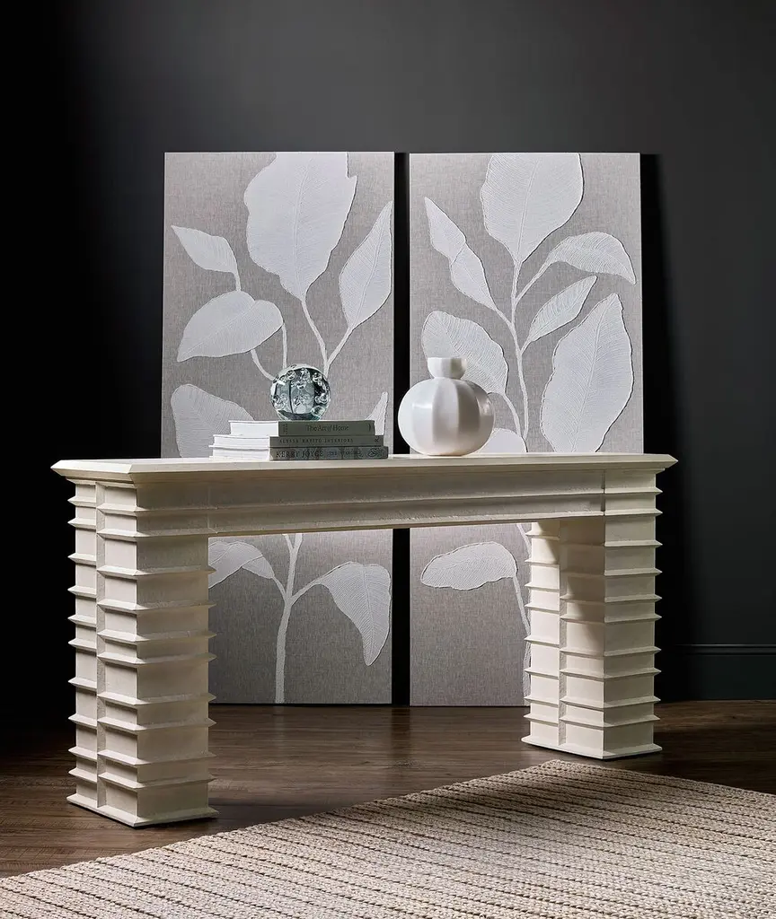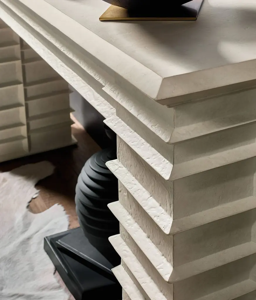 The Melrose Console Table is a statement piece with its textured plaster-like finish and tiered, ridge architectural design. This narrow console table is crafted from wood and resin, giving it a sturdy structure. The unique texture and modern design make it a standout in any room. Ideal for contemporary or minimalist spaces.