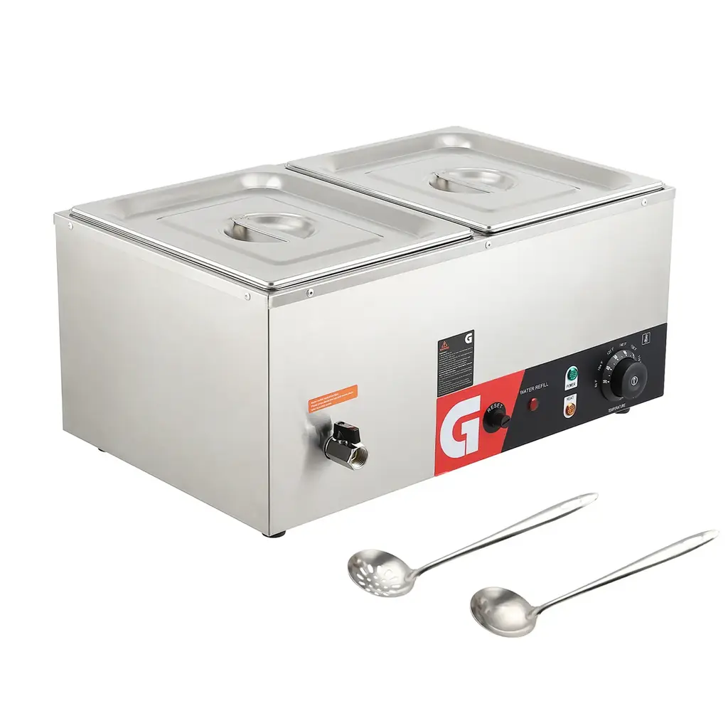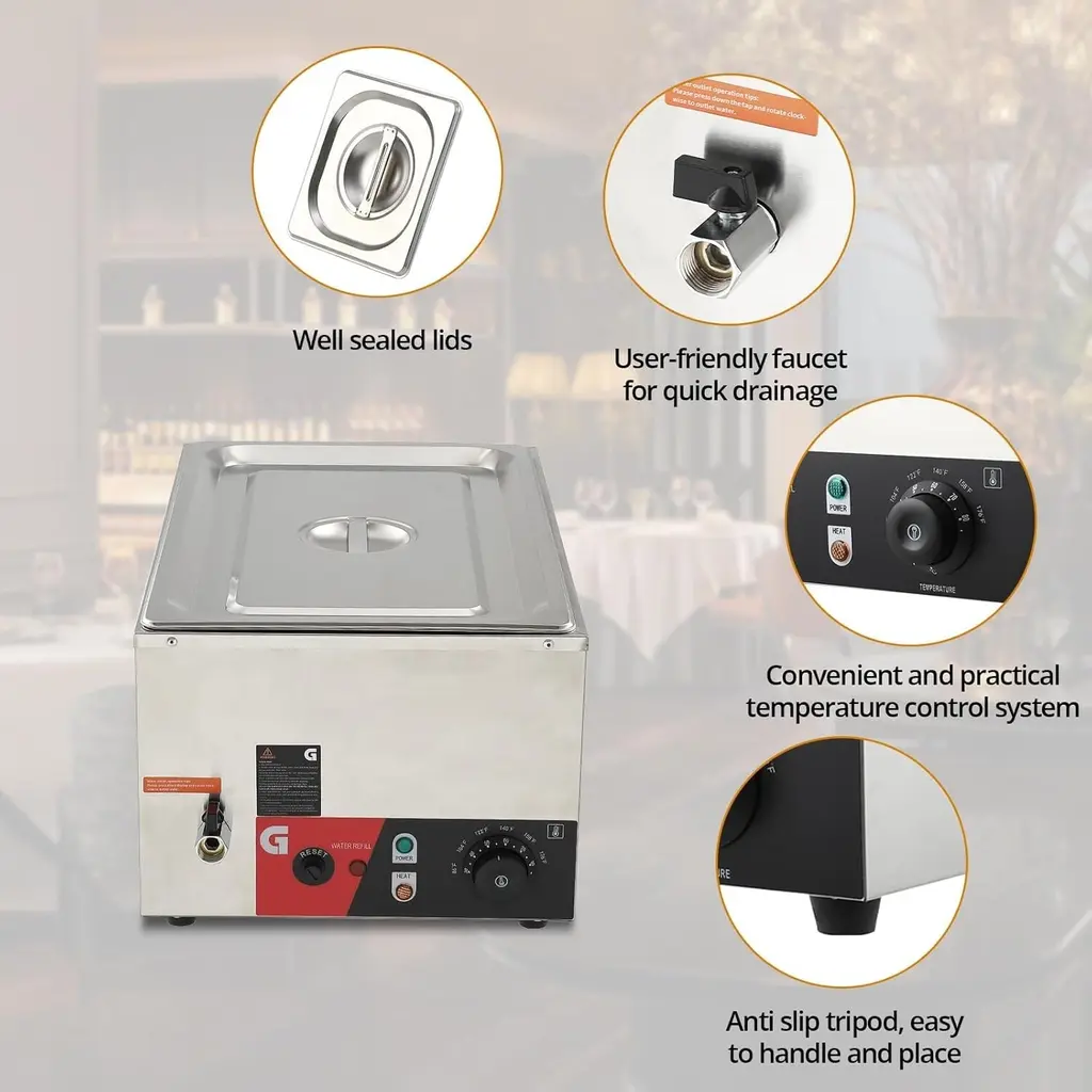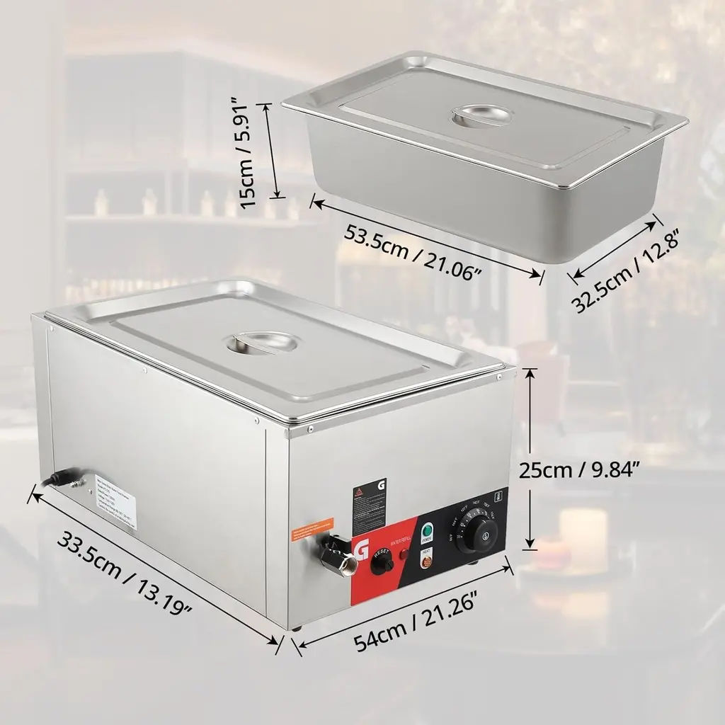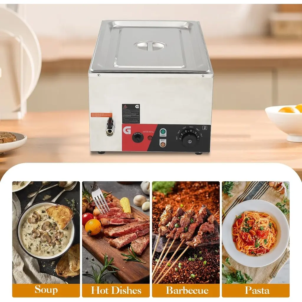 - **Generous Capacity**: This Commercial Food Warmer provides ample space with removable pans, perfect for serving a variety of dishes simultaneously, making it ideal for catering and restaurant use. - **Robust Stainless Steel Build**: Constructed from high-quality food-grade stainless steel, this rust-resistant warmer ensures long-lasting performance and easy maintenance, meeting all your commercial kitchen needs. - **Efficient Heating**: With a powerful 1200W heating , this electric steam table ensures even heat distribution and precise temperature control from 86-185°F, keeping your dishes consistently warm and ready to serve. - **User-Friendly Design**: Featuring a convenient drain tap for easy water drainage and removable pans for effortless cleaning, this versatile food warmer is designed for hassle-free operation and maintenance. - **Versatile and Safe**: Ideal for self-service environments, the food warmer includes a lid for flavor retention and enhanced safety features, making it a reliable choice for any commercial kitchen.