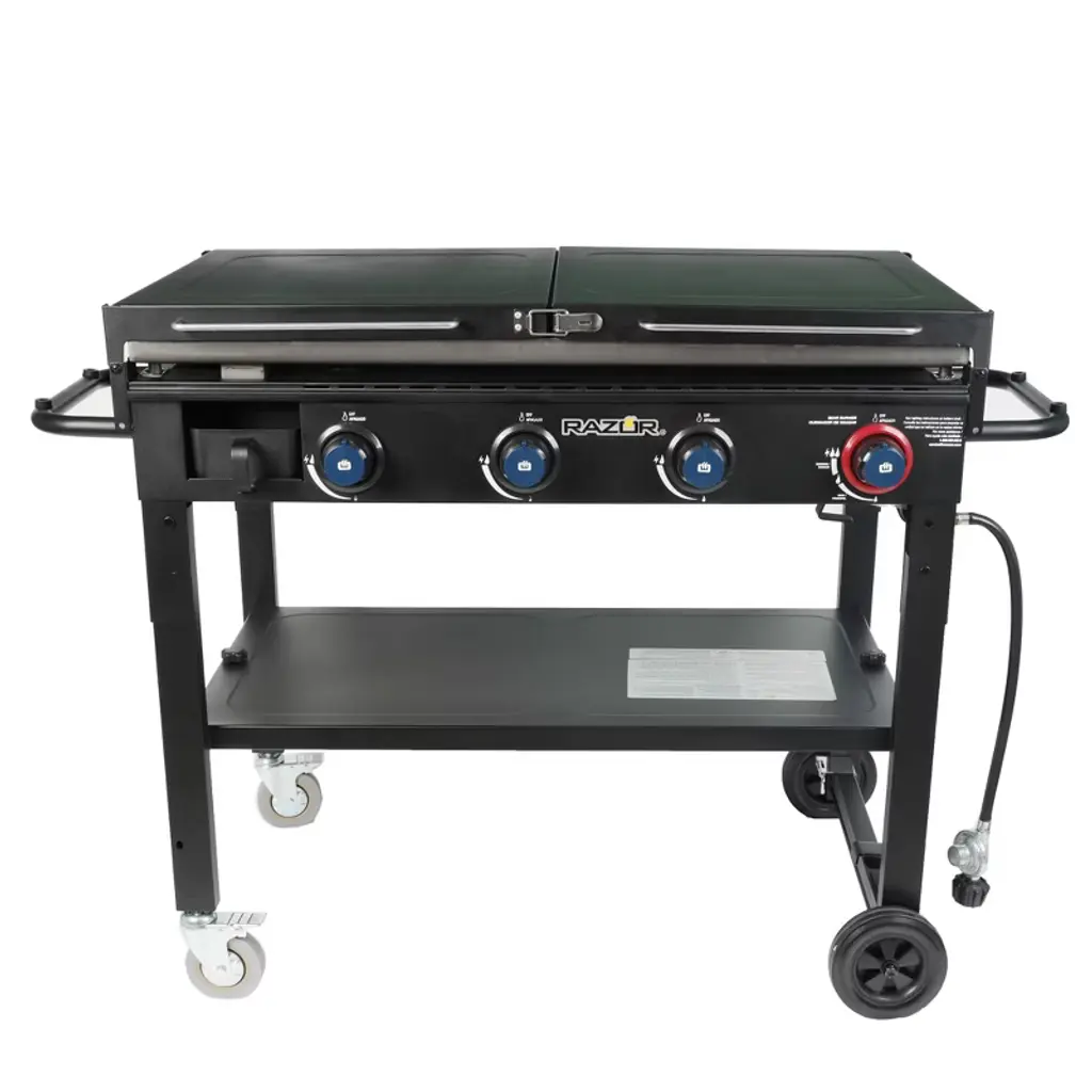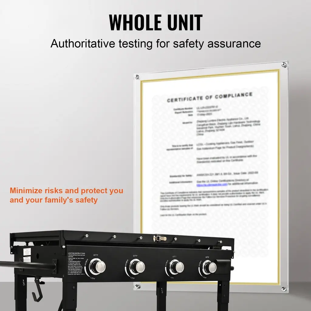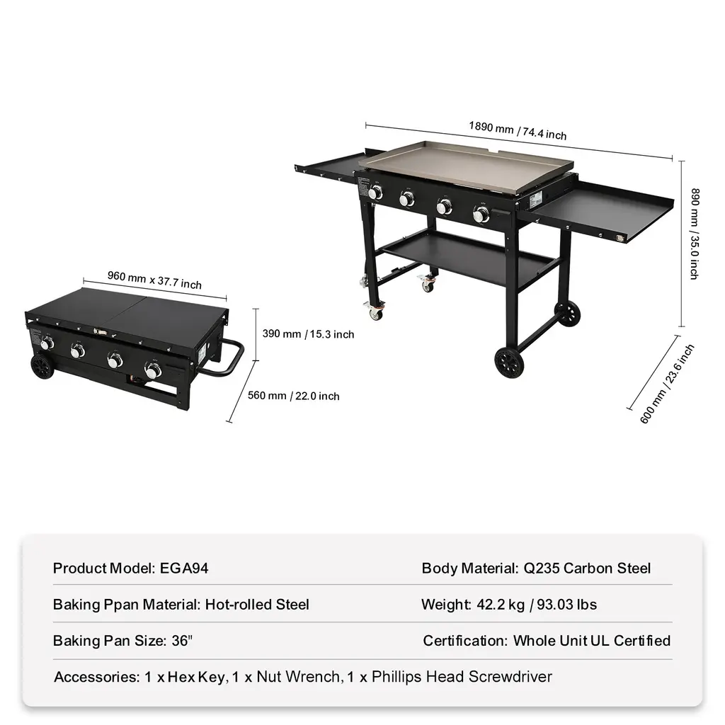 Multifunctional Folding Grill: The folding tabletop serves as both a storage space and a cover. This commercial flat top grill not only protects the grill plate from damage but also provides ample capacity to meet the needs of multiple people at parties. Suitable for camping, picnics, and outdoor gatherings, it upgrades your outdoor cooking experience. Convenient Mobility: With built-in wheels, our commercial flat top grill can be easily moved in the yard or outdoors. Unlike other folding grills, it can be dragged in the folded state, making it incredibly convenient when you're on the go. Just take it out of the trunk, and you're ready to move. Durable Material: The propane griddle flat top grill is made of hot-rolled steel, ensuring its durability. It comes with a layer of vegetable oil coating to prevent rust and ensure healthier and safer cooking. The burners are made of stainless steel, capable of withstanding high temperatures without deformation. Convenient Cooking: The 36" large grill plate, paired with 4 H-shaped burners, can accommodate multiple guests' culinary desires. The 4 burners allow for temperature control in different zones, providing a diverse cooking experience. User-friendly Design: Thoughtful details are designed to make your outdoor cooking experience more enjoyable. The drip holes direct excess oil, water, and residue towards the oil cup, and the oil collection system allows you to collect grease more effectively, relieving you from the hassle of cleaning. The one-touch pulse ignition ensures safer and simpler cooking, and the grill plate is coated with vegetable oil to prevent rust. Package Content 1 x Commercial Gas Grill 1 x Hex Key