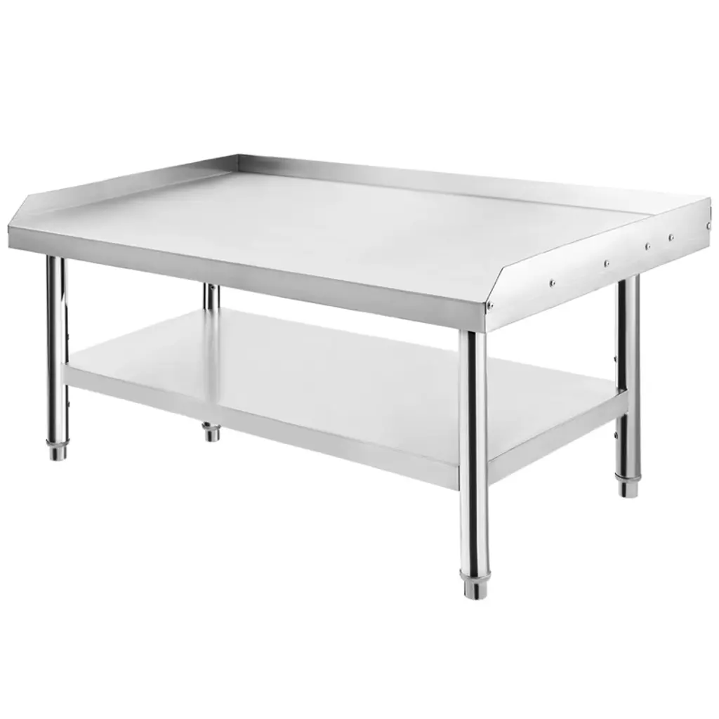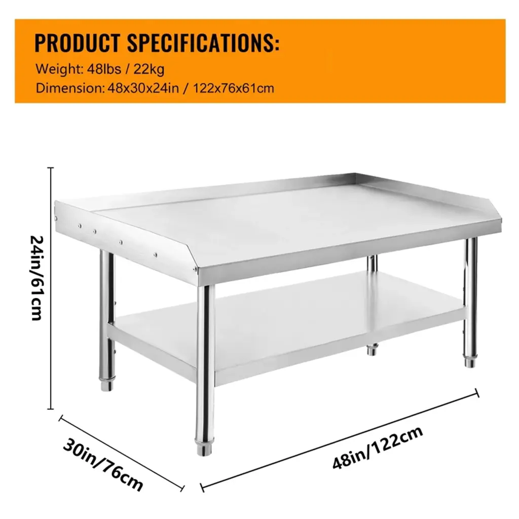 Commercial Stainless Steel Table & Heavy-Duty Equipment Stand with 1000 lb CapacityProduct Details:? Professional-Grade Stainless Steel Construction: Engineered for demanding environments, this equipment stand is crafted from commercial-grade 201 stainless steel. It features a durable 1.6mm thickness, a brushed #4 finish, and TIG-welded seams for superior resistance to corrosion, impact, and frequent cleaning. The non-porous surface ensures effortless sanitation and long-term durability in any professional or home kitchen.? Exceptional 1000 lb Load-Bearing Capacity: Designed to handle the heaviest commercial equipment with ease, the reinforced top shelf supports up to 1,000 lbs, making it ideal for large mixers, griddles, or refrigeration units. The versatile, adjustable bottom shelf provides an additional 220 lbs of capacity for storing pots, pans, and bulk ingredients, effectively organizing your workspace.? Advanced Stability and Spill Management System: Ensure safety and stability on any surface with industrial-grade, adjustable leveling legs. The continuous 2-inch spill containment baffle effectively controls leaks and messes, while rounded safety edges and high-traction, non-slip pads prevent equipment shift and minimize accident risks in busy kitchens.? Quick, Tool-Free Assembly with Protective Packaging: Designed for immediate use, this stand includes all necessary hardware and clear instructions for a straightforward, tool-free assembly. It arrives with protective film and foam padding to prevent scratches and damage during shipping, ensuring it is ready for service right out of the box.? Versatile for Diverse Culinary Applications: A perfect fit for a wide range of settings, this stand serves as a heavy-duty work table in restaurant kitchens, a stable equipment stand in food trucks, a versatile utility table for hotel catering, or a robust outdoor prep station for large-scale grilling and events.Specifications:? Product Dimensions: 48" L x 30" W x 24" H? Material: 201 Stainless Steel (1.6mm thickness)? Top Shelf Load Capacity: 1,000 lbs? Bottom Shelf Load Capacity: 220 lbs? Special Features: Adjustable Leveling Legs, 2-Inch Spill Containment Baffle, Non-Slip Pads, Rounded Safety Edges