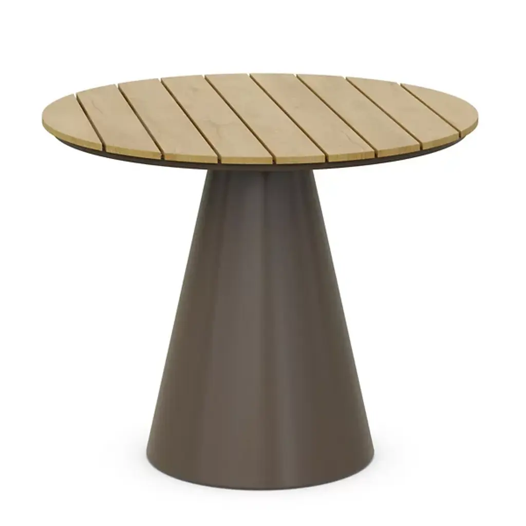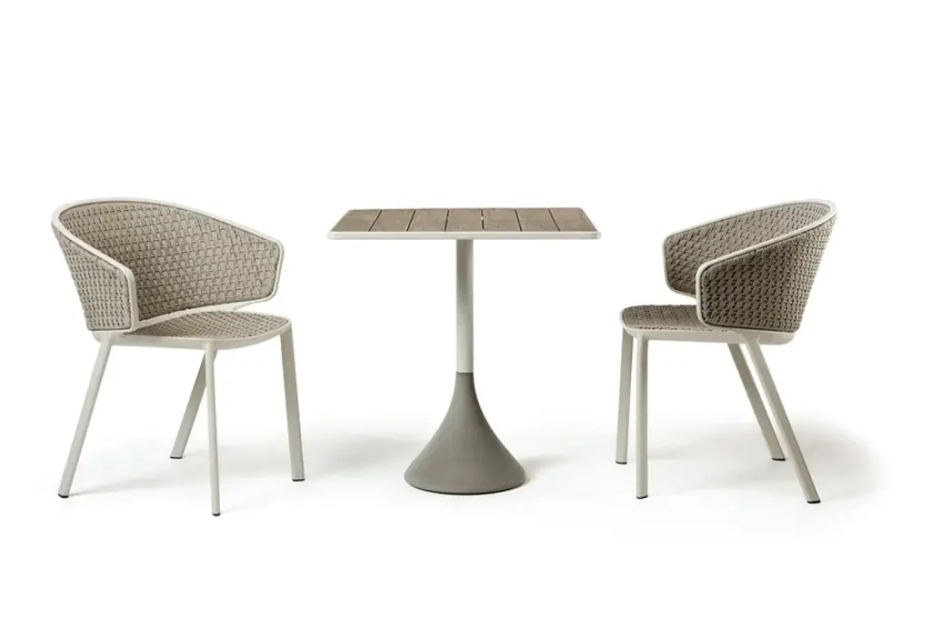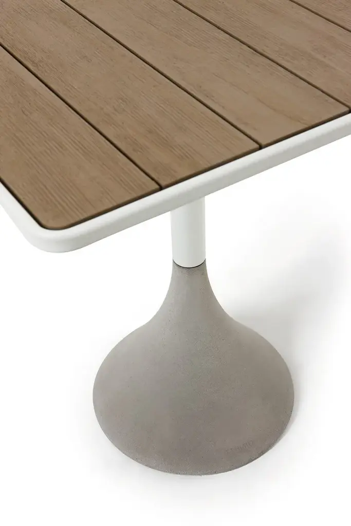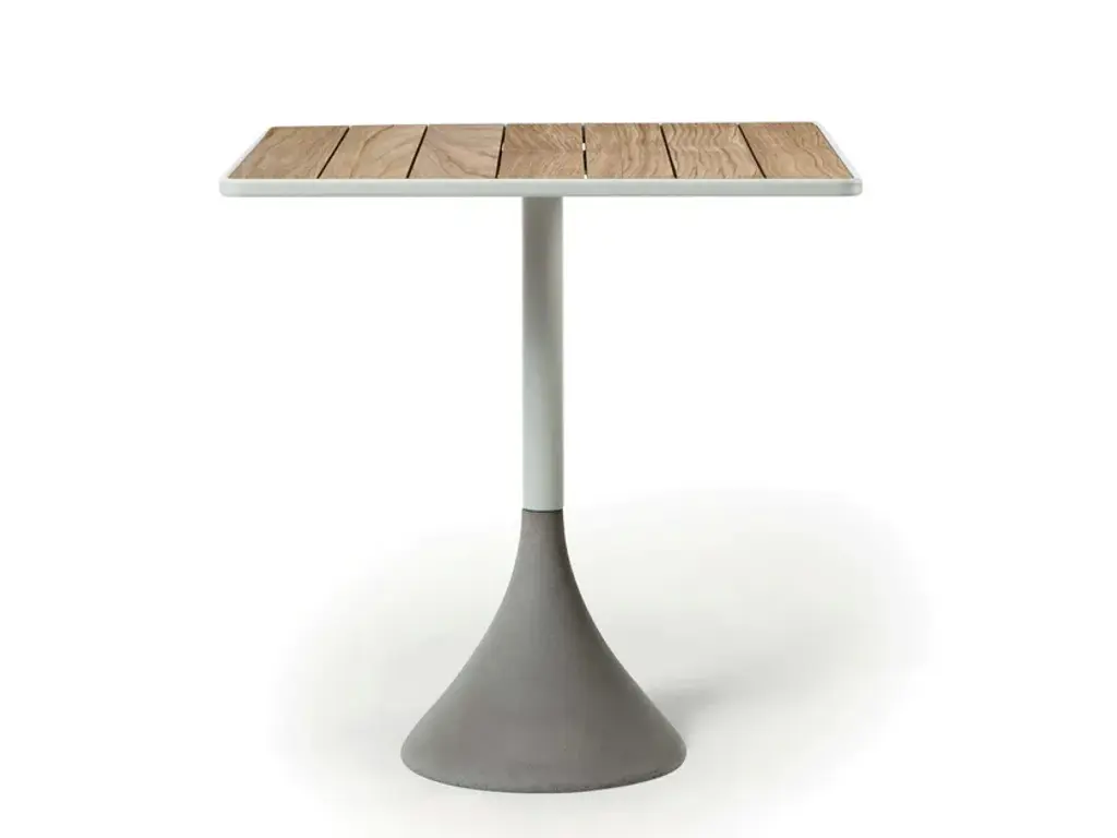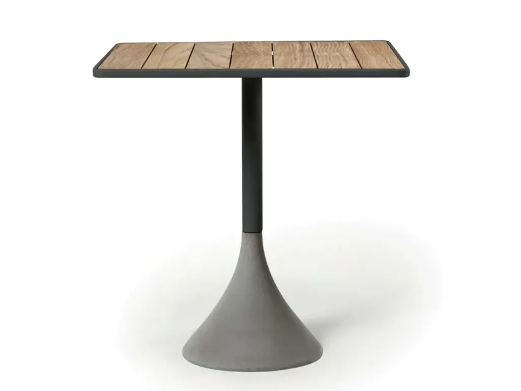 Table with concrete base and alumium. Teak or laminate top.A name that expresses the minimal shape and ‘substance’ of this new line of tables designed to furnish contract and contemporary hotel settings for guaranteed comfort, functionality and quality. Concreto tables, with their solid cement base, have an aluminium structure and tops in either teak or a black ceramic finish, available in both round (60Ø cm and 70Ø cm) or square versions (60x60 cm and 70x70 cm). The tables also come in two different heights (74 cm and 105 cm), with tops for the taller version (perfect with the stools) available either round (60Ø cm or 70Ø cm) or square (60x60 cm or 70x70 cm).The Concreto collection reflects the distinguishing features of ‘tailored’ design, its available variants ensuring it meets very diverse and often complex furnishing needs in the hospitality sector and meaning it can ‘accompany’ seating in different styles and sizes.Concreto tables offer across-the-board go-to solutions that are an ideal easy fit in a wide range of outdoor settings that include residential.