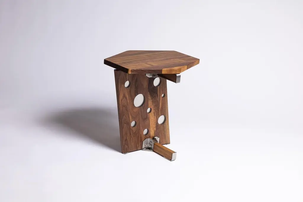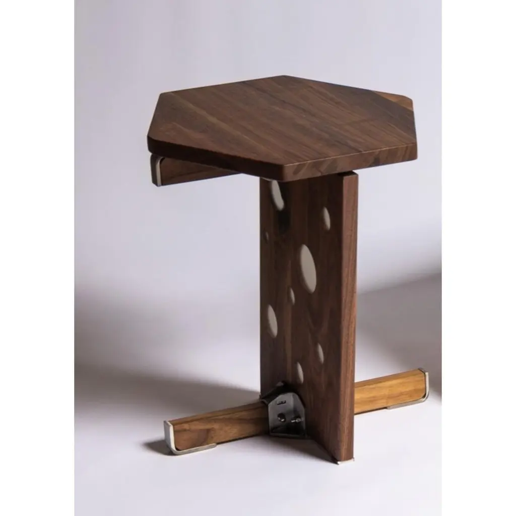 Console Side Table by Konstantin Achkov StudioLimited EditionDimensions: D 45 x W 38 x H 45 cm.Materials: American walnut wood, epoxy resin, and stainless steel.Konstantin Achkov is a leading Bulgarian sculptor. He has been developing the idea of applicability of tensegrity structures in furniture, especially in chairs, for nearly twenty years. With two scientific papers in progress and international recognition for his contribution to the subject by its discoverer Kenneth Snelson and other leading scientists in the field, it can be said that tensegrity is one of the greatest themes of his life!With explicit originality in his designs not only at the structural level but also in the overall form, the tensegrity structures created by the author surprise the viewer with the scene of solid elements supported in space by a complex geometric network of tense ropes. A sense of impossible levitating elements is created! A clear view of loaded and stressedparts by pre-stressing the structure. Another characteristic of these structures is the intelligent spring system that always returns to its original shape. This allows the chairs to be flexible by responding ergonomically at the backrest or the base to the user's weight. In this way, they become active systems moving parallel to the person sitting on them. On the other hand, the complexity of conceiving and building tensegrity has given impetus to categorize them as minimalist sculptures with levitating elements from the very beginning.