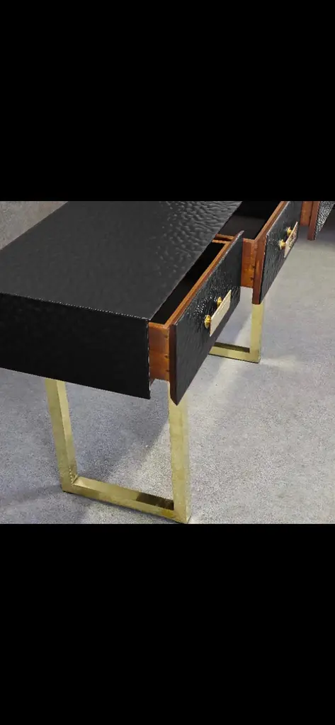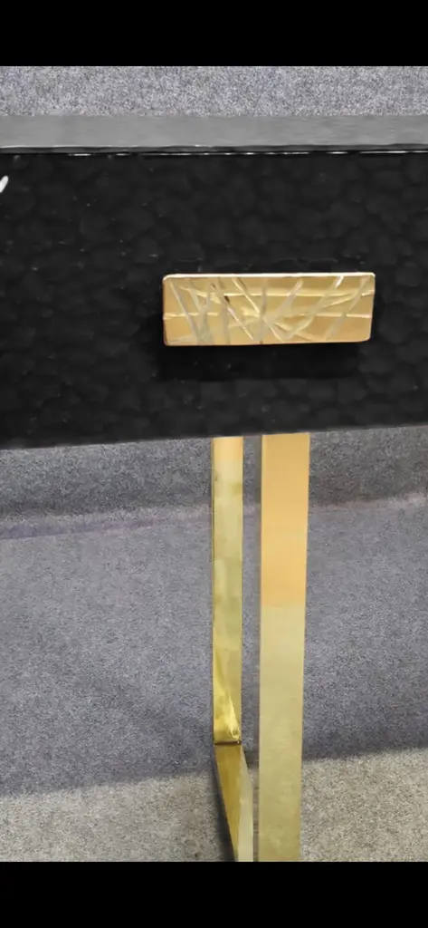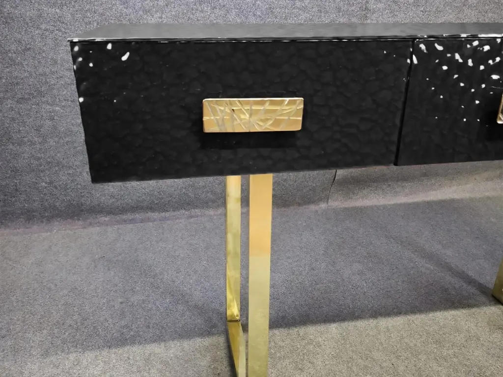 A Masterpiece of Elegance: The Black Murano Glass Console by JustFurnituressAt the heart of Italian design, JustFurnituress presents an entry console that is more than just a piece of furniture: it is a statement of style and sophistication. This extraordinary console in black Murano glass is a work of art that embodies the essence of mid-century modernism, perfectly crafted to enrich any environment with its imposing presence.Constructed from solid birch wood, the console features a beveled Murano glass top adorned with hand-painted and carved details that testify to the skill of Italian artisans. Every element has been created with meticulous attention to detail, from the handcrafted soldered brass components to the elegance of the brass legs, which add a touch of luxury to the already refined design.The combination of black glass and velvet accents not only attracts attention but also brings a sense of warmth and welcome, making this console the ideal piece to greet guests in an entryway or to elevate an elegant living room. Its durable structure and impeccable finish ensure that this piece is not only beautiful but also functional.Showcased during Milan Fashion Week, this console is not just a piece of furniture but a symbol of prestige and collector's value. With its classic aesthetics and exclusive design, it represents a perfect balance between tradition and innovation, making it a must-have for lovers of luxury and contemporary design.If you are looking for a piece that can elevate your space and reflect your impeccable taste, this black Murano glass console by JustFurnituress is the ideal choice. A true masterpiece that promises to capture the eyes and hearts of anyone who enters your home.