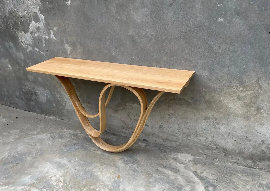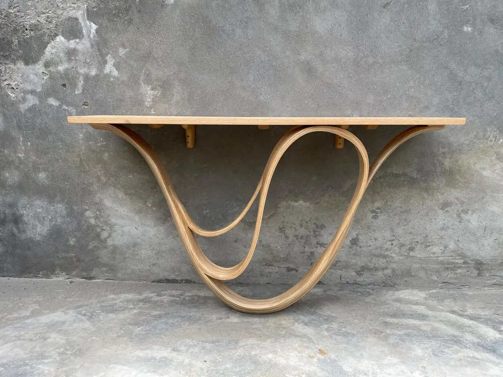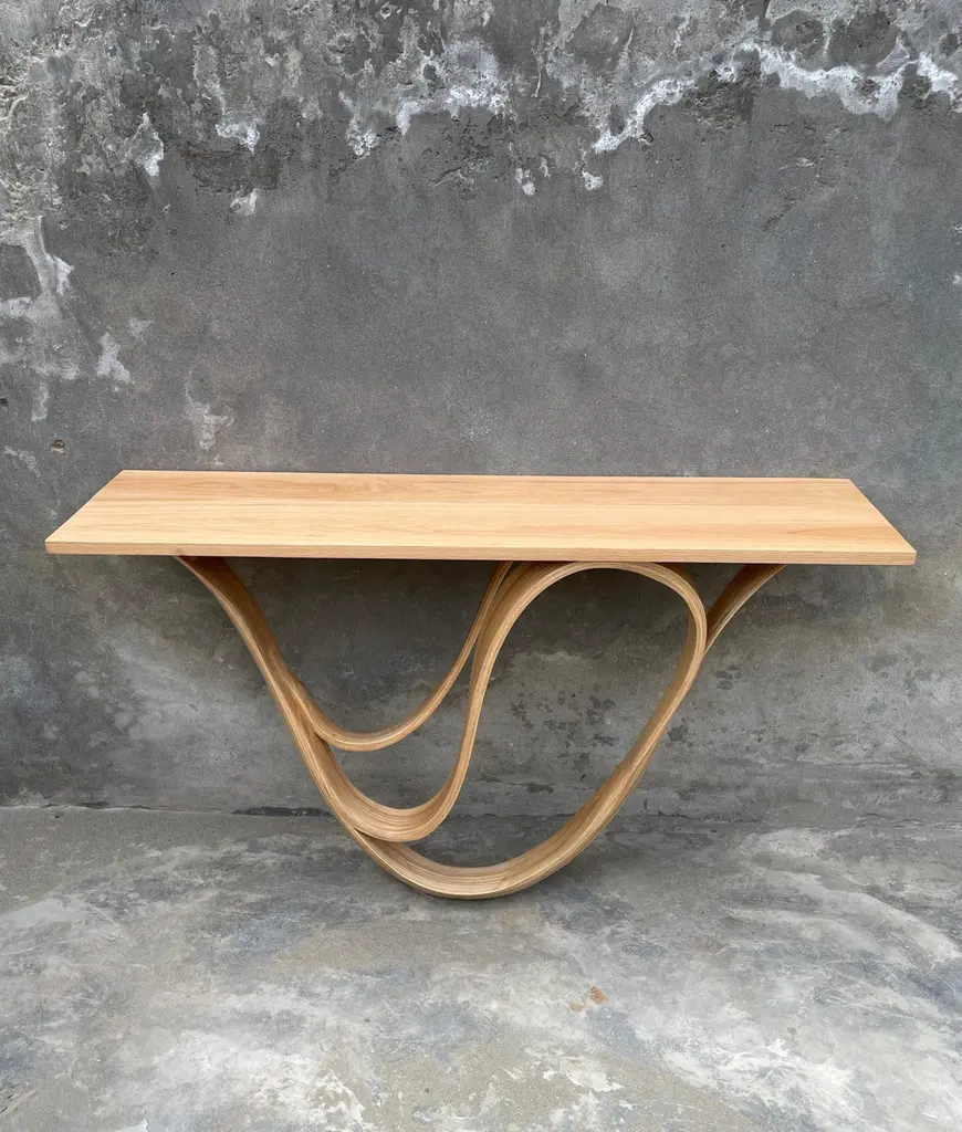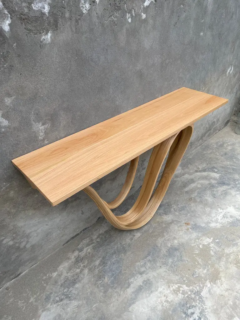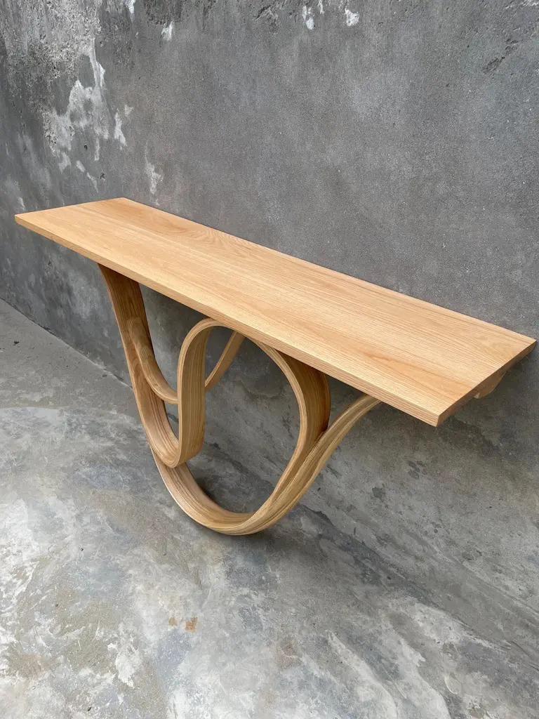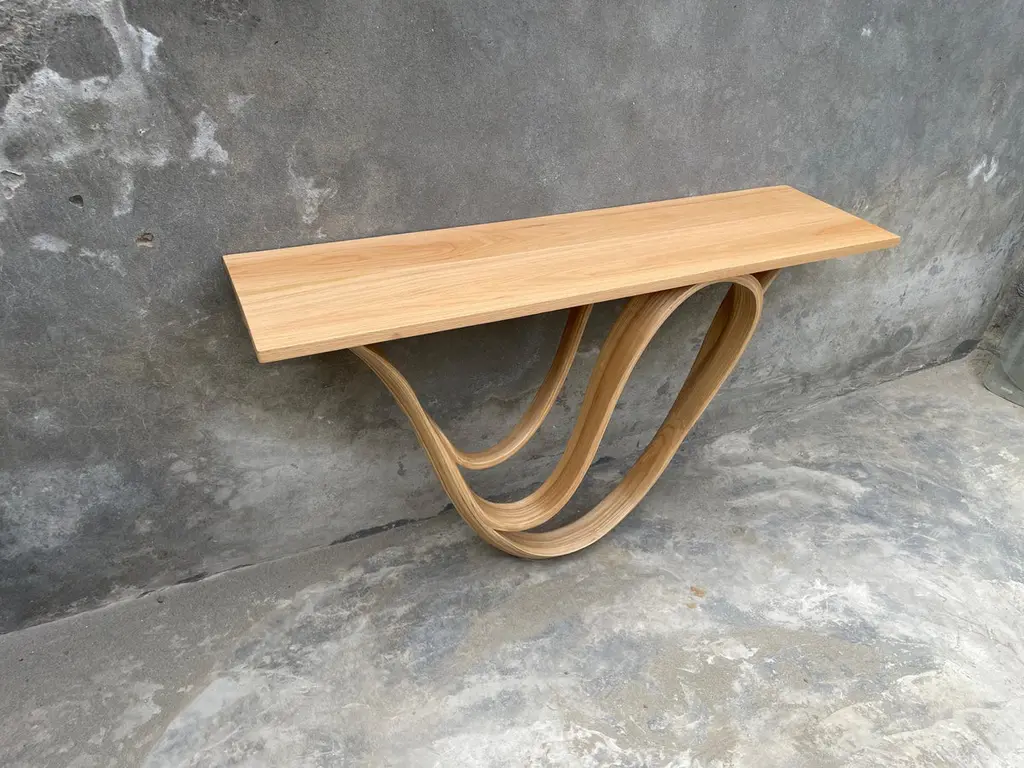 The Console Table No. 5 of the Fluentum Series, derives its design from the Studio’s Working Desk No.1 and was a custom design for a client’s space. The piece is made in red oak and has been shown in a clear lacquer finish and also a light brown finish. The Studio has taken its exploration of wood further with the Fluentum Series. This Series uses techniques and skills learned over the years to create works that embody details that are unique to the Studio's design aesthetic and the craft of bending wood. These techniques allow the natural flow of the wood to take the reins of design; therefore, no two pieces are exactly the same, making each piece unique.Other points worth knowing:- The design may vary slightly from the piece in the pictures since each piece is handmade.- You can choose from an array of finishes.- The dimensions of the piece are customizable.