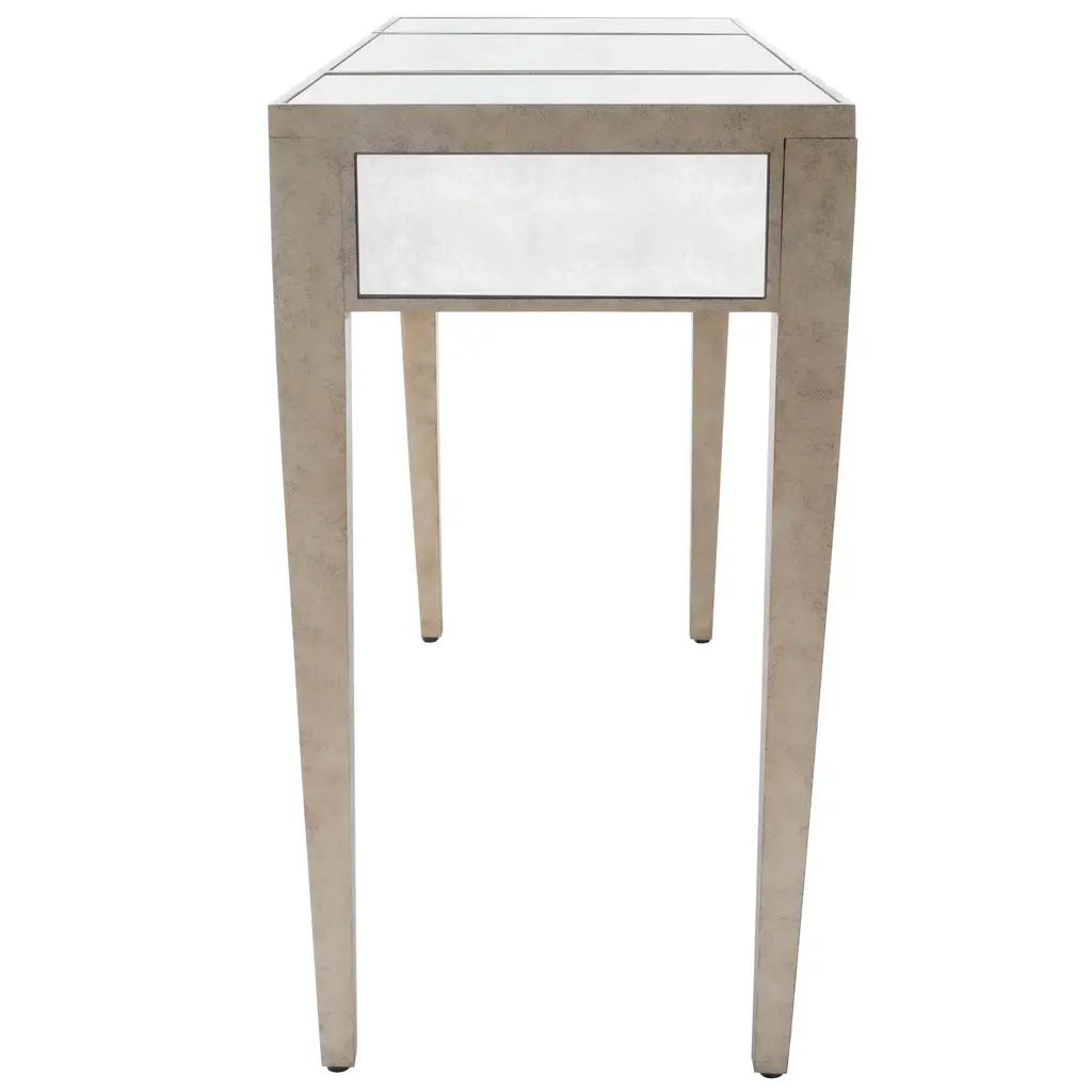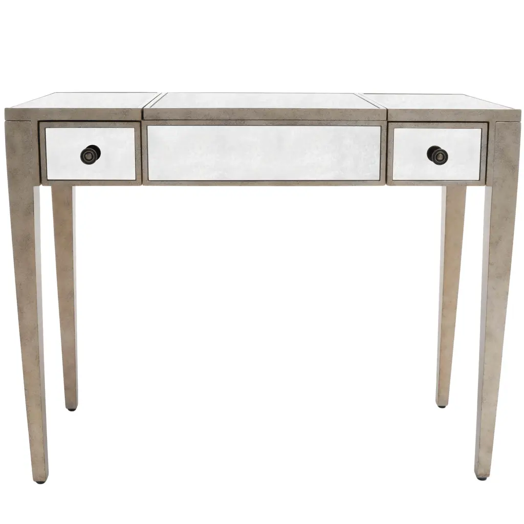 Trimmed in antique pewter and crafted from Birch Wood solids, this mirrored vanity adds a beautiful touch of class to any space! The right and left drawers are a great place to tuck away your treasures; the center compartment opens to reveal storage and a soft felt lining. Durably Constructed With: Birch Wood Solids, MDF, Antique Mirror Glass, Steel Product Construction Features: Finish Distressing Product Assembled Measurement & Weight: 30.5" H x 40.0" W x 18.0" D -- 71.0 lbs. 50 lbs. Suggested weight capacity Item Arrives: Needs Assembly Photo may slightly differ from actual item in terms of color/finish due to the lighting during photo shoot or the monitor's display.