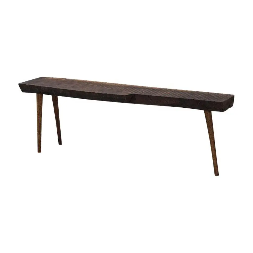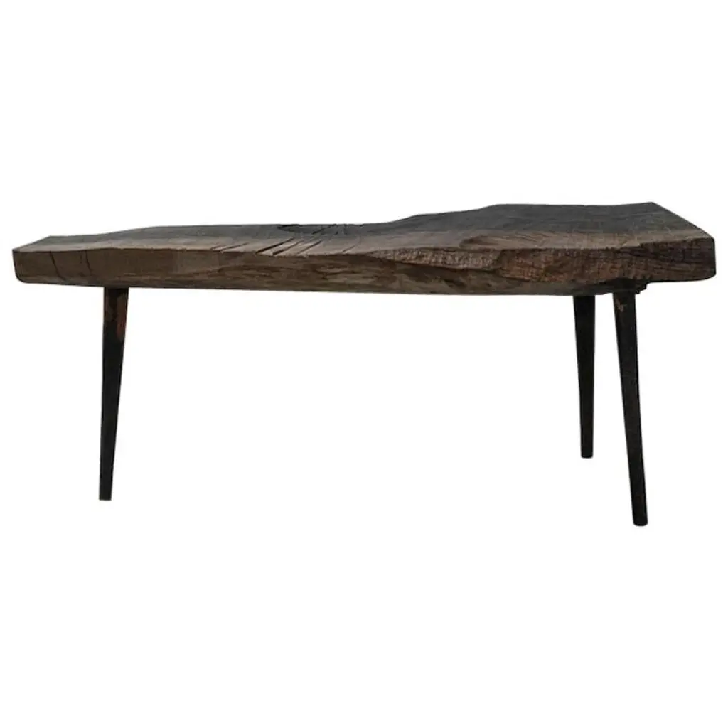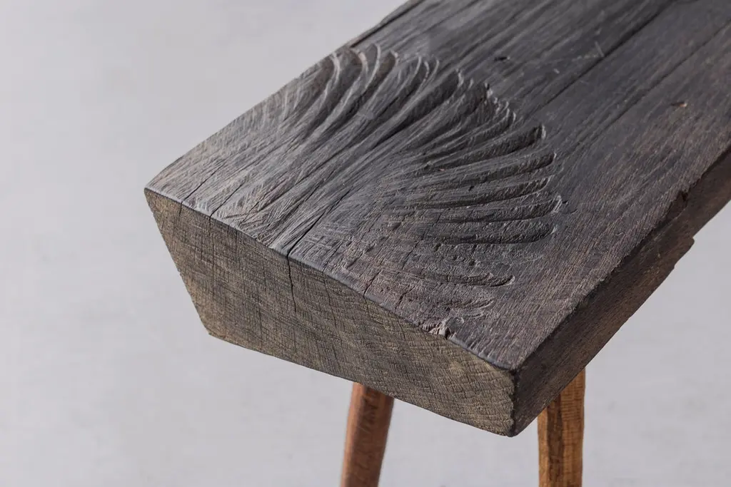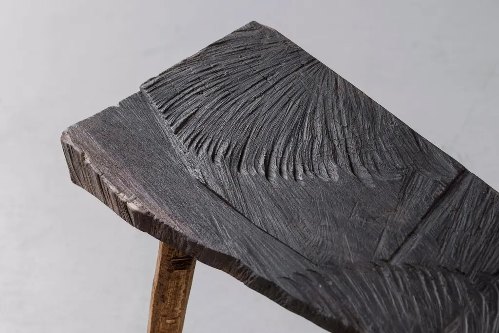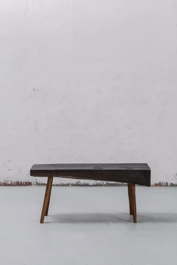 Small table made of solid oak (+ linseed oil)Measures: 50 x 112 x 45 cm.SÓHA design studio conceives and produces furniture design and decorative objects in solid oak in an authentic style. Inspiration to create all these items comes from the Russian North aesthetics with its severe nature, log huts black from time and climate and scant patterns. Wood is masterfully hand processed with chainsaw or chisel, whereby producing beautiful surface patterns. The wood is soaked in boiling baths of linseed oil, creating this special patina and making each creation a very unique piece. Reacting with tanning substances under high temperature, oil gives the objects expressive and natural colours, from light brown to charcoal-black. SÓHA offers a vast array of neo-primitivist interior objects. Our kitchen utensil, wall panels, sculptures and furniture solutions are executed in one unique style and will organically fit into the interior of your home. Each piece is one-of-a-kind handmade product.Unique piece made to order.