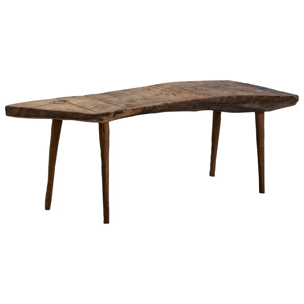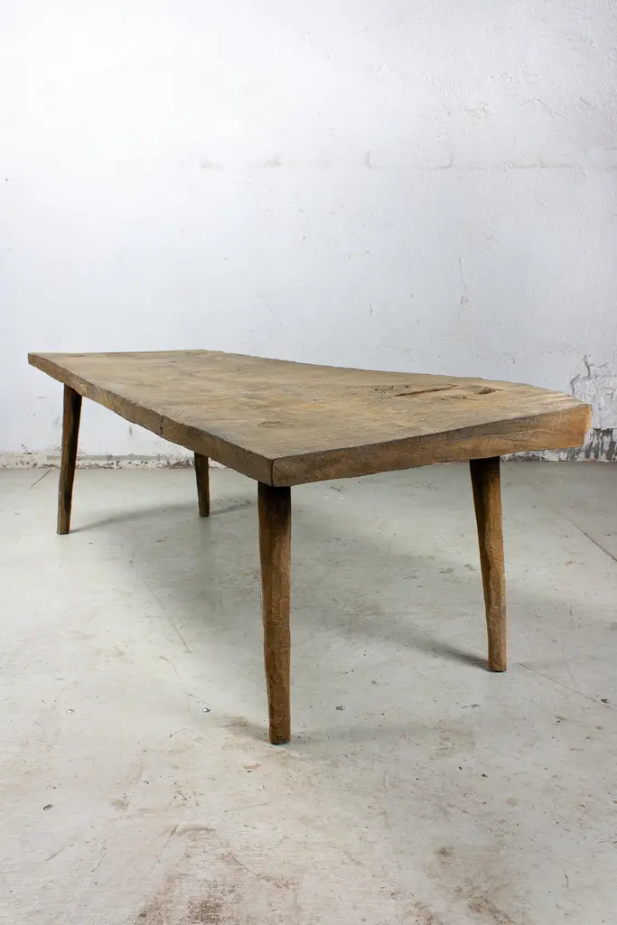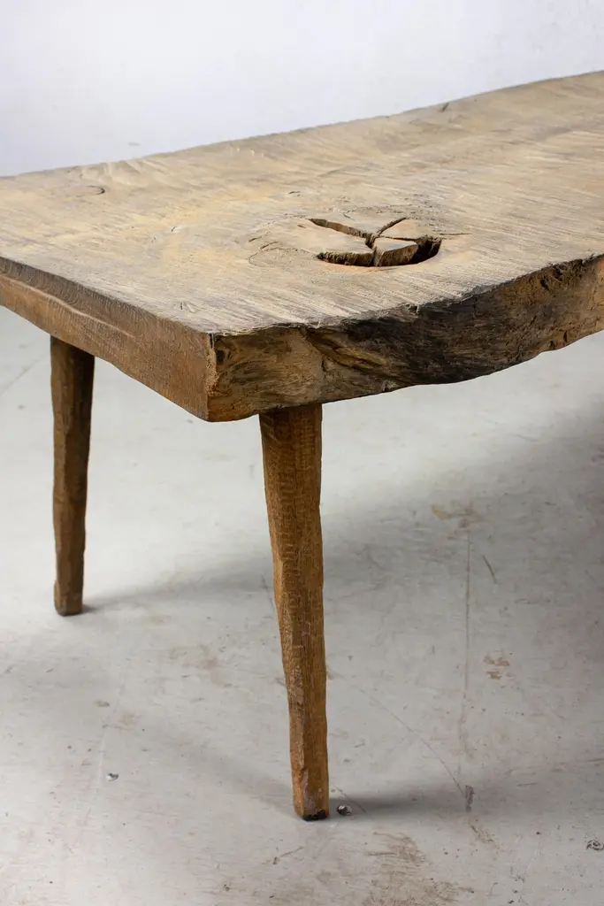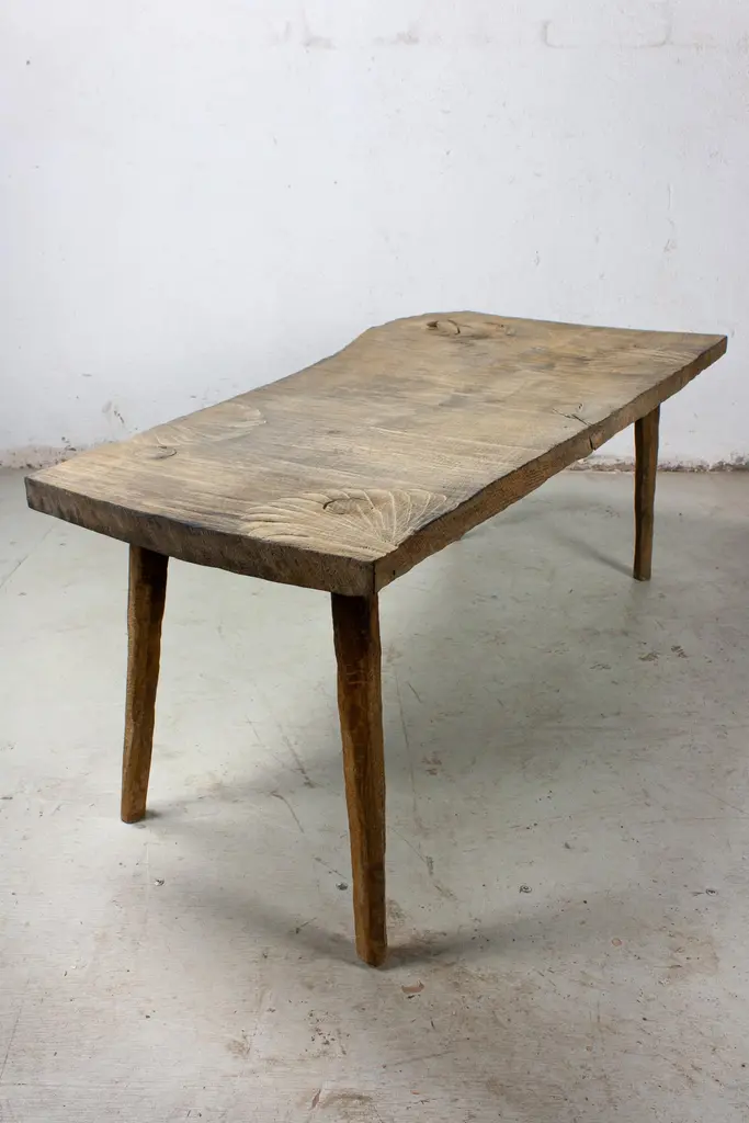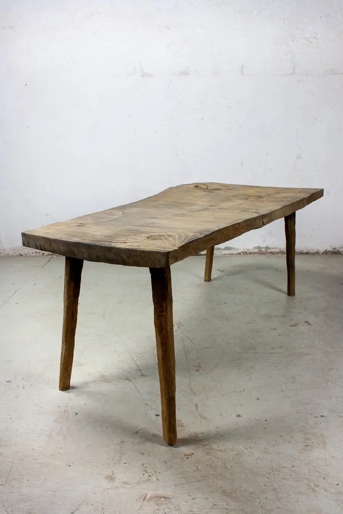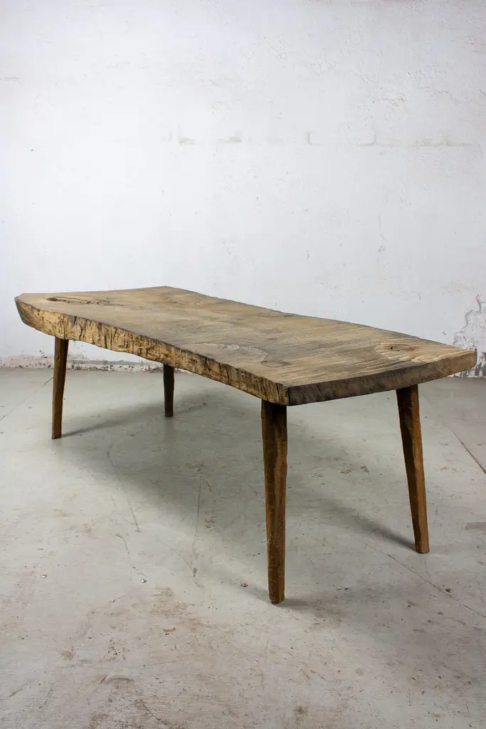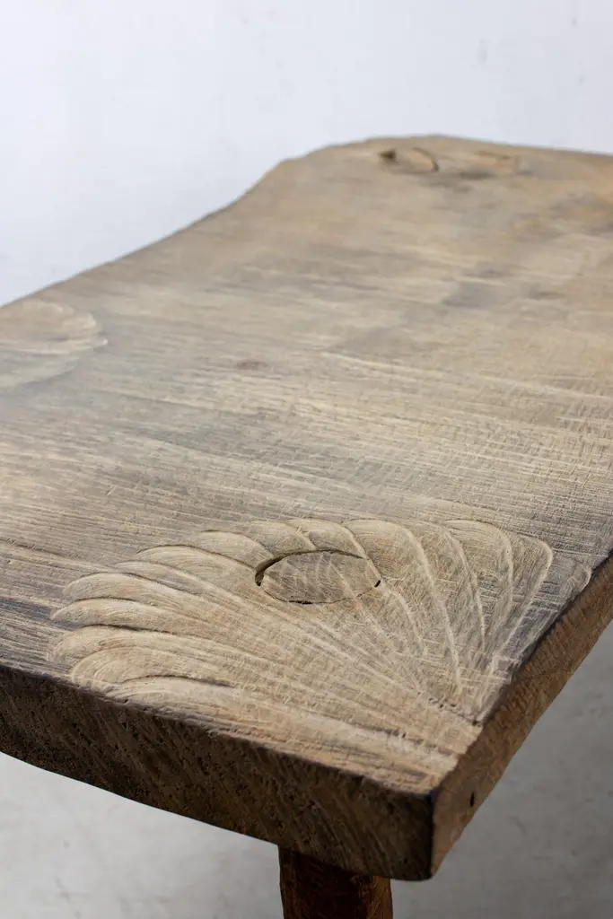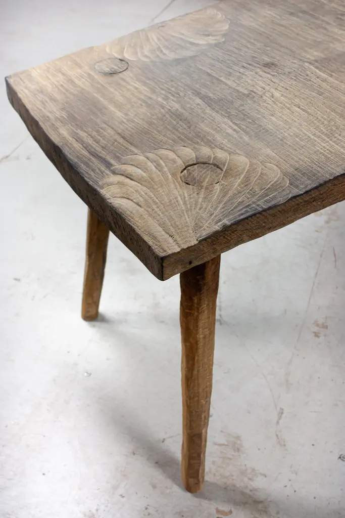 Small table made of solid oak (+ linseed oil)Measures: 50 x 123 x 45 cmSÓHA design studio conceives and produces furniture design and decorative objects in solid oak in an authentic style. Inspiration to create all these items comes from the Russian North aesthetics with its severe nature, log huts black from time and climate and scant patterns. Wood is masterfully hand processed with chainsaw or chisel, whereby producing beautiful surface patterns. The wood is soaked in boiling baths of linseed oil, creating this special patina and making each creation a very unique piece. Reacting with tanning substances under high temperature, oil gives the objects expressive and natural colours, from light brown to charcoal-black. SÓHA offers a vast array of neo-primitivist interior objects. Our kitchen utensil, wall panels, sculptures and furniture solutions are executed in one unique style and will organically fit into the interior of your home. Each piece is one-of-a-kind handmade product.Unique piece made to order.