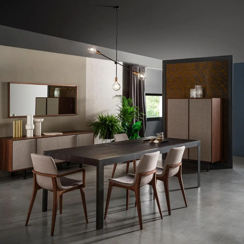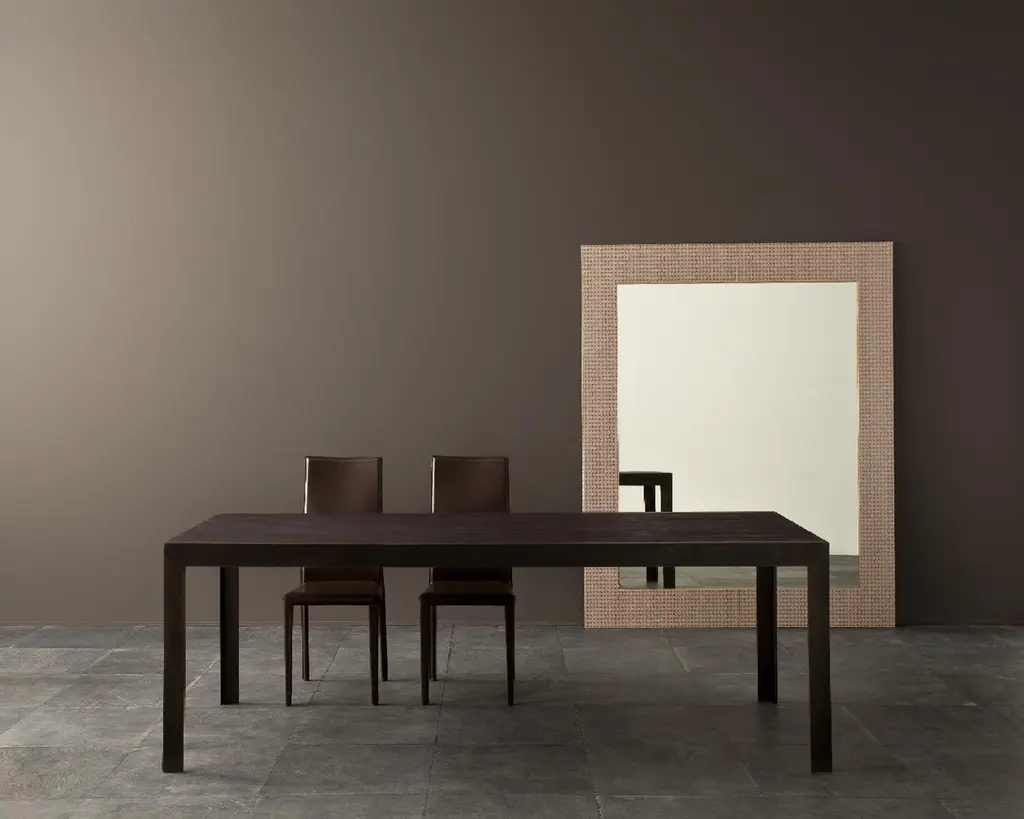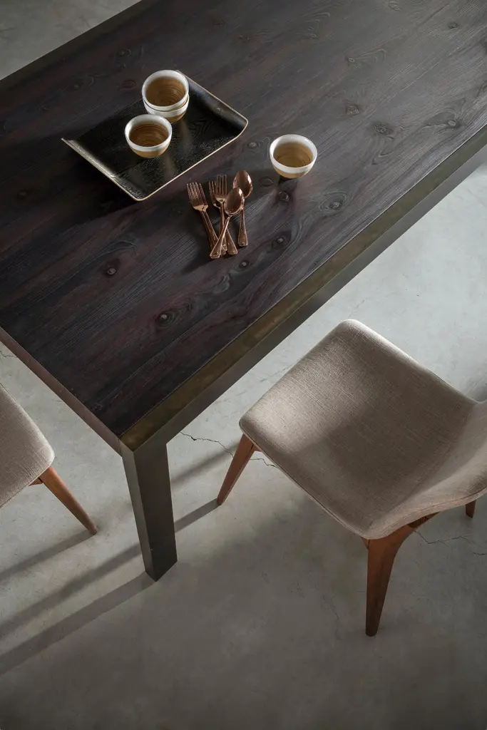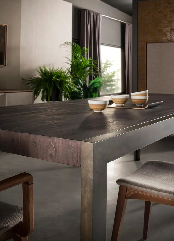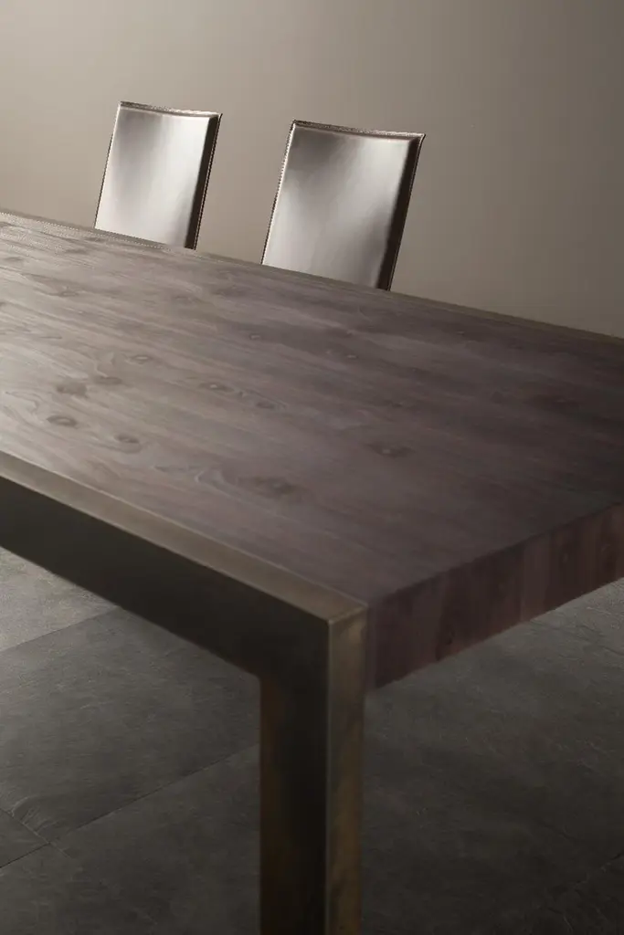 A minimalist design in which raw metal and ultra-matt finished wood complement each other to the full, giving great real character.Detail of great table with metal legs in the 085 Burnished finish and woodfinished top in 103 Black Cypress.
