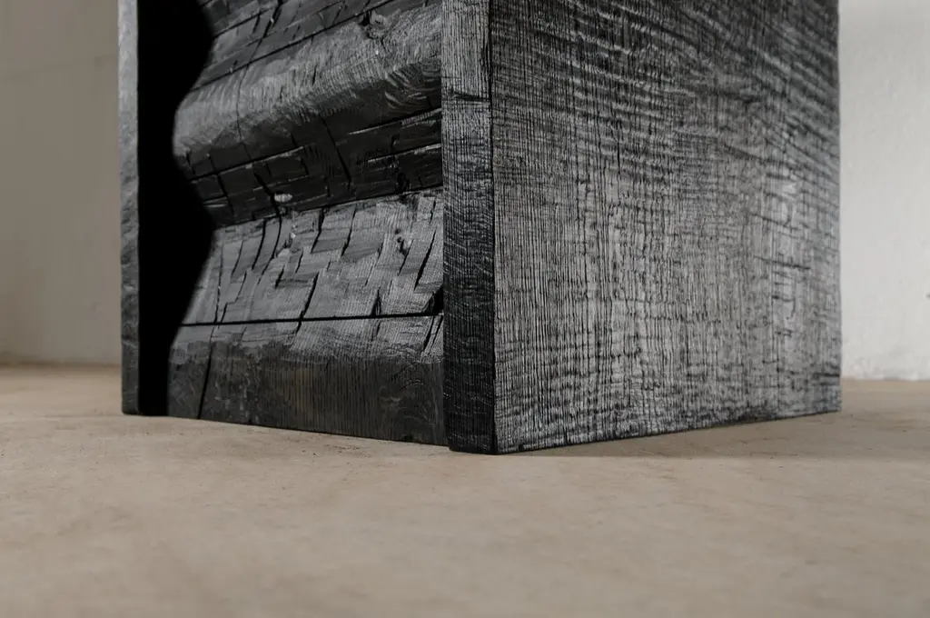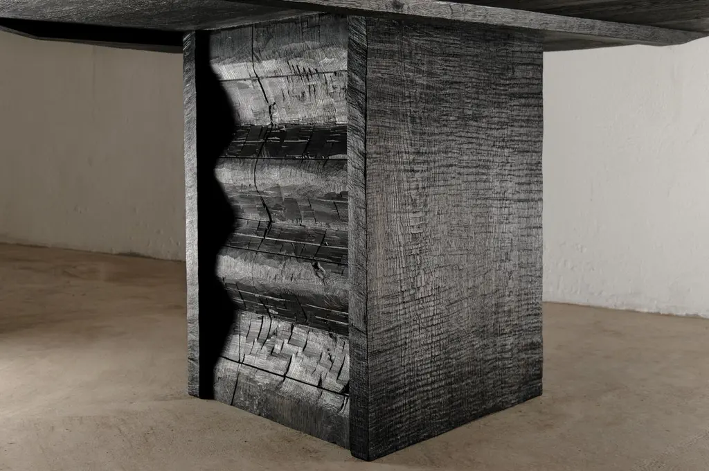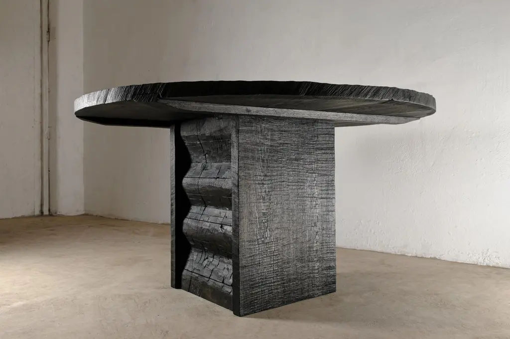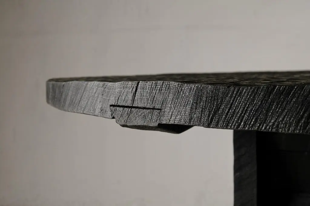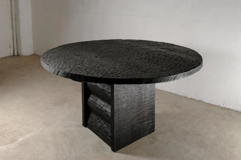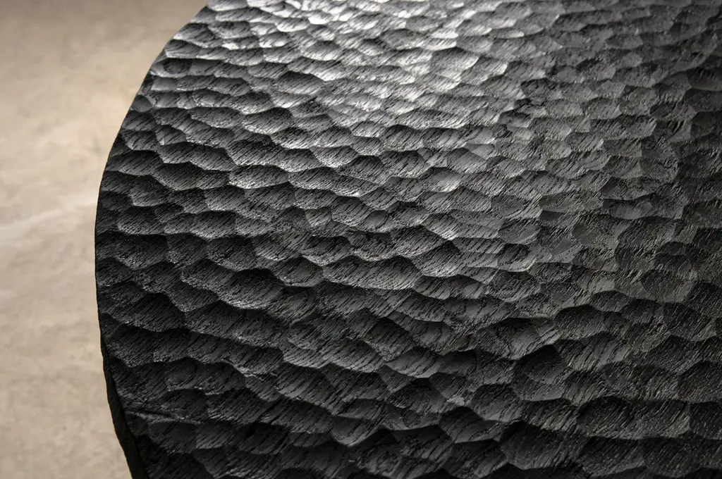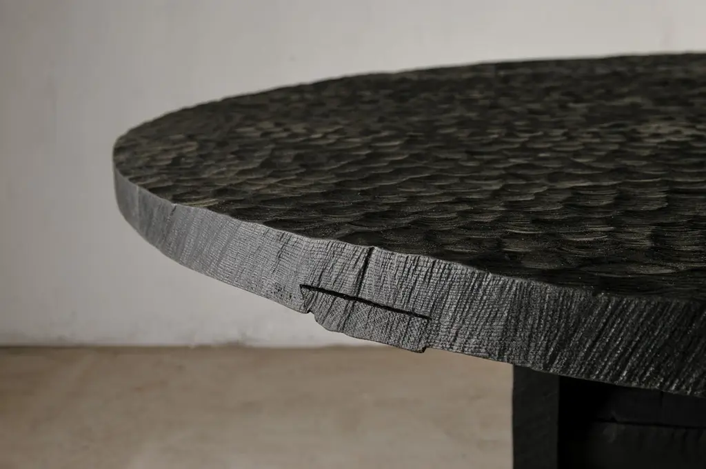 Contemporary carved round table in solid oakwoodDimensions: Height: 74 cmDiameter : 160 cmUnique piece made to order.Founded by artist Denis Milovanov, SÓHA design studio conceives and produces furniture design and decorative objects in solid oak in an authentic style. Inspiration to create all these items comes from the Russian North aesthetics with its severe nature, log huts black from time and climate and scant patterns. Wood is masterfully hand processed with chainsaw or chisel, whereby producing beautiful surface patterns. The wood is soaked in boiling baths of linseed oil, creating this special patina and making each creation a very unique piece. Reacting with tanning substances under high temperature, oil gives the objects expressive and natural colours, from light brown to charcoal-black.-----The designer was born on April 25, 1975, in Moscow. He studied woodworking at the 303 Higher Technical School in 1990-1993. In 2012 Milovanov established DENIS MILOVANOV workshop where he created design-art objects and the functional kitchen utensils series. In 2016 he established the SÓHA brand.