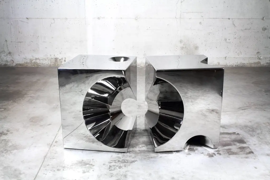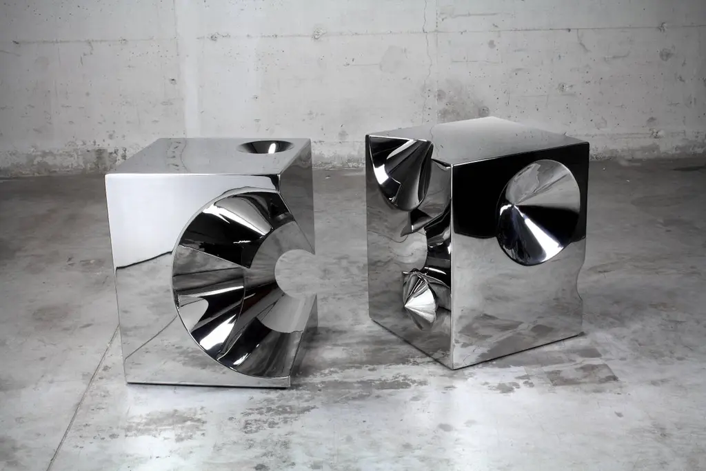 The 'Get Lost' side table is made of mirror polished stainless steel. The side table have a monolithic shape but is hollow inside, the structure is manually welded and mirror polished. An artwork of great aesthetic impact, thanks to its convex and concave planes it creates very interesting reflections. This side table can be used as a stool. Side table dimension: L 45 x W 45 x H 57 cm. Dimension are customizable.Limited Edition of 12.Peter Marino selected an sculptural bench of the Get Lost! Family for the new flagship store Dior in London. Each side table is hand signed and numbered by the artists. 100% handmade in Italy, comes with a “Certificate of Authenticity”.Get Lost in the depth of the cones, mirror polished in order to create a thousand reflections, dream & think! But watch out when sitting down, the pointed cones could be dangerous “Get Lost!”.The artworks by Barberini & Gunnell are regularly shown at international art fairs, such as PAD London, PAD Genève, PAD Monaco, Salon Art and Design New York, ArtMiami.IMPORTANT INFORMATION REGARDING SHIPPING:Please contact us for an independent shipping quote as we provide high quality shipping at competitive prices due to our frequency of shipping, relations with international shipping companies and the possibility to organize directly from Italy.We take care of the entire customs procedure and paperwork. On request we organize a white glove delivery and installation of the artwork inside of the property of the client. All shipments are ALL-RISK insured.We carefully pack all artworks in strong wooden crates to ensure safe transport. This service is done directly in our atelier and is complimentary. All of our artworks travel with a shock watch system in order to monitorate rough handling by shippers and movers.