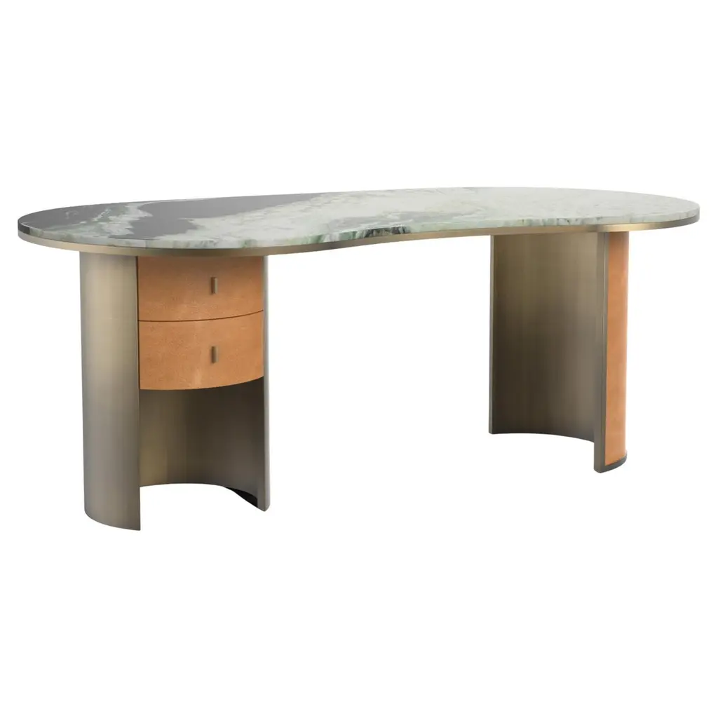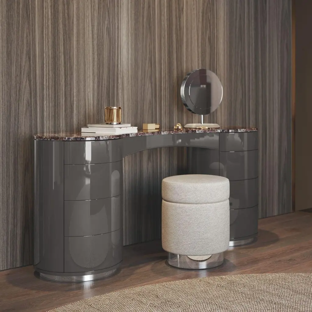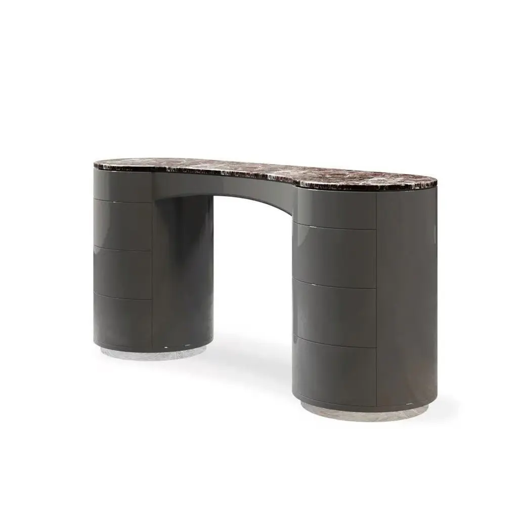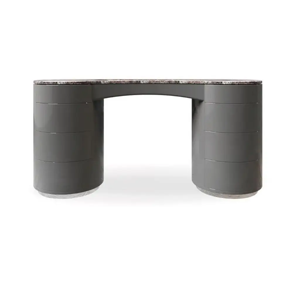 This dressing console is a sculptural masterpiece, defined by its bold yet refined silhouette. The design features a curved, contoured top crafted from luxurious marble, supported by two cylindrical bases. The rounded forms and seamless finish give the piece a monolithic, sculptural presence that elevates its functionality.The cylindrical bases include soft-close drawers and concealed compartments, offering discreet storage while preserving its minimalist aesthetic. With its flowing lines and artistic structure, this piece serves as both a functional vanity and a striking statement in contemporary interiors.We do our best to expedite production and to ship and deliver product within the listed lead time, however current lead times might be longer due to global shipping backlog and delays. These delays are out of our control and cannot be a reason to cancel an order.Our pricing includes all costs for international shipping to the U.S., as well as duties and customs clearance fees. Please be aware that local delivery within the U.S. is not included. We offer white glove, front door, and warehouse delivery options. For shipments outside the U.S., kindly reach out to us for a detailed quote.