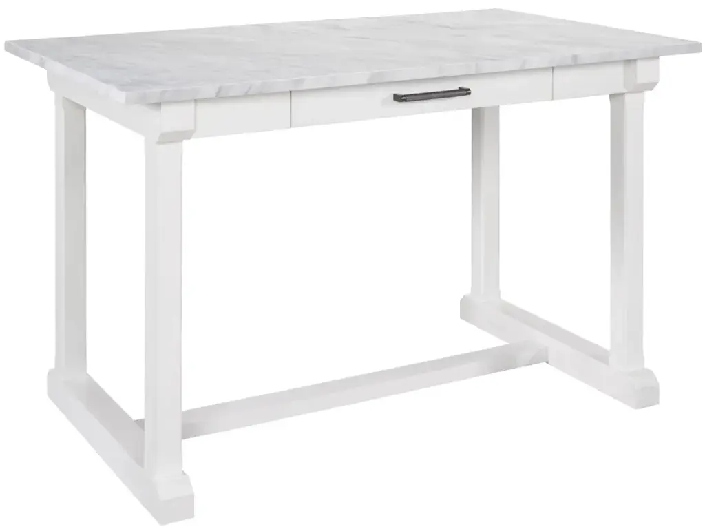 The Elena Counter Table is a delightfully modern furnishing, built with a smooth stone top paired with a convenient storage drawer and a fresh white finish. Assembly Required? Yes