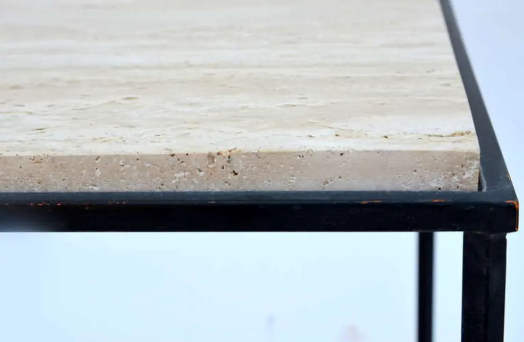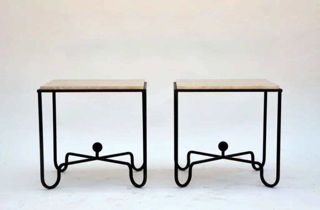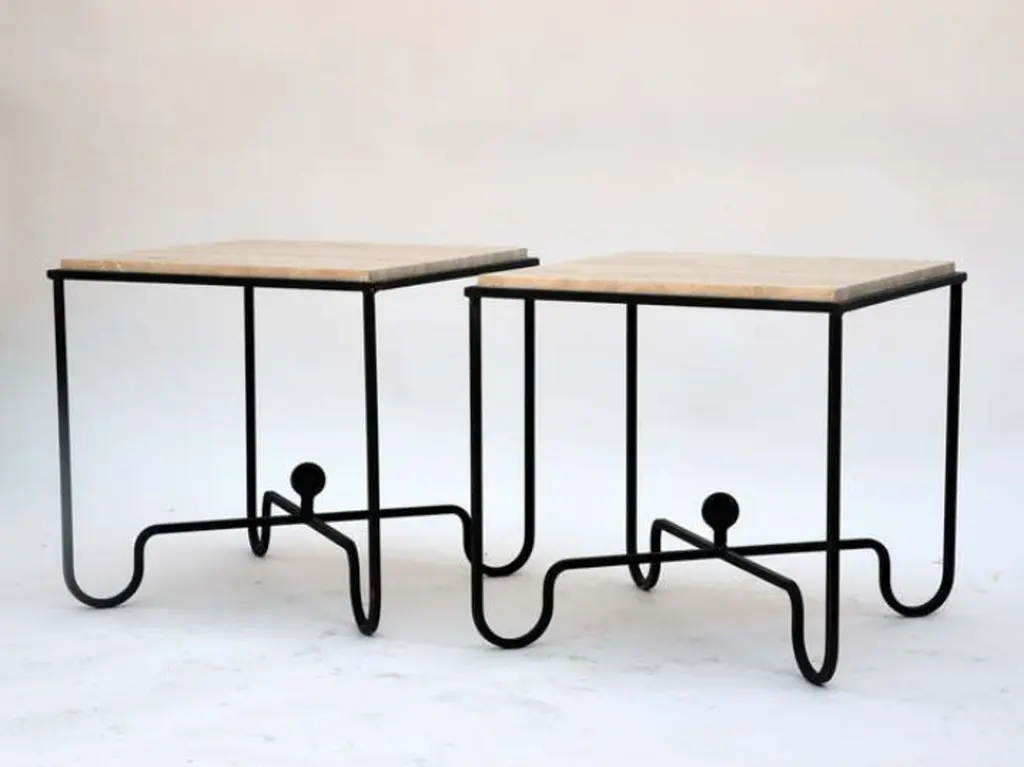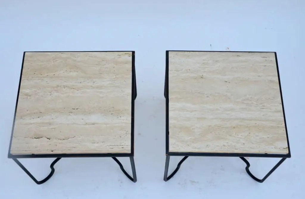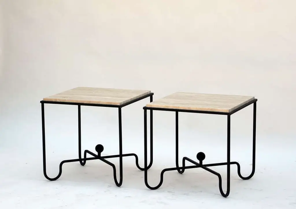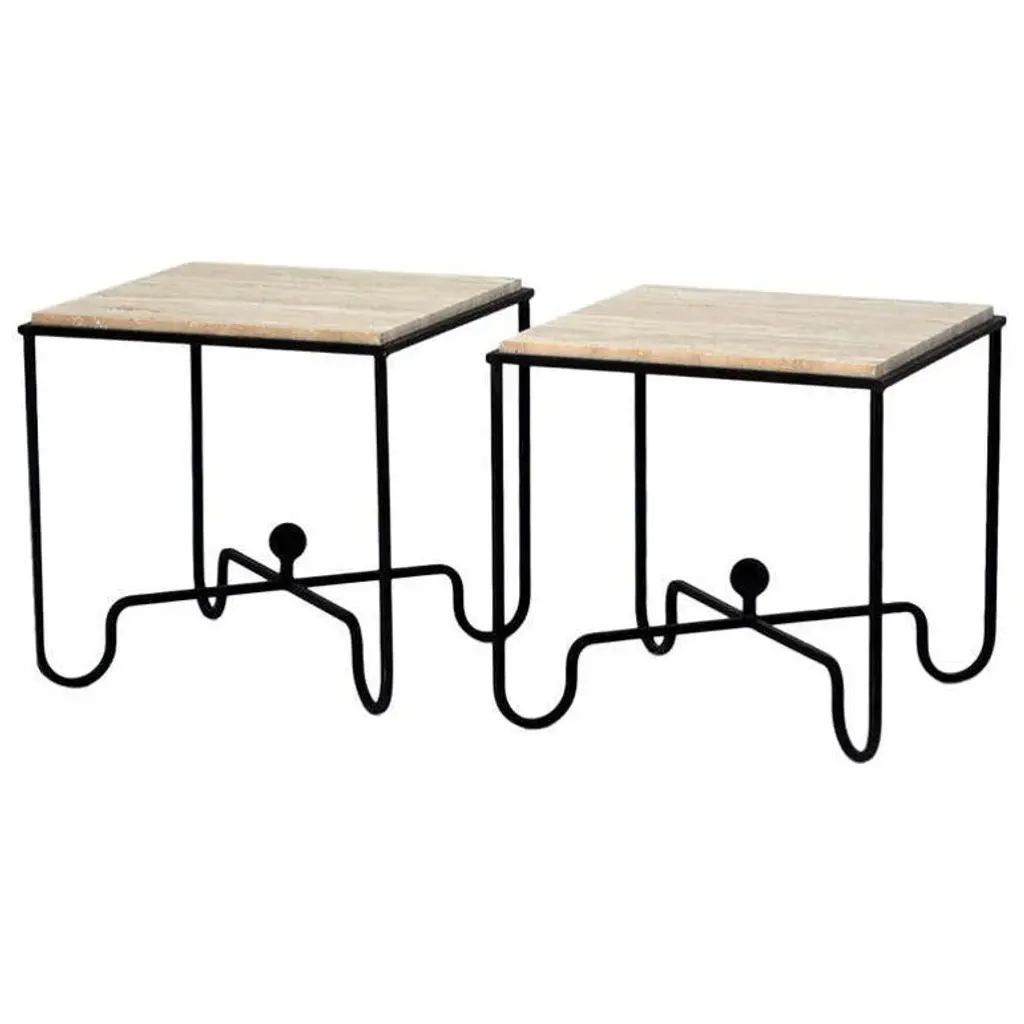 Contemporary "Entretoise" Wrought Iron And Travertine Tables - A Pair