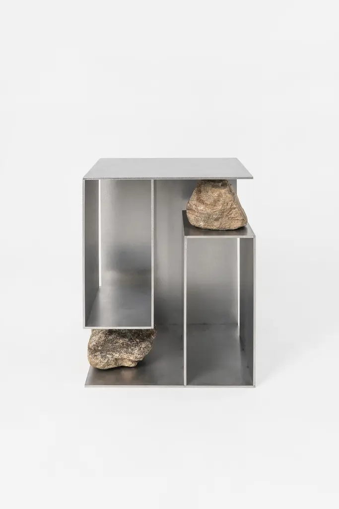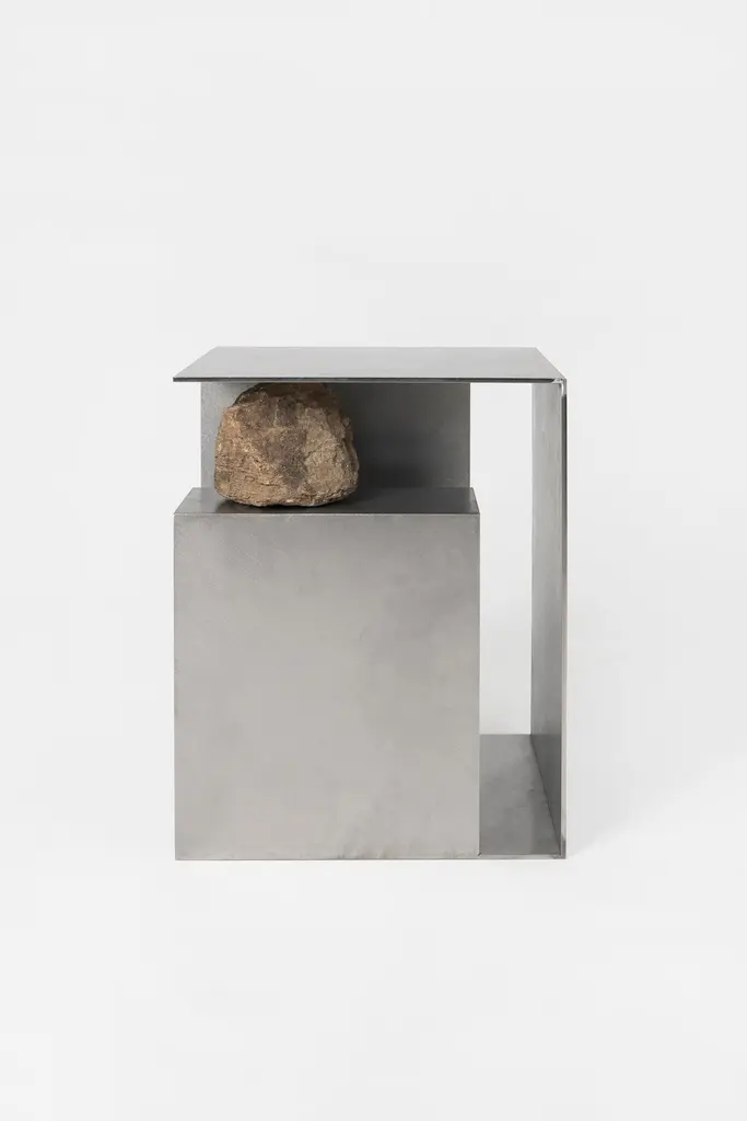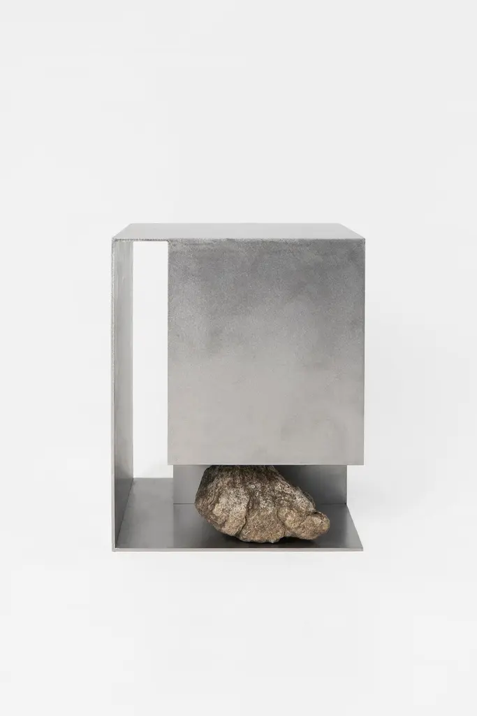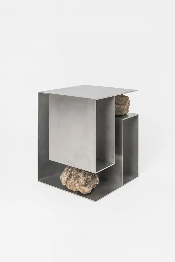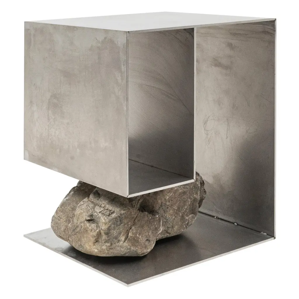 Proportions of stone stool 04 by Lee Sisan2020Dimensions: W 36 x D 36 x H 45 cmMaterials: Stainless steel, natural stoneEach piece is made to order and uses natural stones, so please expect some variability in design."Proportions of stone" is a modelling experiment on the fundamentality of stone cast away by natural phenomena. Consisting of tables, chairs, and other functional furniture pieces, the dimensions of each piece were determined by the stones borrowed from nature. The shapes and functions of the designs were only formed after. Stones mounted on manufactured steel plates play both structural and aesthetic roles. These juxtaposed mediums are opposite, yet balanced - fulfilling the artist's desire to "balance the relationship between nature and artefact."Lee Sisan is a designer and artist based in Seoul, South Korea. He majored in interior design to explore the relationship between nature, artefact and humans. He identifies the essence of the Material and make form of refined language. He conducts experiments in which man-made beings coexist in harmony with nature and maintain balance.