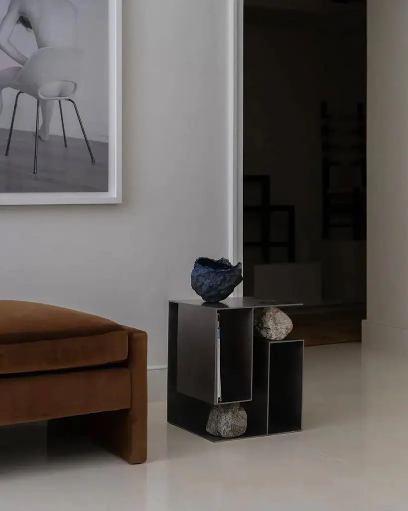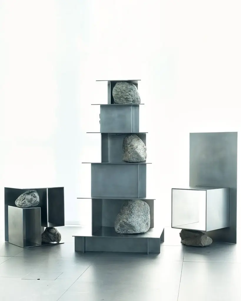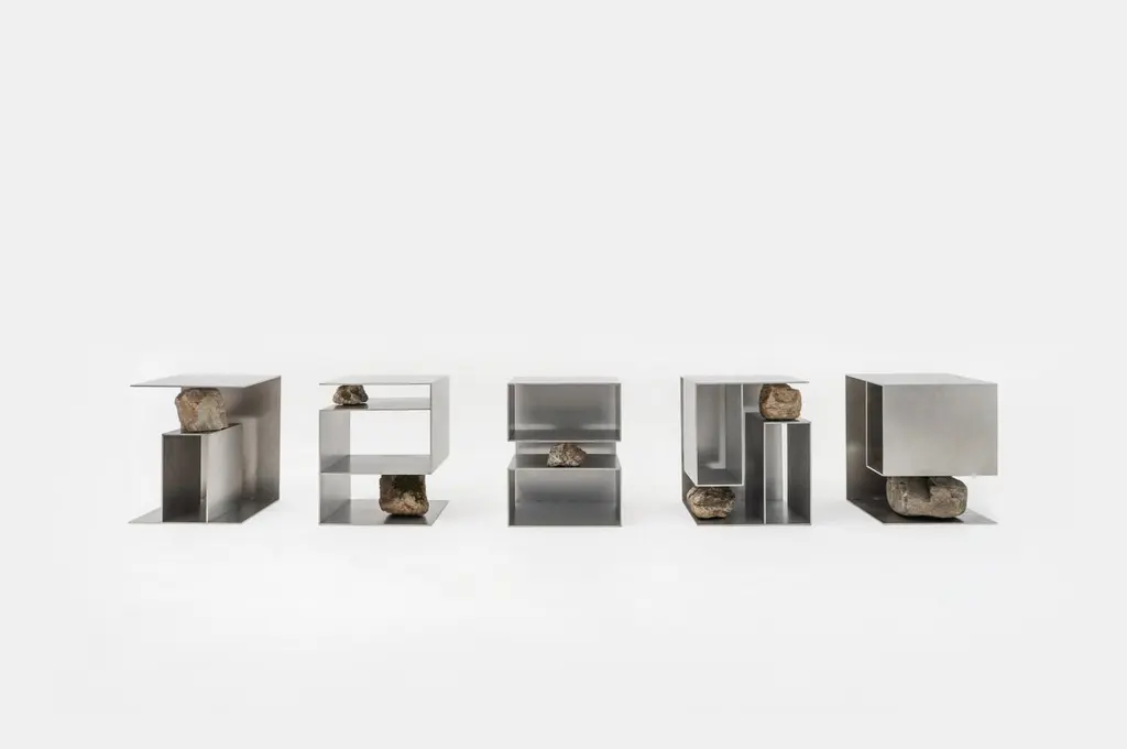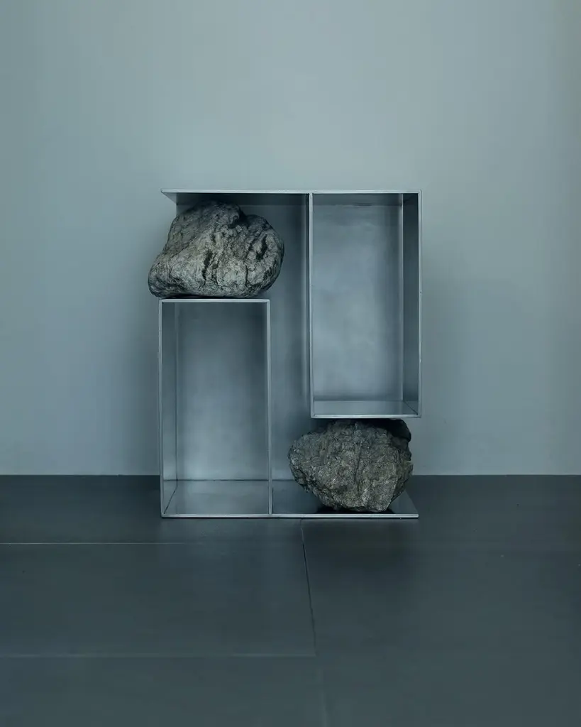 Proportions of stone stool 04 by Lee Sisan2020Dimensions: W 36 x D 36 x H 45 cmMaterials: Stainless steel, natural stoneEach piece is made to order and uses natural stones, so please expect some variability in design."Proportions of stone" is a modelling experiment on the fundamentality of stone cast away by natural phenomena. Consisting of tables, chairs, and other functional furniture pieces, the dimensions of each piece were determined by the stones borrowed from nature. The shapes and functions of the designs were only formed after. Stones mounted on manufactured steel plates play both structural and aesthetic roles. These juxtaposed mediums are opposite, yet balanced - fulfilling the artist's desire to "balance the relationship between nature and artefact."Lee Sisan is a designer and artist based in Seoul, South Korea. He majored in interior design to explore the relationship between nature, artefact and humans. He identifies the essence of the Material and make form of refined language. He conducts experiments in which man-made beings coexist in harmony with nature and maintain balance.