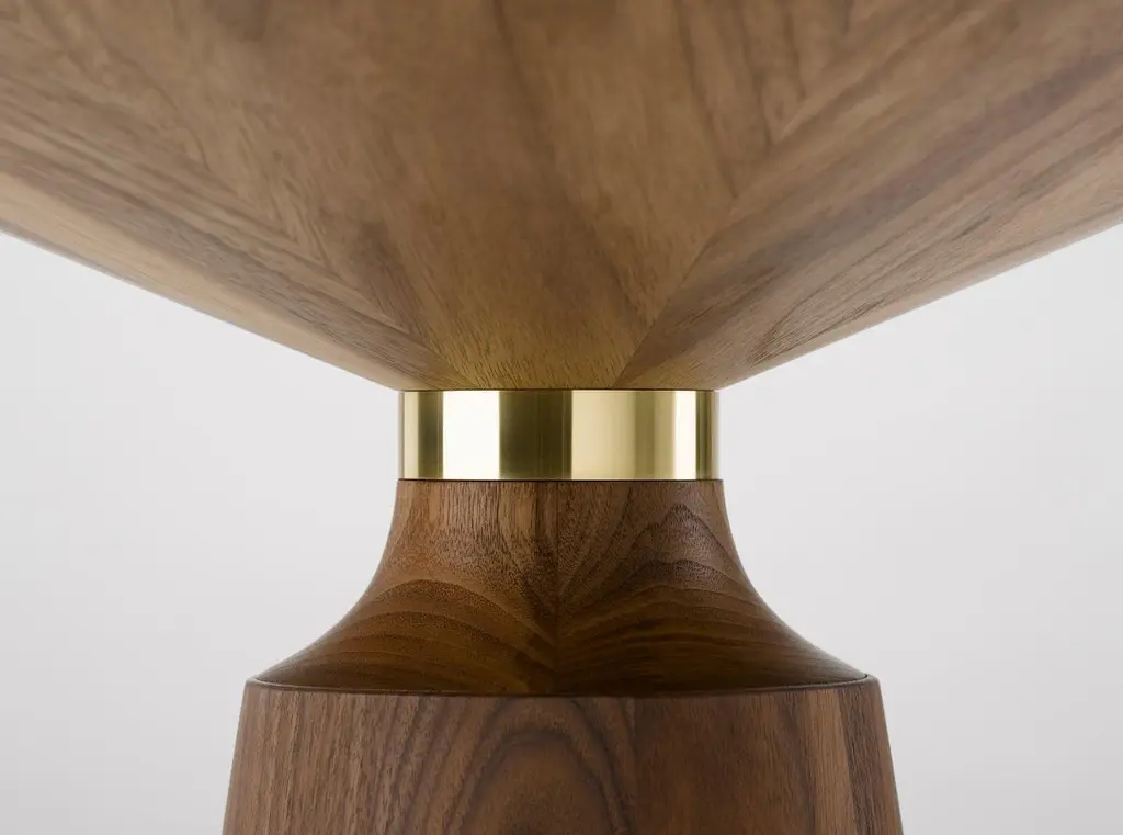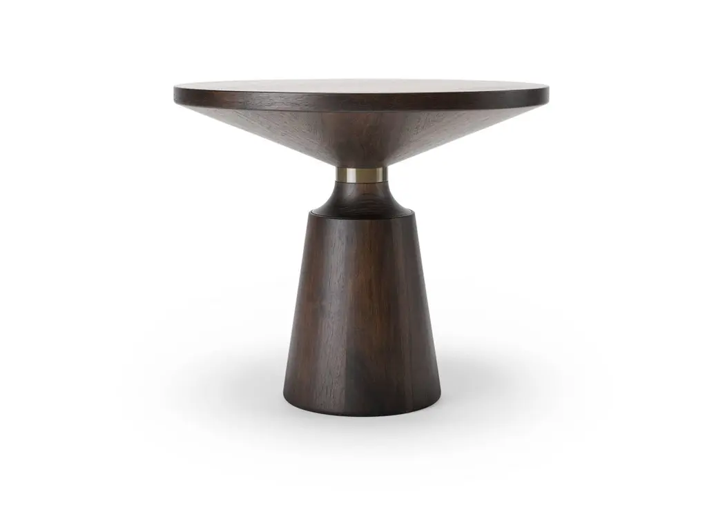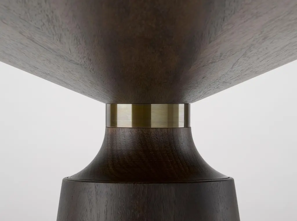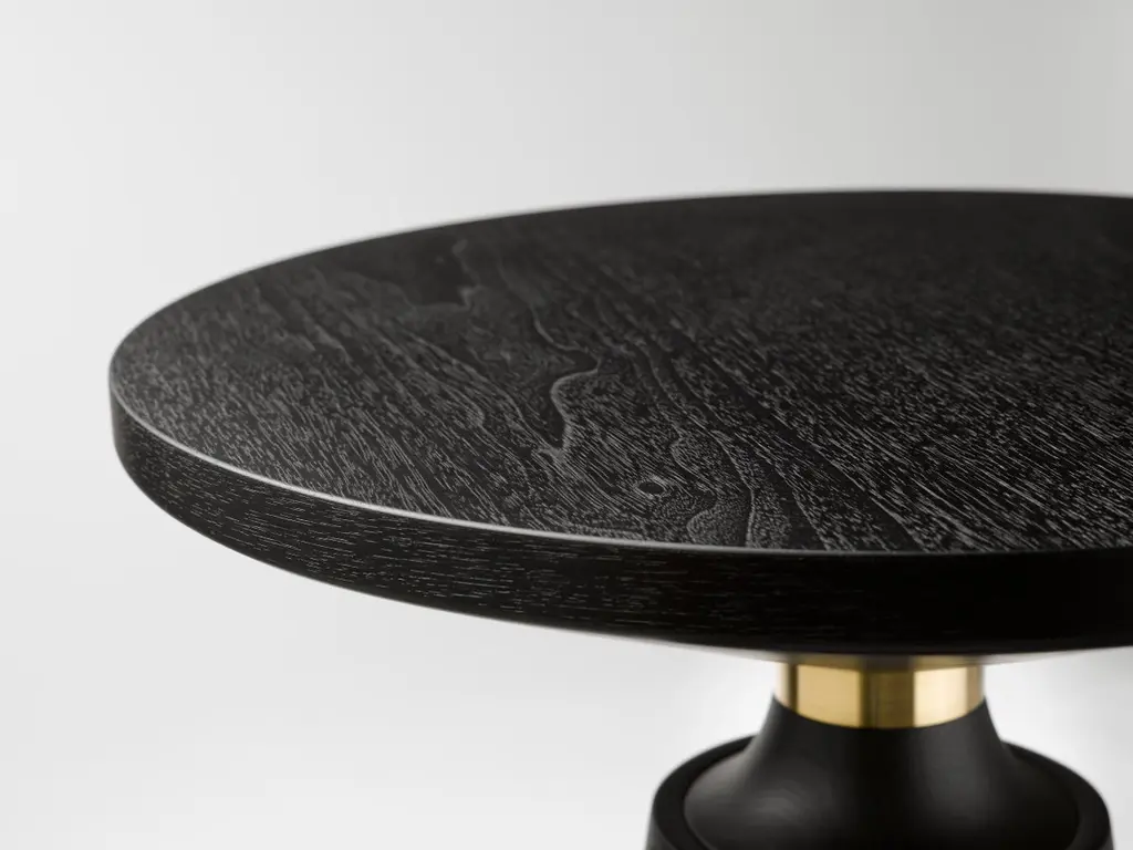 Turned by hand and using both solid and veneered timber, the Nicole Occasional Table has a simple but graphically striking silhouette punctuated by the metal collar. The Nicole Occasional Table is shown here in black lacquered walnut and brass, and also in oiled walnut and brass, and ebonized walnut with bronzed brass.Each Stuart Scott piece is built by hand in our workshop in Wiltshire, England. Nothing is mass-produced. This ensures complete attention to detail, structural integrity and sheer build quality. We never compromise. When we finish each piece, it is signed and numbered: a unique handmade masterpiece. UK IPO DESIGN NO. 6476849WIPO INTERNATIONAL REGISTRATION DM/251683