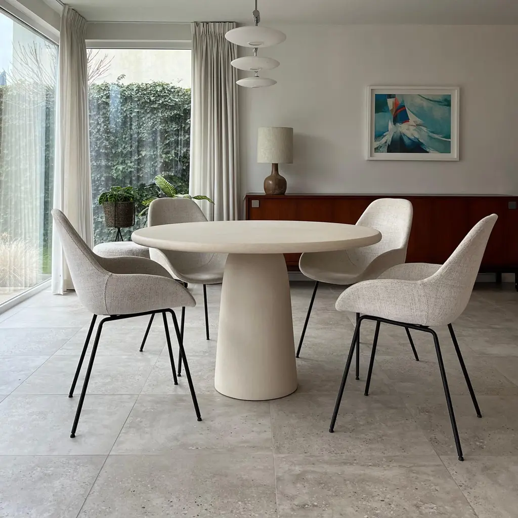 A contemporary Belgian design, handcrafted in natural plaster with a textured, earthy character. The surface is stain-resistant, easy to maintain, and pleasantly soft to the touch, unlike the cold feel of natural stone.Standard version for indoor use. Outdoor finish available on demand. (+20%).Inspired by the timeless menhir form, upright stones placed by prehistoric people in Celtic regions 4000-6000 years ago, the table carries a sense of monumentality and quiet strength.Each piece is built on a wooden base and finished by hand with multiple layers of Mortex®, a premium plaster known for its durability in demanding applications such as bathrooms, stairs, and swimming pools. Mortex contains no epoxy or polyurethane resins.The plaster is applied using the a fresco method: Each layer is applied before the previous one has fully set, creating a perfect bond and a rich, seamless surface. The result is a tactile object with depth, warmth, and individuality. Subtle irregularities, natural shades, and variations are the signature of the craftsman, ensuring that no two tables are ever the same.Thanks to its understated, versatile character, the Menhir Dining Table integrates beautifully into a wide range of interior styles: from wabi-sabi and japandi to brutalism, minimalism, or contemporary design.Available in more than 80 colours, with endless options in size and shape. Samples are recommended, as slight variations in tone and texture are inherent to the artisanal process and the living nature of the material.Colour: BM19 Cacao MidDisclaimer:The colours shown may differ from the colours of the applied product. We recommend ordering a sample. Please keep in mind that differing effects and nuances are to be expected when you compare the finished product to the provided sample. This is the result of the application process and the characteristics of the material. Due to the handmade character dimensions may vary by up to 1.5 cm.The customer is responsible for ensuring that products are used, handled, and maintained strictly in accordance with BB UNITED BV’s instructions and guidelines, provided with the product and/or available on demand. Warranty and liability shall not apply in cases of improper use, lack of maintenance, exposure to unsuitable environments, or use of cleaning products or methods not approved by BB UNITED BV.While certain products are treated and intended for outdoor use, BB UNITED BV cannot guarantee that products will remain unaffected under all climatic or environmental conditions. The customer is responsible for ensuring suitable placement, protection, and maintenance adapted to local weather circumstances. BB UNITED BV shall not be liable for weather-related damage or natural wear and tear.BB UNITED BV shall under no circumstances be liable for indirect, consequential, or incidental damages, including but not limited to shipping costs, customs duties, import taxes, installation costs, third-party claims, or loss of profit.