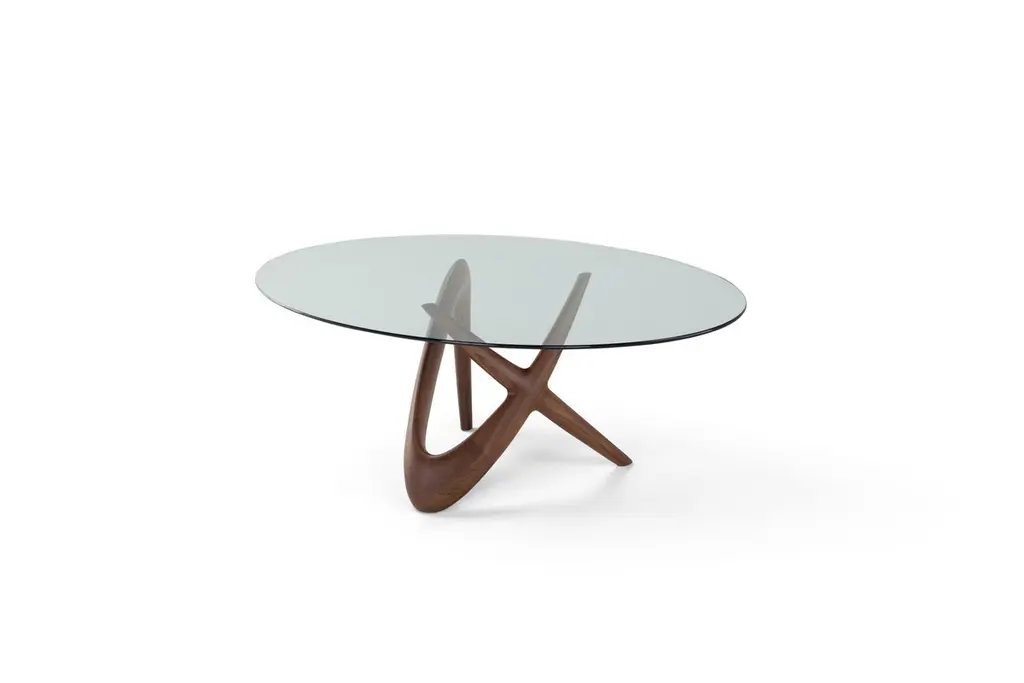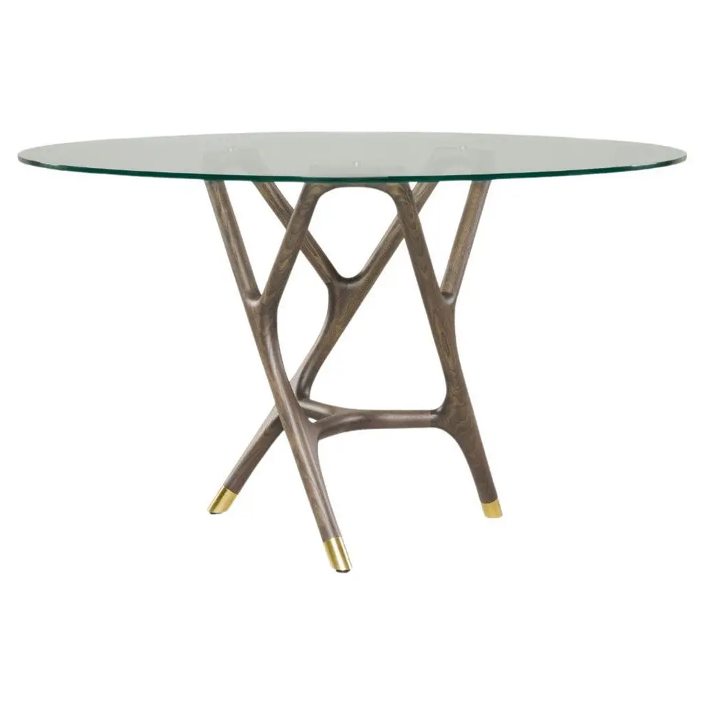 Contemporary round table 'NX' by Stefano Bigi x Amura Lab.Materials: Wooden base and smoke topDimensions: Diameter 150 cm x height 75 cmTable for 6 personsAlmost with the features of a sculpture is NX, the table that overcomes the fixedness and the linearity of its most Classic shape through a dynamic play of volumes with a bursting energy. The innovative and central element of this table is the body in massive wood, that outlines with an airy and slight line the two letters giving it its name. N and X thus give live to a dynamic profile that recalls that of a falling star or of an arrow: a bearing structure with a strong evocative power, in which a “next” can be read, from which NX takes its nature of futurism and overcoming of the established canon.”.