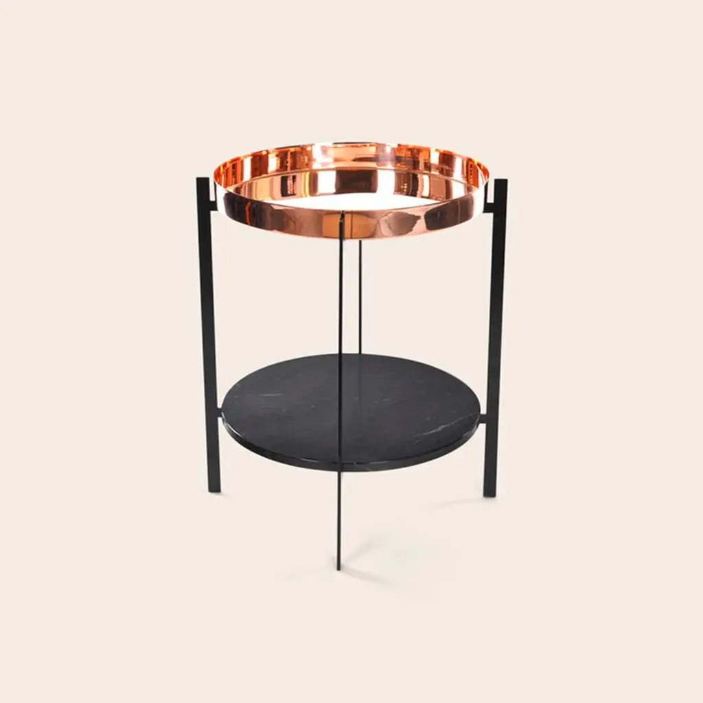 Copper and Black Marquina Marble Deck Table by OxDenmarqDimensions: D 57 x W 57 x H 67 cmMaterials: Steel, Black Marquina Marble, CopperAlso Available: Different tray conbinations available,OX DENMARQ is a Danish design brand aspiring to make beautiful handmade furniture, accessories and lighting in natural high-quality materials in fair prices. " When we set out back in 2003, we were primarily working with vegetable-tanned saddle leather thus the name OX was a tribute to our unique leather and the animal providing it.The other half of our name, DENMARQ, is chosen to emphasize that we are a Danish design brand based on the Danish design tradition and that most of our furniture is produced in Denmark. However, DENMARQ not only refers to our home country, but also to the co-founder and designer - DENnis MARQuart.Before finishing his design studies at the Copenhagen Design University, Dennis Marquart did a Blacksmith education. This background is extremely useful when developing and designing products."OX DENMARQ handmade products will only get more beautiful as time passes and natural patina sets in.Many OX products are shaped around marble or vegetable-tanned saddle leather. Stone and leather are materials that will, and should, get marks over time. But they will also age with a very special beauty. When you learn to appreciate the beauty of maturity and of time passing, you have learned to appreciate patina the way it should be appreciated.