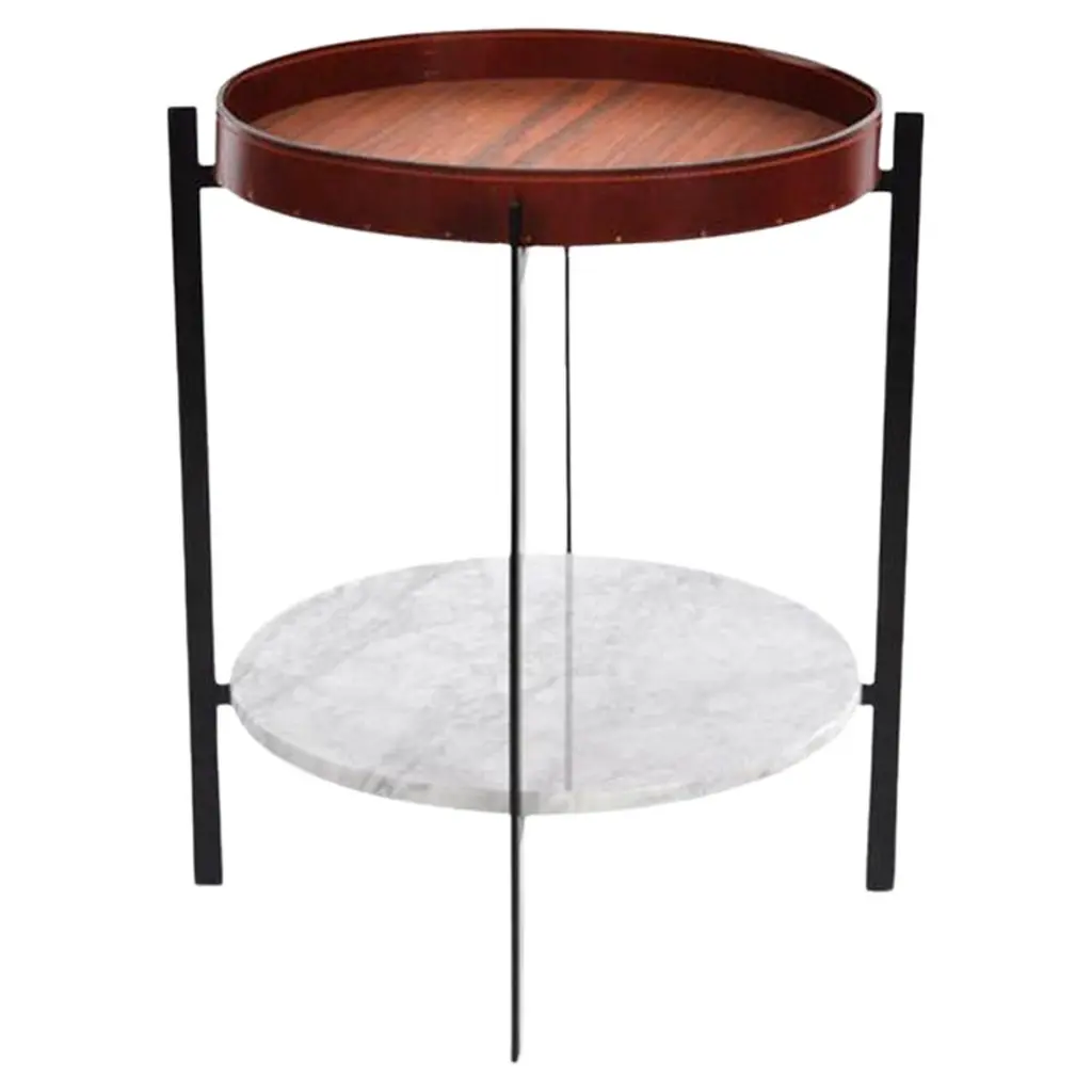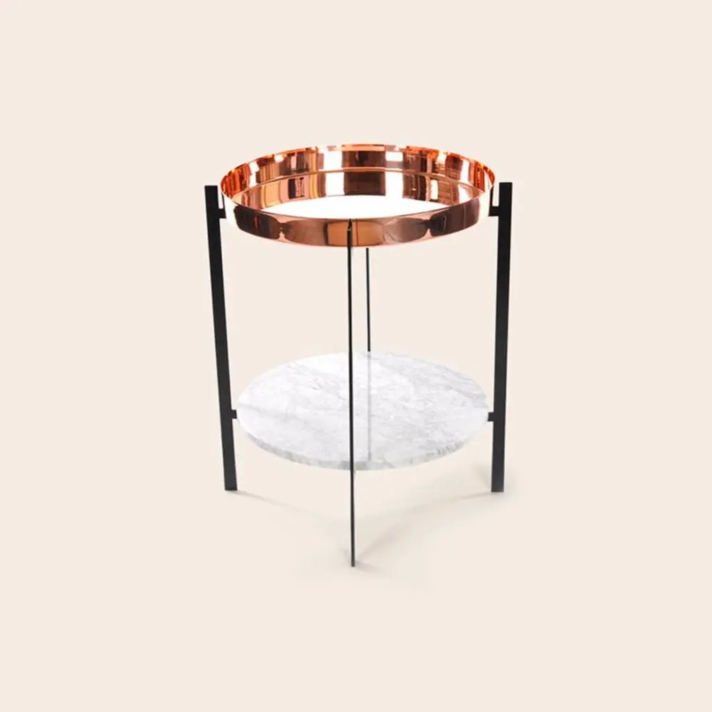 Copper and White Carrara Marble Deck Table by OxDenmarqDimensions: D 57 x W 57 x H 67 cmMaterials: Steel, White Carrara Marble, CopperAlso Available: Different tray conbinations available,OX DENMARQ is a Danish design brand aspiring to make beautiful handmade furniture, accessories and lighting in natural high-quality materials in fair prices. " When we set out back in 2003, we were primarily working with vegetable-tanned saddle leather thus the name OX was a tribute to our unique leather and the animal providing it.The other half of our name, DENMARQ, is chosen to emphasize that we are a Danish design brand based on the Danish design tradition and that most of our furniture is produced in Denmark. However, DENMARQ not only refers to our home country, but also to the co-founder and designer - DENnis MARQuart.Before finishing his design studies at the Copenhagen Design University, Dennis Marquart did a Blacksmith education. This background is extremely useful when developing and designing products."OX DENMARQ handmade products will only get more beautiful as time passes and natural patina sets in.Many OX products are shaped around marble or vegetable-tanned saddle leather. Stone and leather are materials that will, and should, get marks over time. But they will also age with a very special beauty. When you learn to appreciate the beauty of maturity and of time passing, you have learned to appreciate patina the way it should be appreciated.