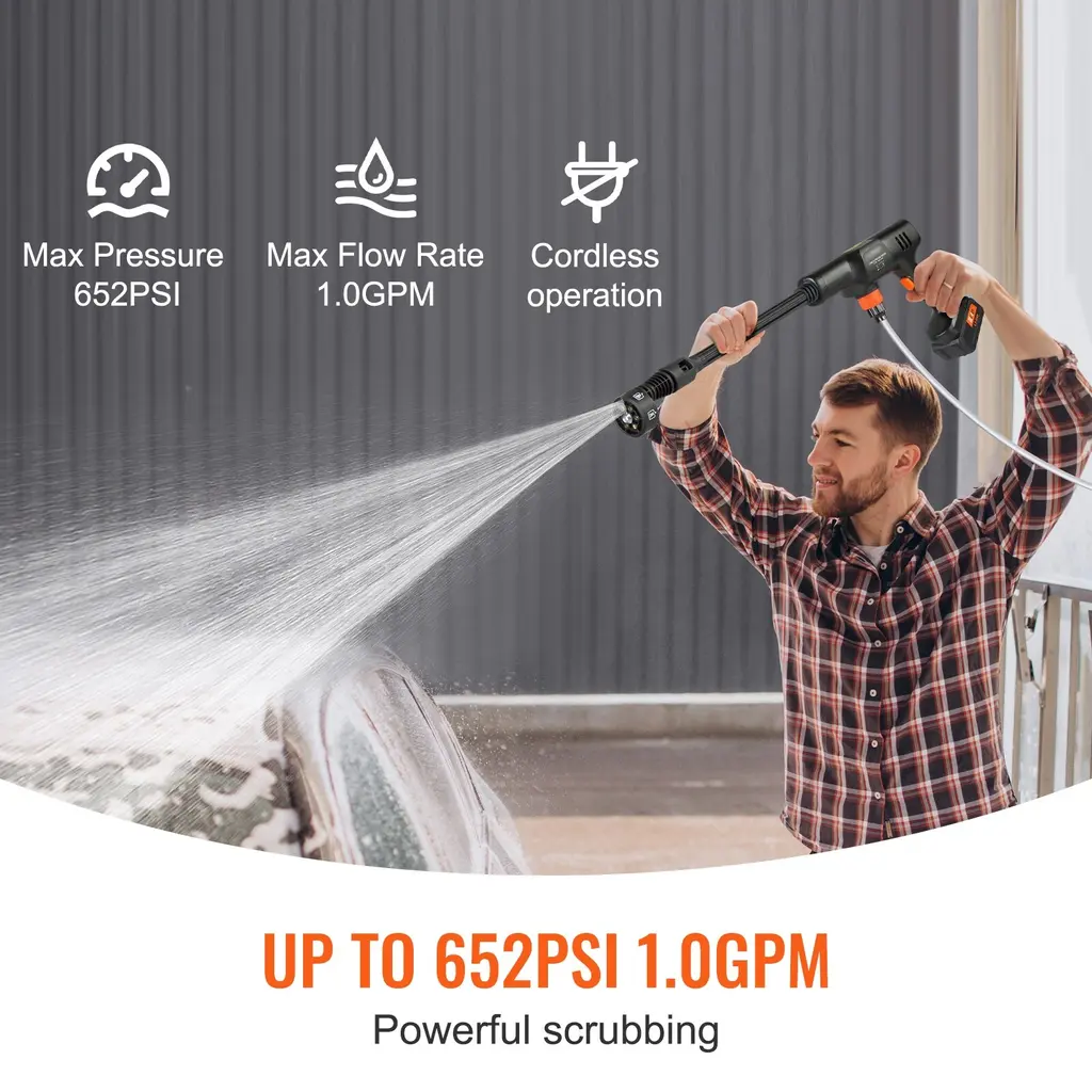 652PSI High Pressure: The cordless pressure washer comes with powerful pressure to easily eliminate stubborn stains. With a 290PSI regular pressure mode for daily cleaning of walls and floors, and a 652PSI high-pressure mode with a 1.1GPM / 1.0GPM flow rate designed for cars and paving stones, no grime can hide. 4lb Lightweight ( 1.1GPM option): With a net weight of just 4 pounds, this power cleaner is easy to control with one hand and fatigue-free for extended use. Comes with a mesh storage bag for dust prevention and easy portability, making it versatile for both outdoor and indoor use. Brushless Motor (1.0GPM option): Our portable pressure washer features a specially designed brushless motor that automatically cools when overheated, extending product lifespan. It comes with a safety lock to prevent accidental activation. No need to hold down the trigger, just press once for continuous spray. 3 Pressure Settings: The high power cleaner comes with three adjustable pressure settings. The first setting offers 1.2Mpa low pressure for gentle washing suitable for household glass. The second at 1.6Mpa medium pressure is ideal for large-area floor and fence cleaning. The third at 2.0Mpa high pressure effectively removes stubborn grime from sanitary dead corners. 5 Nozzle Options: Comes equipped with 6-in-1 nozzle (1.1GPM option) / 0°~40° nozzle(1.0GPM option), high/low pressure nozzle, and adjustable nozzle, easing your daily cleaning tasks. It also includes a foam pot, suitable for watering or foam washing tasks. 60-Minute Long Battery Life: This cordless power washer includes a 4.0 Ah high-capacity battery andcertified fast charger. Battery life varies between 20/40/60 minutes depending on low/medium/high settings. No need to worry about running out of battery mid-cleaning, experience a new realm of seamless cleaning. 1.1GPM Package Content 1 x Pressure Washer 1 x Battery 1 x Charger 1 x Extension Rod 1 x Coke Bottle Connector 1 x Adjustable Foam Pot 1 x Screen Filter 1 x User Manual 1 x Multi-Functional Six-In-One Nozzle 1 x 6m Water Inlet Pipe 1 x Adjustable Nozzle 1 x Bucket 1 x Carbon Fiber Storage Bag 1 x Water Inlet Connector 1 x High/Low Pressure Nozzle 1.0GPM Package Content 1 x Pressure Washer 1 x Battery 1 x Charger 1 x Coke Bottle Connector 1 x Adjustable Foam Pot 1 x Screen Filter 1 x User Manual 1 x Six-In-One Nozzle 1 x 6m Water Inlet Pipe 1 x Nylon Extension Rod 1 x Stainless Steel Extension Bar 1 x 0 Degree Nozzle 1 x 40 Degree Nozzle 1 x Adjustable Nozzle 1 x Bucket 1 x Gloves 1 x Carbon Fiber Storage Bag 1 x Water Inlet Connector 1 x High/Low Pressure Nozzle