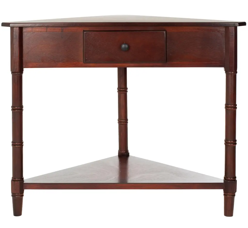 Curate a unused corner with the char triangular table with clean lines that complement country casual, traditional and transitional interiors depending on finish. Crafted of pine with dark cherry finish the corner table features storage drawers, bottom shelf and gracefully turned legs. Wood is a natural material with variations of color shade, configuration, streaks, and grain structure. Each individual piece of furniture has characteristic markings that will differ from photo and showroom samples. Regular attention and maintenance of fine furniture can ensure it's beauty for years to come. Always use felt pads under all articles to prevent discoloration or softening of the lacquer. Plastic and rubber bases on items can discolor wood. Some assembly required.