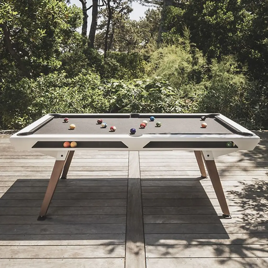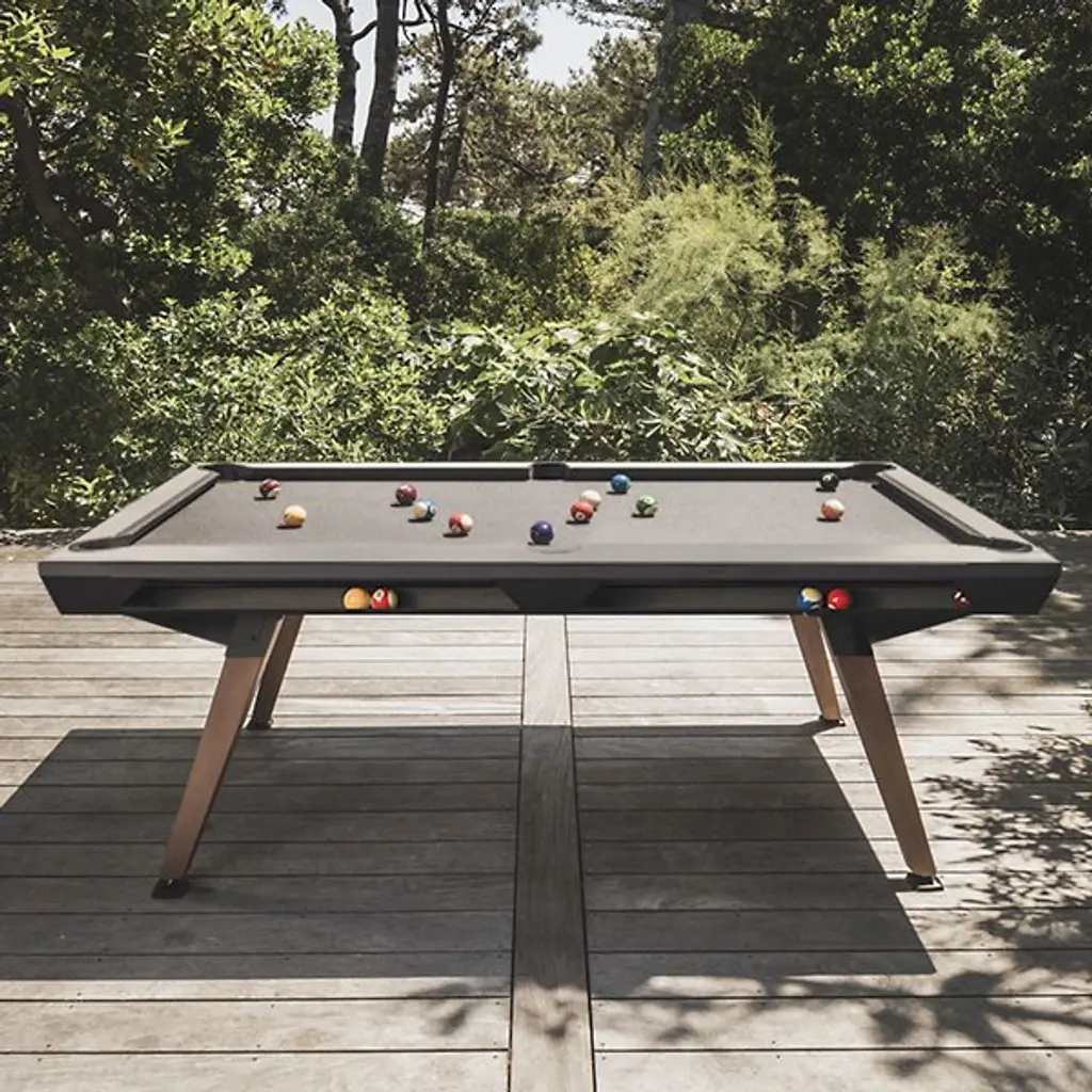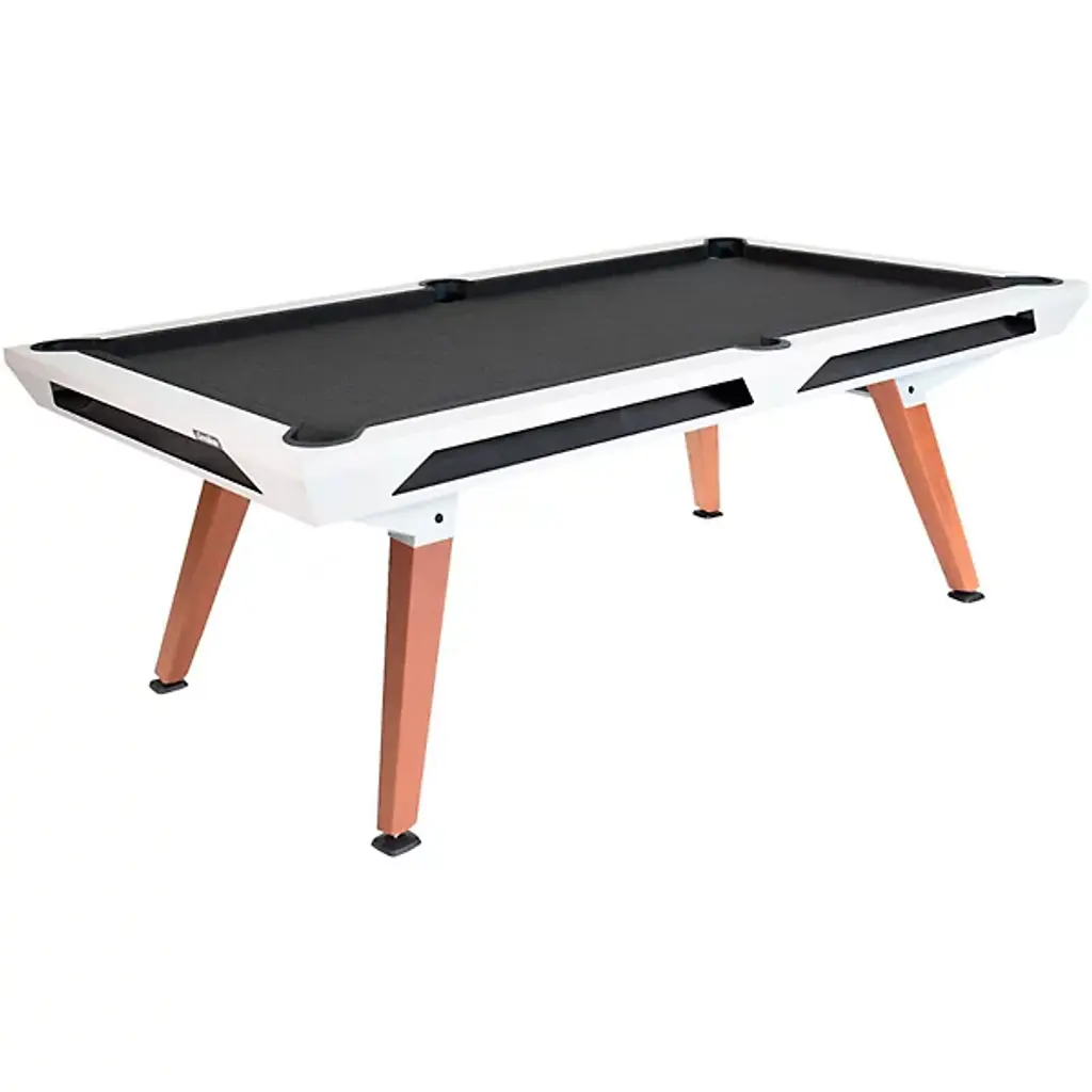 The Cornilleau Origin Outdoor Pool Table from Cornilleau transforms outside spaces or high-traffic game rooms with stark strength. Designed by Cornilleau & Stella and made in France, it puts a contemporary spin on a classic game. Four angular legs steady the tabletop, while side cutaways provide easy access to storage for the included accessories. Key components, made from a non-corroding mix of steel, aluminum, and zinc, accompany a slate play field of smooth, high-pressure laminate. The table is tough enough to withstand intense play and rough weather, and has been tested to withstand years of outdoor use and enjoyment.