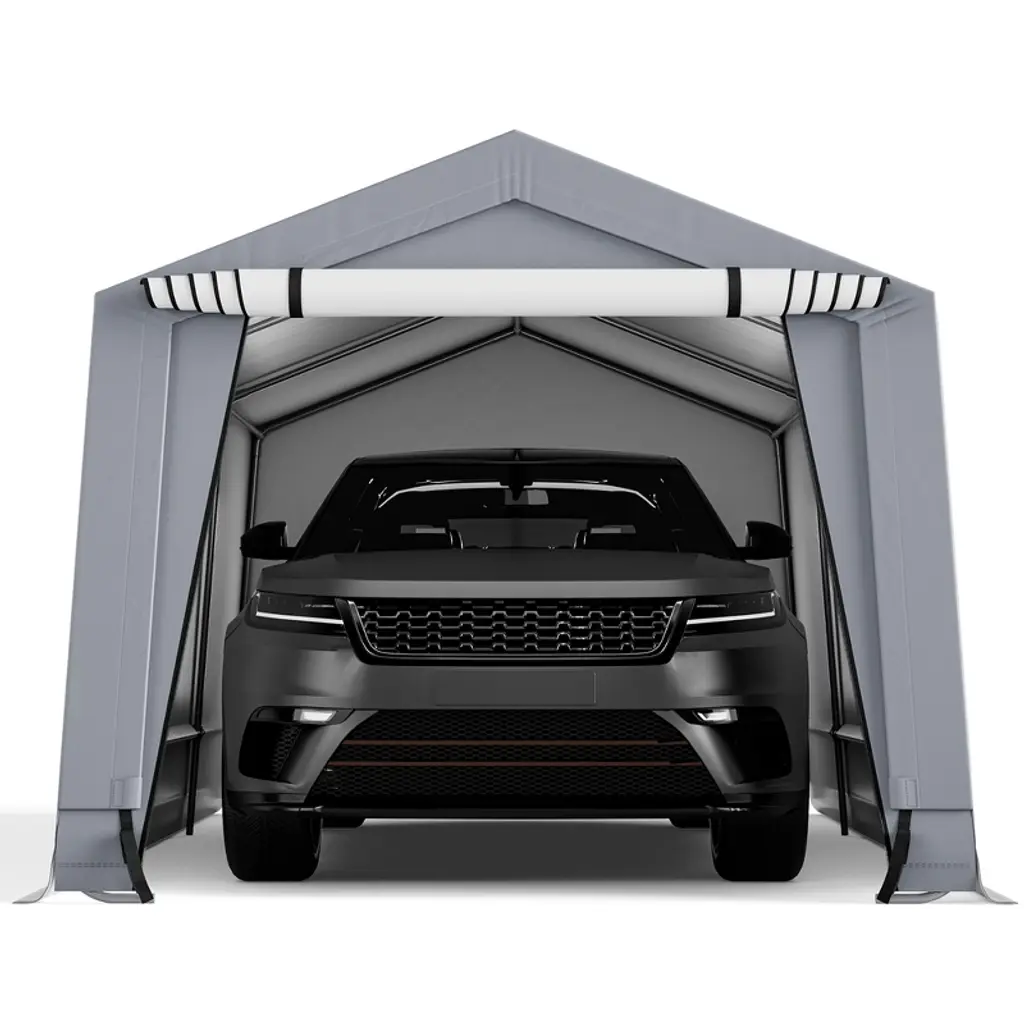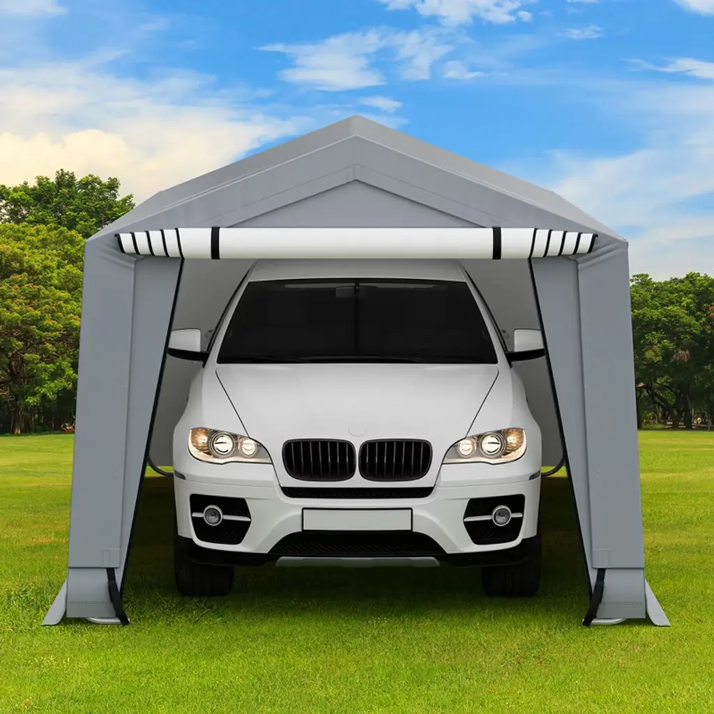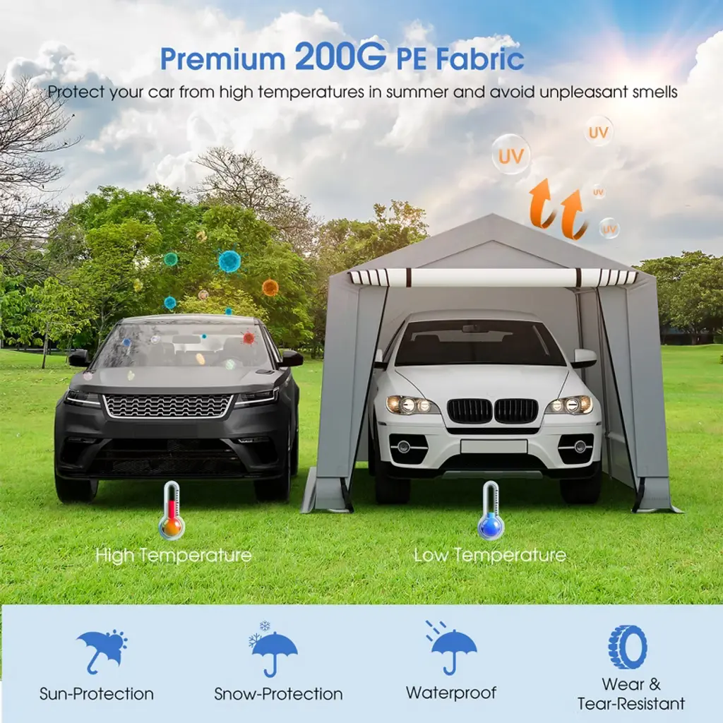 Protect Your Cars from Outdoor Season Elements! Our heavy-duty carport measures 10.2' x 20.4' x 8.1' (L x W x H) and provides ample space for your vehicles, boats, or cargoes, and you can also use it as a cool shelter in the courtyard to hold parties. Besides, the frame is constructed of thickened galvanized poles with a diameter of 1.5'', which are rustproof, sturdy, high-strength, and deformation-resistant, ensuring long service life. And there exist steel wire ropes with latch fasteners and sturdy ground metal anchors for firmly fixing the carport to the ground, ensuring excellent wind resistance and stability. Other than that, the car canopy is crafted of waterproof and ultraviolet-resistant 200G PE fabric, providing all-season protection for your cars and boats. And the roof adopts slanted design that can effectively prevent water and snow accumulation. But on snowy days, please sweep the snow on the carport canopy in time to avoid unnecessary damage. In addition, there exist 2 detachable doors and the front door with zippers can be rolled up, promoting better air circulation in the interior space. The package is delivered in 3 boxes, please be patient since the arrival time for each box may vary. FeaturesThe carport is delivered into 3 boxes and each box may arrive at different times, and the screw kit is in the third box Can be used to store the SUV, boat, cargo, car, or as a seasonal shade for decks, patios, pool areas Supported by the heavy-duty galvanized steel frame that gives resistance to rust, peel, or chip The 200G PE tarp canopy provides a full range of protection to your cars throughout the year Protect your cars from harsh weather conditions, such as wind, rain, snow, sun, dust, etc The reinforced triangular beam provides strong support and ensures great stability The metal ground anchors can be bonded with steel wire ropes, fixing the carport to the ground The metal ground anchors can be also used to fix 4 corners of the carport, adding more stability The roll-up zippered doors promote good air circulation, and the 2 doors can be removedColor: Grey Material: Galvanized Steel, 200G PE Fabric Overall Dimensions: 20.4' x 10.2' x 8.1' (L x W x H) Size of the Door: 7.8' x 6.3' (L x H) Net Weight: 140 lbs Package Includes: 1 x Carport 1 x User's Manual