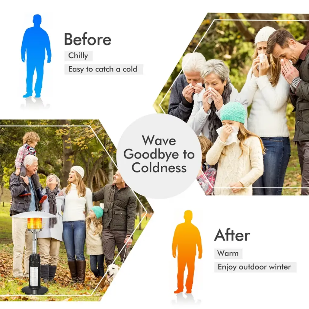 This tabletop patio heater will keep you always warm even in outdoor winter. Pressing the ignition switch to ignite and then turning the control knob, you will immediately get rid of coldness outdoors. And the rust-resistant steel and aluminum enables the heater to withstand long-term outdoor use. Moreover, the wire guard can endure high temperature and ensure higher safety. And the weighted base makes the heater stand more steadily without tipping over. Other than that, the heater features triple protections: tipping-over protection, flameout protection and anox ic protection. This portable patio propane heater is truly a perfect companion for you in the coming winter. Features11,000 BTU powerful heat output instantly makes you warm High heating efficiency with wide range and all directions Easy to operate with ignition switch and control knob Adjustable flame size satisfies your different needs Compact size and light weight for easy storage and movement Suitable for courtyard, patio restaurant, garden, etc. Quick assembly with the clear instruction and all accessories Available for propane gas tank of 1.02 lbs (not included) Color: Silver + Brown Material: Steel + Aluminum Overall Dimension: 21'' x 21'' x 38'' (L x W x H) Net Weight: 13 lbs Heat Output: 11,000 BTU Fuel Type: Propane Suitable Gas Tank: 1.02 lbs Package Includes: 1 x Tabletop Patio Heater 1 x Instruction