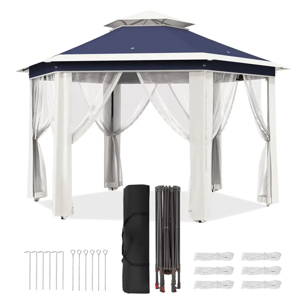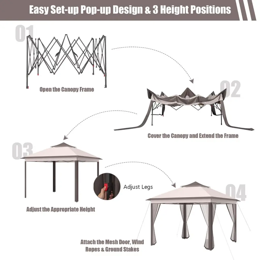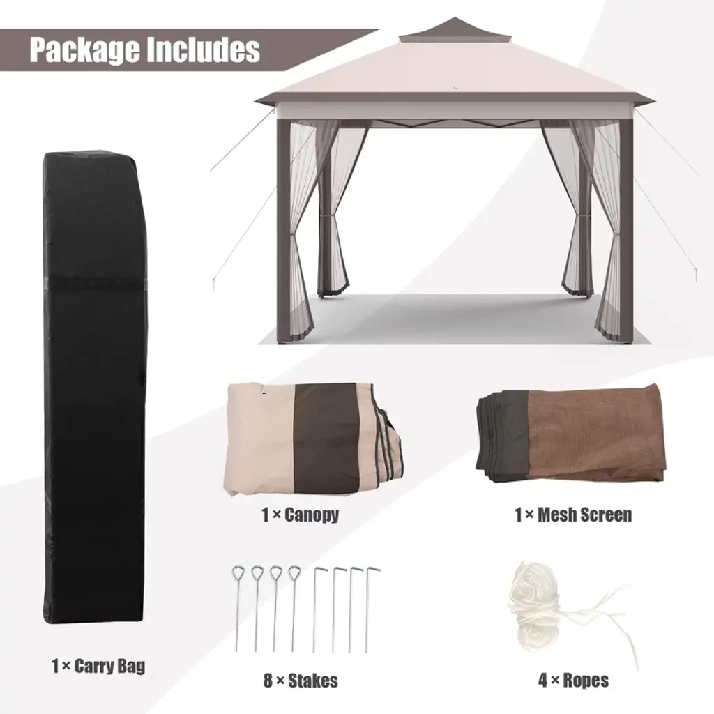 Perfect sun shelter in hot summer with mesh screen! Our outdoor gazebo tent is designed with an extended cornice to provide 121 square ft of shade. And it features with a double vented roof, which will bring you better ventilation, allowing you to enjoy the cool in the hot summer days. The gazebo tent is equipped with 4 mesh screens with zippered doors for easy access and protection from flying insects. The canopy is made of waterproof and fade resistant polyester fabric, which is sturdy. And the frame of the tent is made of powder-coated steel pipe, which is stable and rust-proof. The frame is pre-assembled, you just need to unroll them, put on the canopy and mesh to quickly get an ideal sun shelter. In addition, this gazebo tent can adjust the height of three gears to meet your different needs. Besides, we provide a carry bag so you can easily carry it to the beach, backyard, deck, etc. It is the perfect choice for parties, dinners, weddings! FeaturesDouble vented roof promote airflow and provide good ventilation 3 different height adjustment level satisfy your diverse needs Breathable mesh netting protect you from sun and flying insects Extended cornice design provides extra shading coverage Drainage holes to prevent the tent from collapsing under water in rainy days Equipped with wind ropes and stakes to keep it stable in windy days Powder-coated steel frame is anti-rust for long durability sturdy polyester fabric is waterproof and fade resistant Portable carry bag make it suitable for outdoor use Pop-up design is easy to set up within steps Color: Brown\Beige Material: Polyester Fabric, Steel Pipe Overall Dimension: 11’x 11’ x 9.5’ (L x W x H) Carry Bag Dimension: 45.5'' x 8.5'' x 8'' (L x W x H) Net Weight: 35 lbs Package includes: 1 x Patio Gazebo 1 x Carry Bag 4 x Wind Ropes 8 x Stakes 1 x Instruction