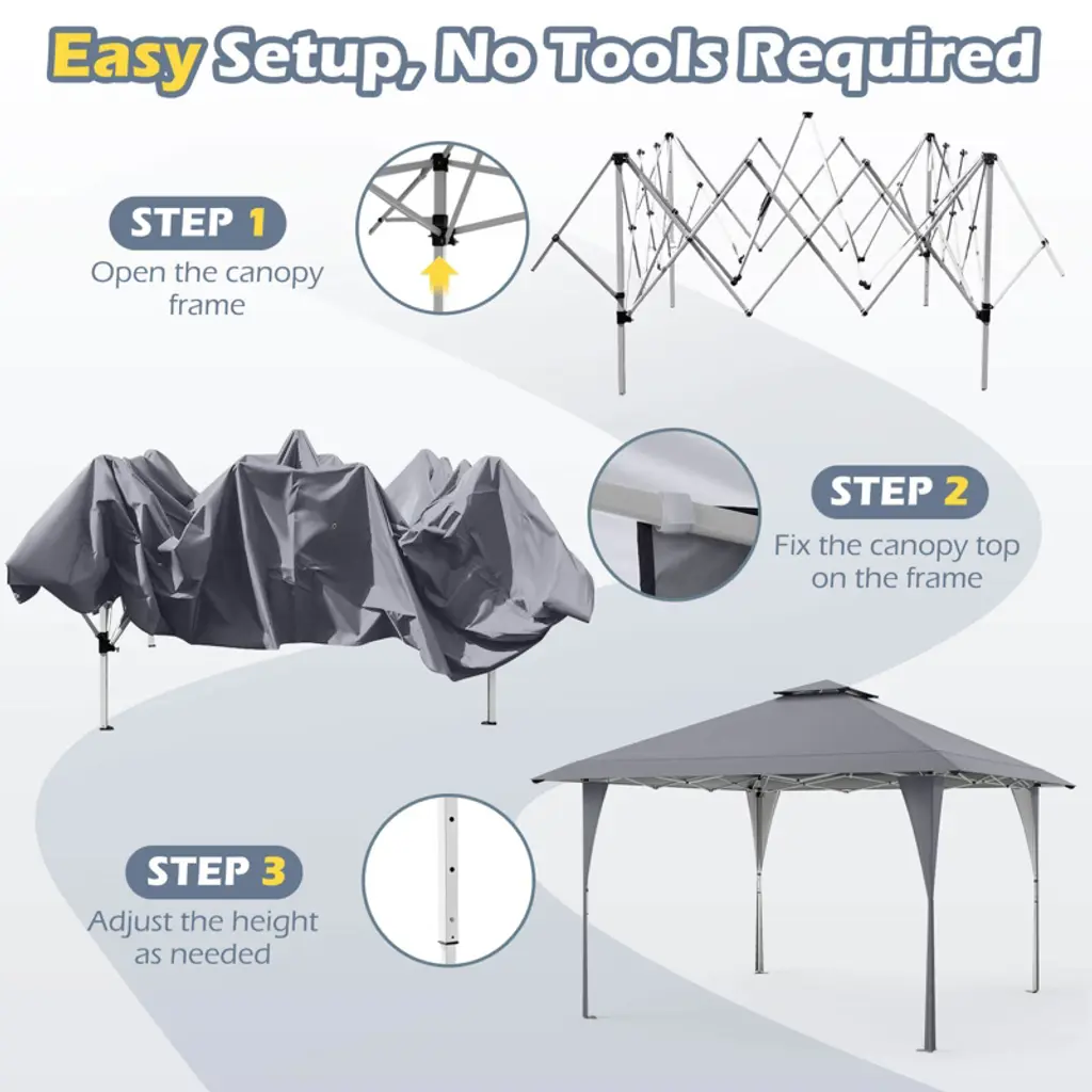Your Ultimate Outdoor Shelter Solution! Our 13 x 13 ft pop up canopy tent features extended eaves for added sunshade and 3 adjustable height positions for different preferences, ideal for hosting a variety of events from beach parties to backyard barbecues. Featuring a robust structure that pops up in moments without any need for tools, setting this tent up is refreshingly straightforward. Secure lock mechanisms at each corner ensure easy assembly and disassembly. The canopy is crafted from 210D oxford fabric enhanced with a silver coating, ensuring excellent sun protection (Note: Please avoid using it in heavy rain or strong windy days). For heightened stability, the tent includes an air vent for diminishing wind pressure, complete with ground stakes and wind ropes that firmly anchor it. When not in use, the portable gazebo easily folds down and can be stored in a carrying bag, ready to accompany you to your next outing or special event.FeaturesOffers a large footprint of 13 x 13 ft, provide plenty of shade for your gatherings Equipped with extended eaves on 4 corners for added sun protection 3 height options cater to your specific shade needs for different activities and events Equipped with a pop-up structure, allow you to assemble the tent quickly Includes a portable carrying bag, easy to store and transport anywhere you want The oxford canopy ensures fade resistance, drizzle resistance, and flame resistance The canopy with silver coating offers superior UPF50+ sun protection The air vent promotes ventilation, reduces wind pressure, enhances stability Equipped with metal stakes and wind ropes to firmly secure the tent Equipped with sturdy truss connections, enhance strength, prevent deforming The reinforced corner structures feature locking rings, prevent accidental release Ideal for various outdoor activities, markets, sporting events, picnics, beach outingsColor: Pink/Gray/Beige/Khaki Material: Oxford Fabric, Metal Product Dimensions: 13 x 13 x 8.5-9.2 ft (L x W x H) 3 Adjustable Heights: 8.5/8.8/9.2 ft Ground Clearance: 5.5/5.8/6.1 ft Carrying Bag Size: 4.1 x 0.8 x 0.7 ft (L x W x H) Net Weight: 38.5 lbs Package Includes: 1 x Canopy 1 x Frame 1 x Carrying Bag 4 x Wind Ropes 8 x Ground Stakes 1 x User’s Manual