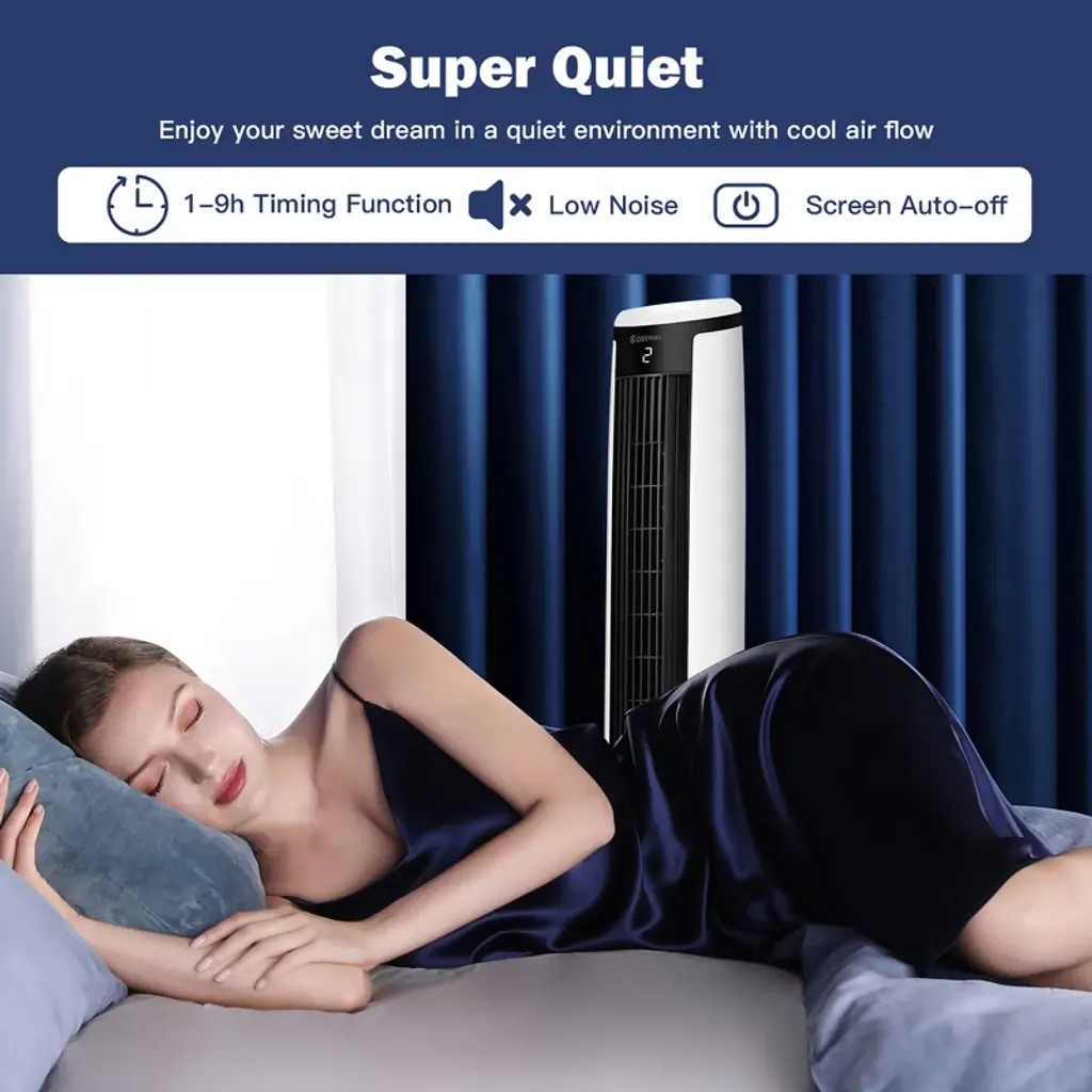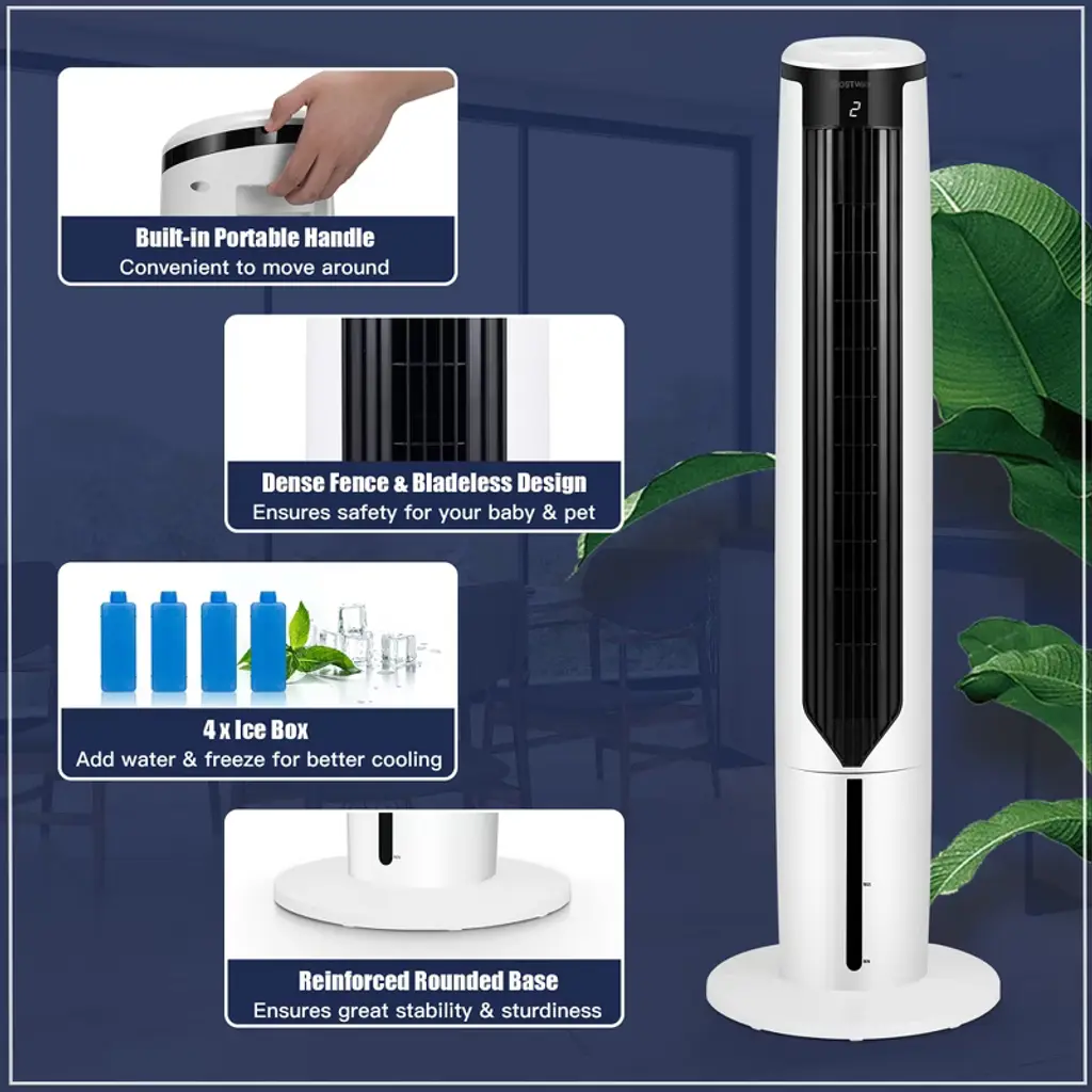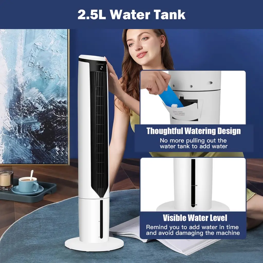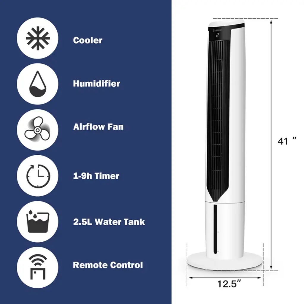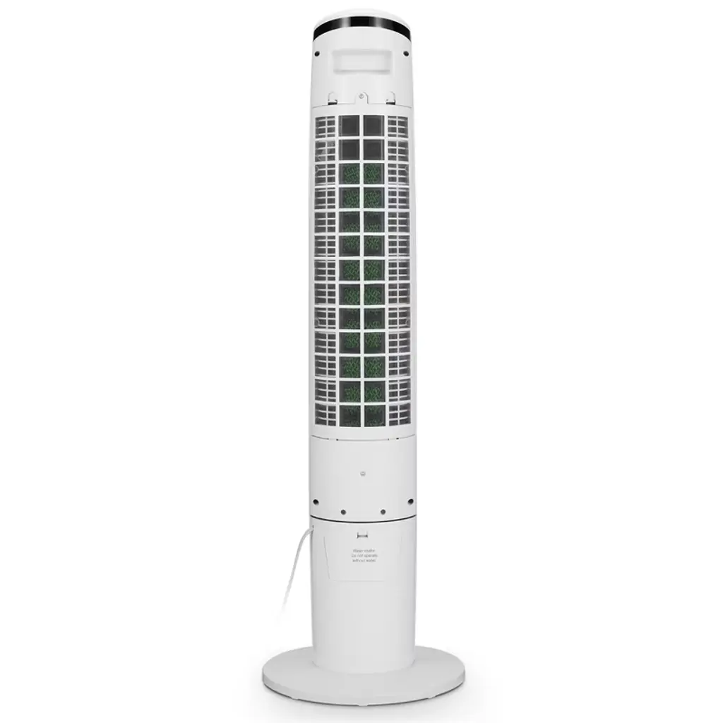 Our evaporative tower fan is a perfect choice to bring you a cool and fresh summer! This air cooler combines multiple functions into a compact and energy-saving design, providing a large amount of cool, humid, fresh and clean air flow. In addition, 4 ice boxes are provided to enhance the cooling performance and 70° wide oscillation can offer even air flow distribution to every corner of your room. The large capacity water tank can be used for a long time without frequent watering. And the cooler is available in 3 wind modes and speeds to offer the suitable airflow according to your own needs. Besides, the 1-9hour timing function and auto-off display screen will create a more livable and comfortable sleeping environment. Lightweight design and built-in handle allow you to move the tower fan anywhere. It is very suitable for your bedroom, living room, kitchen and office. Just click the remote or control panel and enjoy the impressive coolness.Features3 wind speeds and 3 wind modes meet all your needs for cooling Air cooler, fan, air humidifier, 3-in-1 multi-functional design Large round base and tower shape improve the overall stability 9-hour timing function bring you a comfortable and hassle-free sleep 2.5L water tank with enough water can last 13 hours for one time Transparent water level provides accurate residual water information Clear display screen and smart touch panel for convenient use Equipped with 4 ice boxes to enhance cooling performance Display screen can be turned off manually or automatically Bladeless design provides smooth breeze and ensures safety Remote control allows you to control the air cooler conveniently Oscillating design offers wide-angle and long-distance air supply Easy to move from room to room with the built-in handle Ideal for living room, bedroom, dining room and office useColor: White Material: ABS Product Dimensions: 12.5'' x 12.5'' x 41''(L x W x H) Rated Power: 45 W Voltage: 120V/60Hz Timer: 1-9 Hours Water Tank Capacity: 2.5L /0.66 Gallon Wind Speed: 3 Wind Mode: Normal/Sleep/Cooling Mode Oscillation: 70° Oscillation Net Weight: 11 lbs Cord Length:1.8m Package includes: 1 x Tower Fan 4 x Ice Crystal Box 1 x Instruction