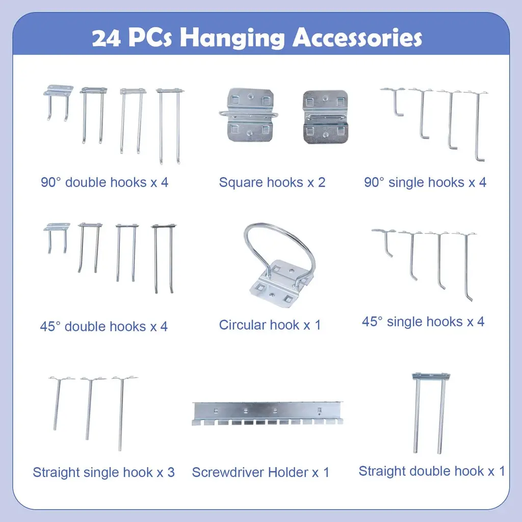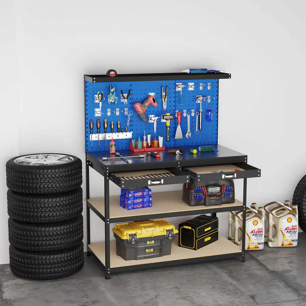 This robust and versatile 48" x 24" workbench is the ultimate solution for anyone looking to enhance their workspace efficiency. The work table comes equipped with multiple storage options including a top shelf, 3 pegboards, a spacious tabletop, 2 large drawers, and a 2-tier shelf. Mainly made of anti-deformation metal, it can hold heavy weight for most works. Additionally, the pegboards feature precisely arranged square holes for increased tool stability, and it includes 24 varied hanging accessories for optimum organization. Suitable for both professional and home settings, whether for crafting, repairs, or DIY projects, this workbench is designed to meet a wide array of needs, ensuring it is a valuable addition to any workshop or garage.FeatureHeavy-duty metal frame for 506 lbs total max load Equipped with a top shelf, 3 pcs pegboards, a tabletop, 2 drawers and 2-tier shelf 3 pegboards add more storage space Square hanging holes can load heavier items Comes with a screwdriver holder and 23 hanging hooks in different shapes Smooth drawers slide and convenient drawer handle make it easy to close and open Anti-slip footpads protect the floor from scratches Ideal for home, garage, workshop and so onSpecificationColor: Navy/Black Material: Metal, MDF Overall Dimension: 48" x 24" x 62" (L x W x H) Inner Size of Drawer: 23" x 20" x 2" (L x W x H) Height of Tabletop: 36" Weight Capacity of Tabletop: 220 lbs Weight Capacity of Drawer: 11 lbs Weight Capacity of Top Shelf: 44 lbs Weight Capacity of Each Lower Shelf: 110 lbs Total Weight Capacity: 506 lbs Net Weight: 102 lbs Package Includes: 1 x Workbench with Pegboard 4 x 90° Double Hooks 4 x 45° Double Hooks 4 x 90° Single Hooks 4 x 45° Single Hooks 3 x Straight Single Hooks 1 x Straight Double Hook 2 x Square Hooks 1 x Circular Hook 1 x Screwdriver Holder 1 x Instruction