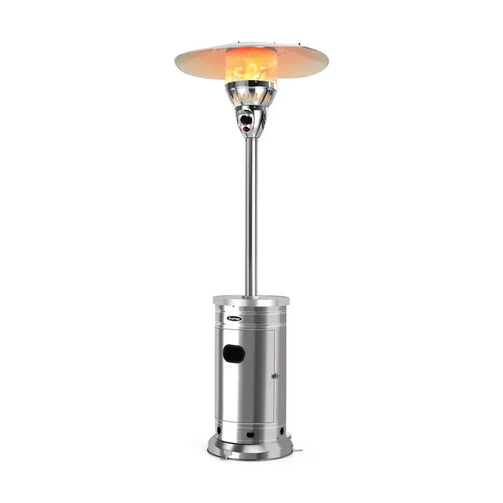 Creates a warm and comfy place for outdoor activities with this 48000 BTU patio heater! With 48000 BTU output, heat-focusing reflective cover and flame emitter, this outdoor heater produces steady and comfortable warmth and heats up to 25 feet. Likewise, the simple ignition system and convenient drink shelf table make this patio heater easy to operate and humanized to fetch beverages. Apart from these, safety is very important. Hence, the tip-over protection and flameout protection ensures you and others’ safety. What’s more, this standing heater features premium stainless steel, base reservoir and ground fixers so that it can stay outdoors firmly. When out of use, there are 2 smooth wheels for you to push this outdoor heater easily. Features48000 BTU heat output for warming up 25 feet Heat-focusing reflective cover and flame emitter for maximum heat efficiency Tip-over protection, flameout protection and CSA certification for security Convenient to operate with simple ignition system Heat control knob for low or high heat settings Puts your beverages on the drink shelf table for great convenience Fills water or sand to the base reservoir for stability Grounds fixers for additional stability for staying outdoors Premium stainless steel for long time use 2 smooth wheels for effortless movement Fixing ropes to keep the standard 20 lbs propane cylinder (not included) in place Easy to install with the detailed instruction and necessary accessoriesColor: Silver Material: Stainless Steel Overall dimension: 32.5'' x 85'' (Dia. x H) Diameter of shelf tabletop: 16'' Net weight: 33 lbs Heat output: 48000 BTU Package includes 1 x Patio heater 1 x Instruction