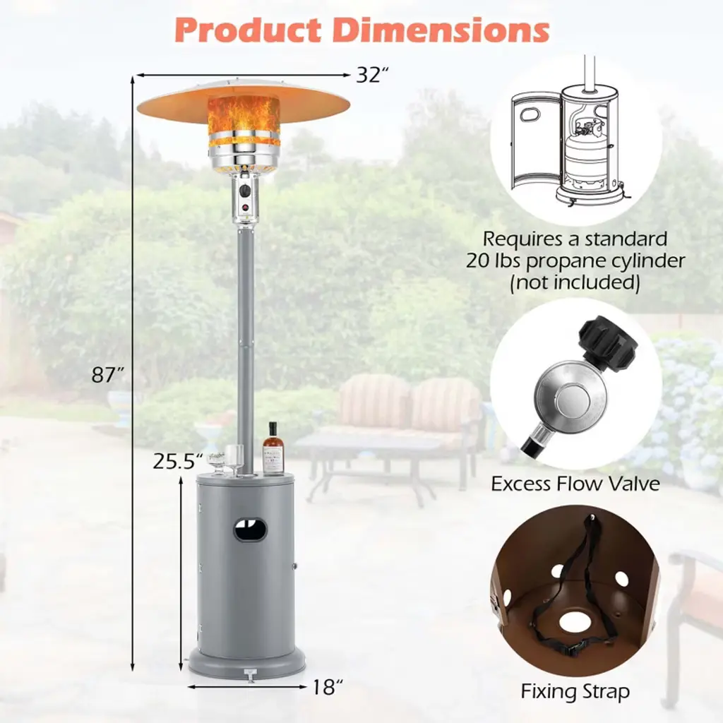 Experience unparalleled cozy warmth with this 50,000 BTU patio heater, perfect for enhancing outdoor comfort. This outdoor propane heater will instantly heat up your space with a wide 20 ft diameter range and 360° heating capability, ideal for gatherings of 6-8 people. Much more solid than normal heating mesh which easily starts to deform after 6h burning, ours won’t deform even after 96h burning. For safety, the heater is equipped with tip-over and flame-out protection, boasting a CSA certification. Operation is a breeze with a one-touch ignition system. And the integrated table plus easy mobility wheels make the heater exceptionally user-friendly. Enjoy long-lasting, reliable warmth and convenience with this thoughtfully designed outdoor heater. FeaturesDelivers 50,000 BTU powerful heat output Covers up to 20 ft diameter range 360° heating design for optimal warmth High-quality 304 stainless steel burner with thick mesh for long-lasting burning Aluminum reflective cover enhances heating efficiency Designed with safety tip-over and flame-out protection Auto off when tilt angle is over 45° CSA certified for reliability and safety One-touch ignition system for ease of use Integrated table for drinks and snacks placement Convenient hole for easy access to gas valve Designed with an excess flow valve and fixing strap for 20 lbs gas tank (not included) Equipped with 2 wheels for easy movement Stable base with 3 ground fixtures for securityColor: Bronze/Gray/Black Material: Aluminum, 304 Stainless Steel, Metal Dimensions: 32" x 87"(Dia x H) Net Weight: 33.5 lbs Heat Output: 50,000 BTU Heat Coverage: 20 ft Package Includes: 1 x Patio Heater 1 x Instruction