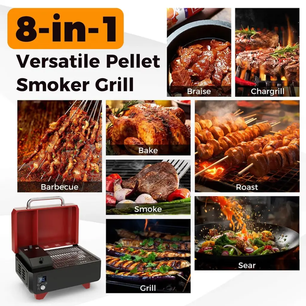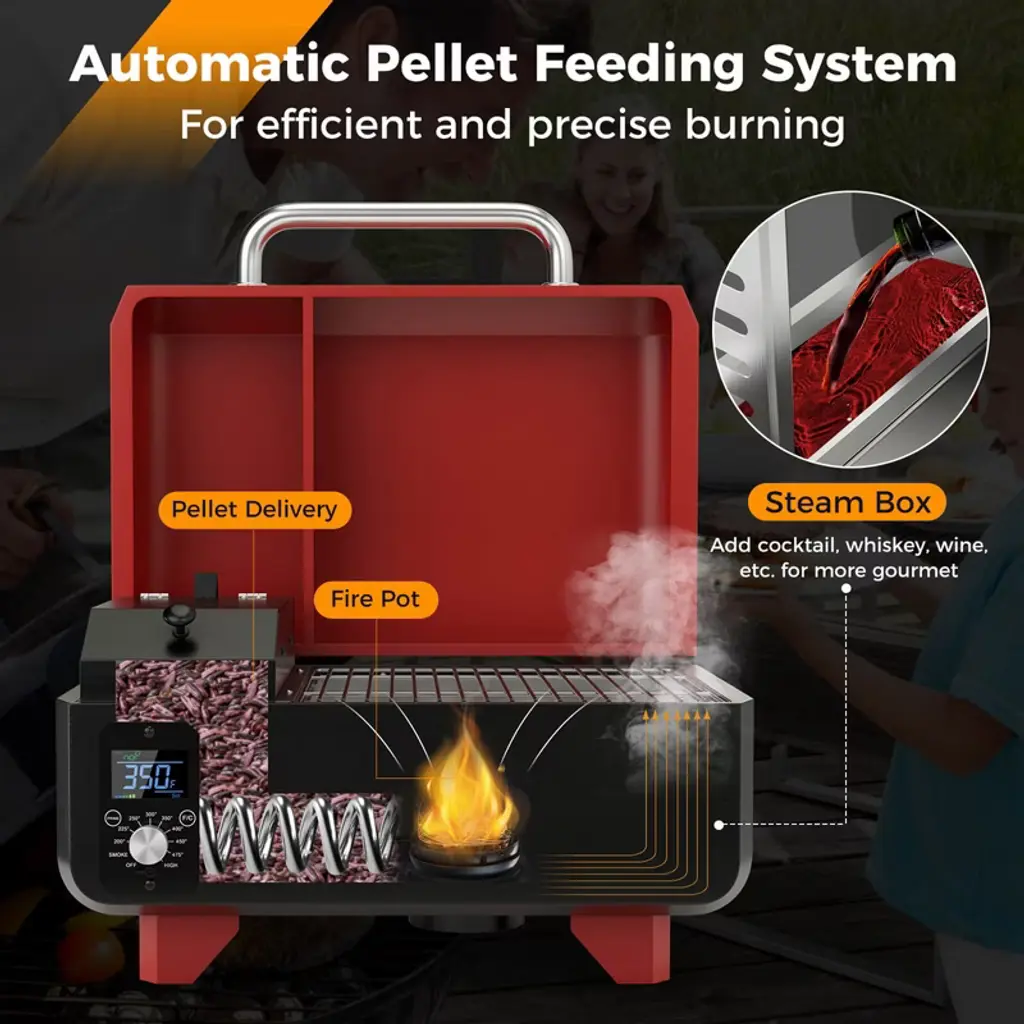 Elevate your outdoor cooking game with this portable pellet grill, a master of versatility and efficiency. Engineered for enthusiasts seeking a superior grilling experience, our 8-in-1 tabletop stove boasts optimal temperature precision and a range of cooking methods: grill, smoke, bake, roast, sear, braise, barbecue or char-grill to your heart’s content. Maintenance is a breeze with its detachable ash pan and grease tray, while its cutting-edge design significantly cuts down on ash residue. Ideal for RV camping and backyard festivities, this user-friendly grill delivers consistently delicious results with ease. Make every meal an occasion to savor with this compact and feature-rich outdoor cooking companion.FeaturesHigh-end pellet feeding and combustion system for efficient and precise burning Digital control panel for prime mode and simple °F/°C switch 500°F max temperature with flexible adjustment meets more demands Meat probe for precise monitoring of the temp inside food Large-capacity hopper accommodates more pellet Add red wine or whiskey to steam box for unique flavor of food Easy to clean with detachable ash pan and grease tray Suitable for multiple cooking techniques Stainless steel handle for easy open and close of the lid Stable and thickened legs make grill stand without wobbling Air vents for better hotness dissipation Locking buckles ensure higher safety Please close the blocking paddle of fire pit during burningColor: Black/Red Material: Metal, Stainless Steel Overall Dimension: 23.5" x 18" x 15" (L x W x H) Dimension of Cooking Area: 14" x 13"(L x W) Dimension of Ash Tray: 11" x 5" x 1" (L x W x H) Dimension of Grease Tray: 13.5" x 3" x 2(L x W x H) Capacity of Hopper: 2.4 L Net Weight: 42 lbs Cord Length: 60" Temperature Range: 180-500°F Voltage: 110-120V, 60Hz Rated Power: 230W Package Includes: 1 x Pellet Grill 1 x Meat Probe 1 x Instruction