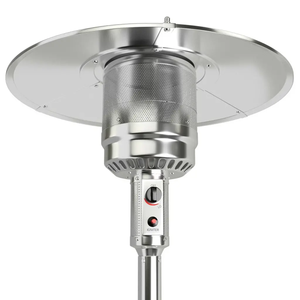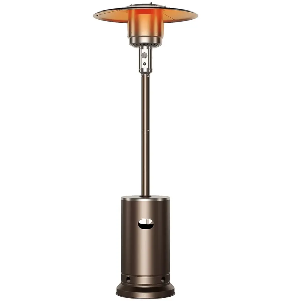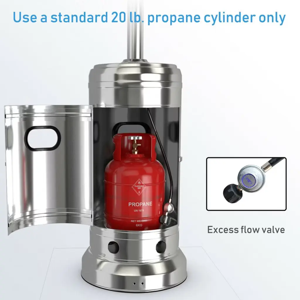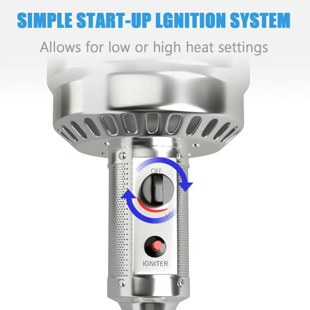 In your spare time, it is a pleasure to enjoy leisure time in the patio with your friends or family. But do you often worry about getting cold outside when the temperature drops? Try to use our metal patio heater to solve this problem! This professional outdoor gas heater is 87'' tall and provides continuous warmth and modern design. It has ultra-efficient performance which has a wide range of heating areas. The bottom of the heater can be filled with sand or water to increase weight and stability. When the heater tilts, the valve of the gas cylinder will automatically close to ensure safe use. The gas cylinder can be easily put into the cylinder housing because of the open-door design. You can enjoy the best time with your loved ones without worrying about the low temperature.FeaturesTwo smooth wheels for convenient transport A spacious warm area with a diameter of 13' Sand or water can be added to the bottom to increase weight and stability High performance heating element with power of 48,000 BTU The reflector cover can keep the warm temperature better High quality metal for durability and has long service time Suitable for different places like patio, deck and garden Compact design saves your space and for easy storage Extra shelf on post for placing your drinks and wines A door on the housing for easily installs the gas tank Heating effect is good with the high calorific value Suitable for family parties and friends gatherings Simple assembly neededMaterial: Metal Color: Silver Product Size: 32'' x 32'' x 87'' (L x W x H) Base Size: Dia.18 x 3.5 inch Cylinder Housing Size: 15 x 30 inch Combustion Screen Size: Dia.11 x 8.5 inch Reflector Cover Size: Dia.32 inch Desktop Diameter: 16 inch Main Strut Size: 2.5 x 33.5 inch Power: 48000 BTU Combustion Capacity: 1 - 2 lbs/h Fuel: 20 lbs Propane Cylinder Net Weight: 35 lbs Package includes: 1 x Heater 1 x Shelf 1 x Instruction