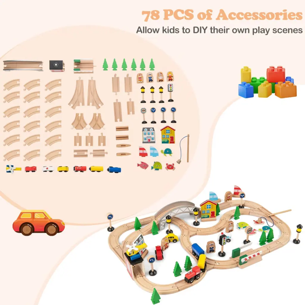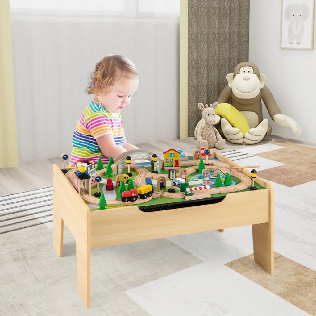 Find the ultimate hub for exploration and fun with our all-in-one kids activity table! This multipurpose play table includes a brick building top and a reversible top that converts between a train platform and chalkboard surface, opening up lots of possibilities for kids to engage in a wide range of activities and unleash their creativity. Moreover, the storage compartment beneath the tabletop encourages toddlers to tidy up their playthings after use, while also serving as a space for sand playing. Equipped with 75 toy accessories, the wooden train table offers a wealth of options for imaginative play. As a wonderful gift for children over 3 years old, this wooden construction table fosters their storytelling skills, critical thinking, and social interactions.FeaturesVersatile as a train, blackboard, building block, storage and sand table 75 pcs of accessories provide little ones with rich scenes and figures Keep children’s belongings organized with hidden storage Splinter-free surface and rounded edges for secure use Anti-pinch cut-out handle makes it easy to remove the tabletop Solid beech wood tracks with tight connections for durability Education gift for kids to develop essential skills through playing Assembly requiredColor: Natural Materials: MDF, Solid Wood Product Dimensions: 31" × 22.5" × 15.5"(L x W x H) Dimension of Storage Space: 30" × 20" × 3.5"(L x W x H) Weight Capacity: 55 lbs Suitable Ages: 3+ Years Old Net Weight: 28.5 lbs Package Includes: 1 × Wooden Activity Table 1 × Baseplate 75 × Toy Pieces 1 × Instruction