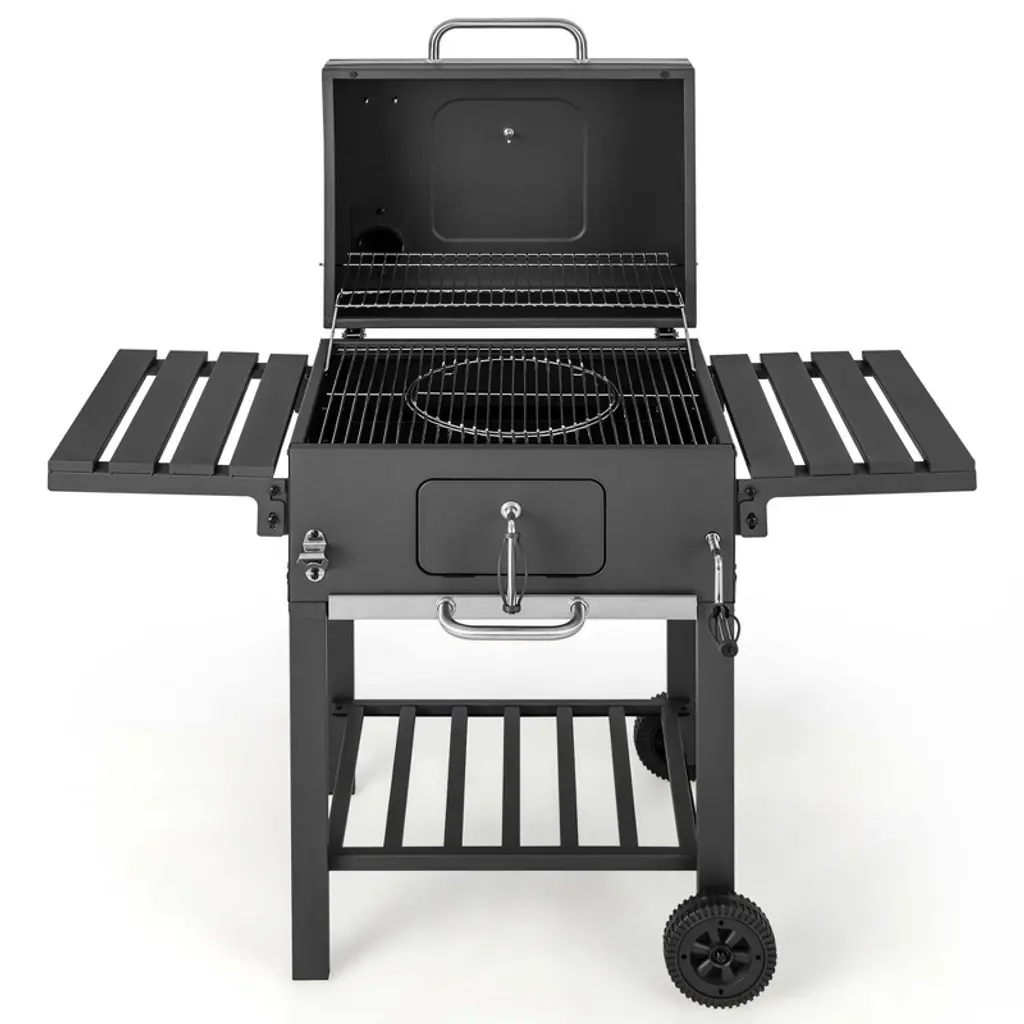 This BBQ charcoal grill will be the perfect addition to your outdoor cooking experience! This well-made steel charcoal grill with 2 smooth rolling wheels is ideal for various outdoor cooking occasions, like backyard BBQ parties, family gathering, picnics, and more. The large cooking space and warming rack can meet various cooking needs, such as steaks, shrimps, chicken, vegetables, etc. Besides, equipped with 2 foldable side tables, 8 hooks and 1 large bottom shelf, the cooking grill ensures everything you need is within reach. The front of the grill features a charcoal entry port, complete with a cool-touch handle. The adjustable chimney on the top and 2 air vents on the side ensure proper ventilation and heat regulation. And the lid-mounted temperature gauge allows you to monitor the heat levels in real-time. Plus, the height of the charcoal tray can be easily adjusted for customized cooking. FeaturesEasy to add charcoals by opening the door or removing the middle grilling plate 2 foldable side tables & 8 hooks keep grilling essentials close at hand Large cooking area and warming area can serve a large BBQ party Rustproof powder-coated steel material ensures long-lasting use Height-adjustable charcoal pan with holes for easy heat control Built-in temperature gauge shows real-time inside temperature 2 side dampers to adjust the airflow for efficient burning 2 large wheels ensure easy movement and transportation Cleaning up is a breeze with the pull-out ash tray Cool-touch handles are safe and cozy to gripColor: Black Material: Steel, PP Product Dimension: 50.5'' x 21'' x 46'' (L x W x H) Diameter of the Wheel: 6'' Grilling Grate Size: 23'' x 17'' (L x W) Warming Rack Size: 22'' x 10'' (L x W) Power Source: Charcoal Net Weight: 57 lbs Package Includes: 1 x Charcoal Grill 1 x Instruction