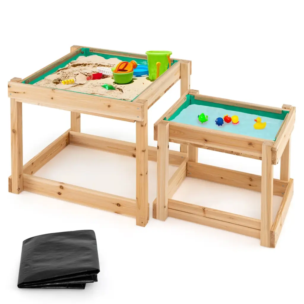 Unlock endless fun for your child with our wooden sand and water tables! Made with sturdy fir wood that is resistant to cracking and fading, these outdoor sensory tables can be painted in various colors for a personalized touch. The tables are perfect for little ones to play with sand and water, providing hours of entertainment. The included protective cover ensures cleanliness and extends the life of the tables, making them a practical addition to your backyard or garden. When not in use, the smaller table conveniently fits under the larger one for space-saving storage, helping to keep outdoor areas neat and tidy. These wooden sensory tables are a fantastic gift for kids, encouraging creativity and social interaction through play.Features2-in-1 versatile design for various fun – a water table and sand table Natural and sturdy fir wood provides durability and sturdiness Paint the tables to your desired color for DIY fun Come with a protective cover for convenience Space-saving storage with the small table tucked under the large table Ideal gift for little ones aged 3+ years old Perfect for enhancing hands-on ability and social skills Suitable for kids to play in the backyard, garden, and lawnColor: Natural Materials: Fir Wood, PE Dimensions of Large Table: 26" x 25" x 24" (L x W x H) Dimensions of Small Table: 21" x 18" x 18.5"(L x W x H) Inner Size of Large Table: 23" x 21" x 3" (L x W x H) Inner Size of Small Table: 19" x 13" x 3" (L x W x H) Total Net Weight: 24 lbs Weight Capacity of Each Table: 110 lbs Suitable Ages: 3+ Years Old Package Includes: 2 x Tables 1 x Cover 1 x Instruction
