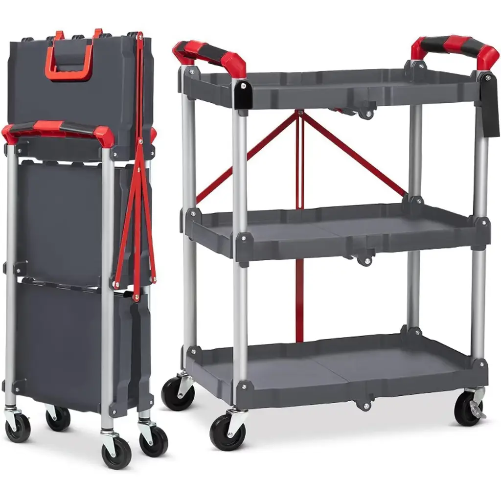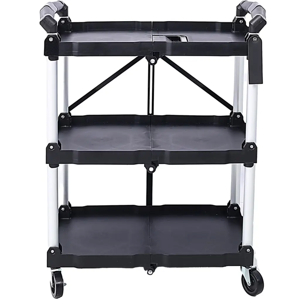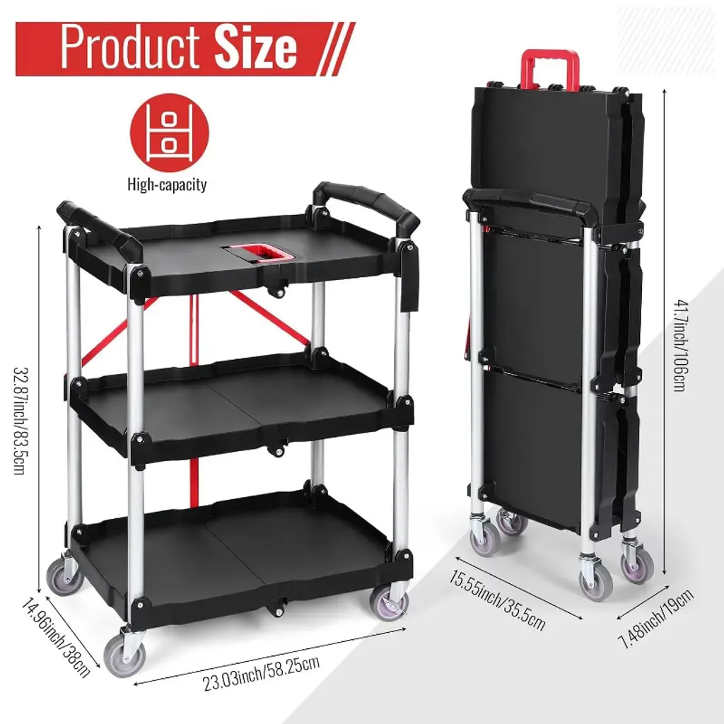 Portable Folding Service Cart, 3 Tier Folding Utility Cart 3 tier foldable rolling cart is collapsible, thick PP trays and lightweight aluminum framing ensures durability for this 32.8 inch (83.5cm) tall storage cart with wheels. Rubber-lined handles make for comfortable daily use.