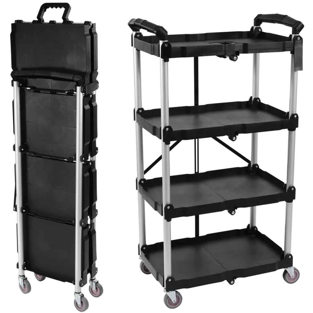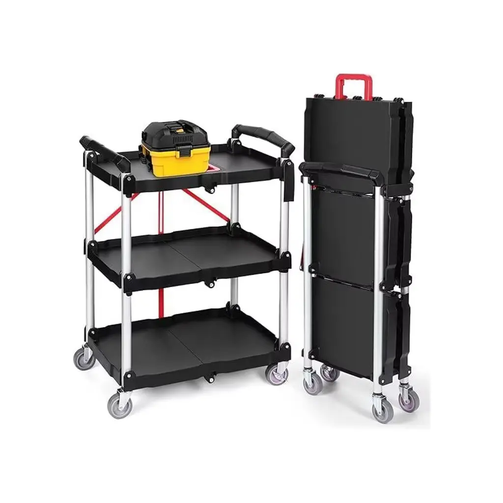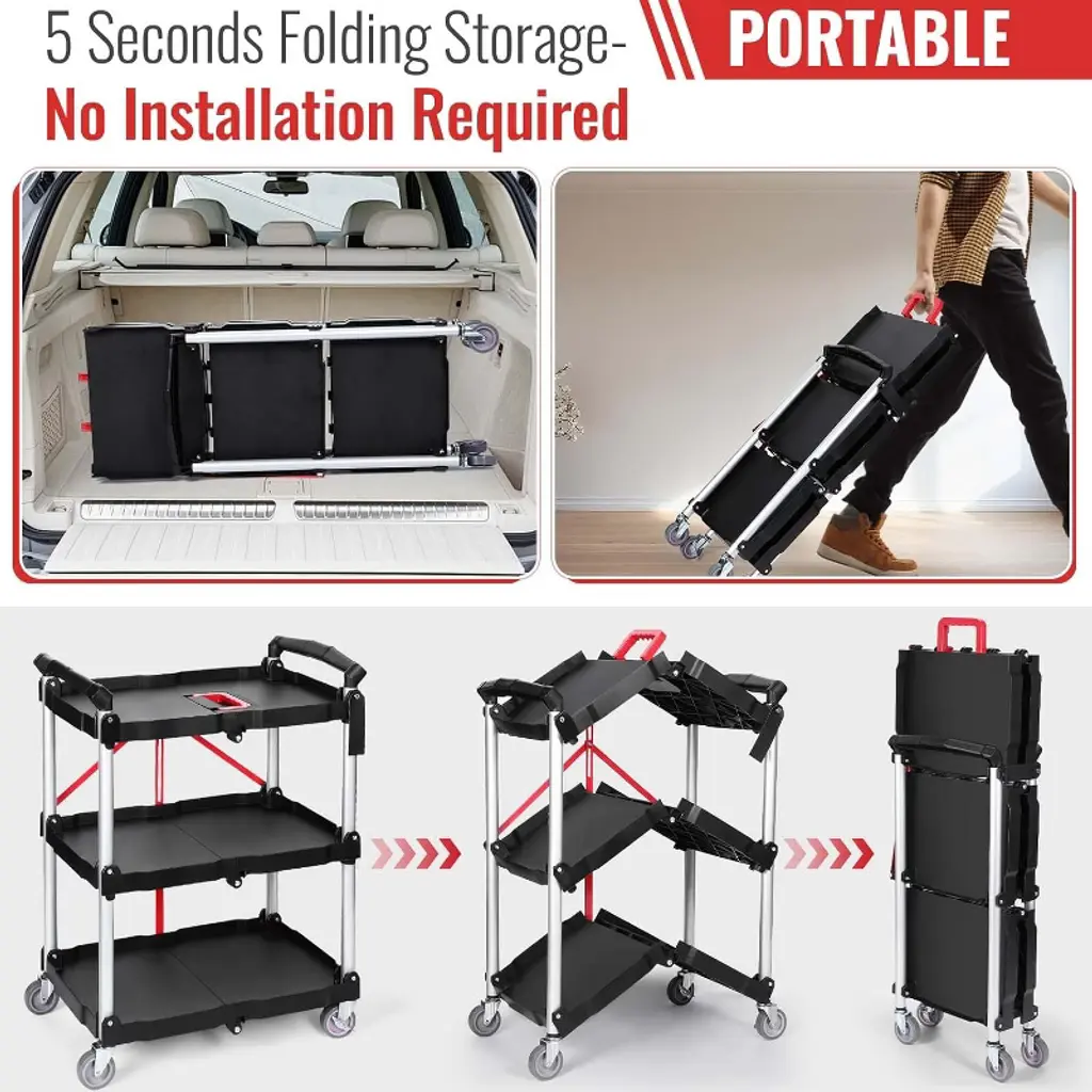 Portable Folding Service Cart, 3 Tier Folding Utility Cart 3 tier foldable rolling cart is collapsible, thick PP trays and lightweight aluminum framing ensures durability for this 32.8 inch (83.5cm) tall storage cart with wheels. Rubber-lined handles make for comfortable daily use.