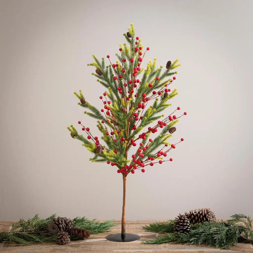 Get ready for Christmas with this Country Christmas Tabletop Tree! This tree sports vibrant, red-colored matte berries with a mix of bright and dark green pine. Crafted of a metal base, this design stands sturdy on a table, counter, shelf and more. Accents are crafted of polysterene and plastic for a lightweight design. Use this tabletop tree to accent a holiday display and add stunning color anywhere.