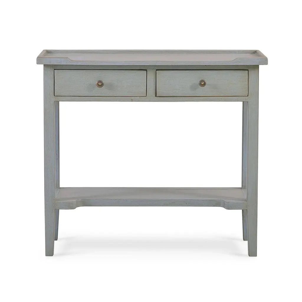 Measuring 33" W x 13" D x 30" H, this classic piece combines timeless design with practical functionality, making it a perfect addition to your home.Crafted with meticulous attention to detail, this console table features a raised edge gallery top, perfect for keeping your items secure. The two convenient drawers provide ample storage for your small essentials, while the lower shelf offers additional space for books, magazines, or decorative items. The gorgeous Charleston Gray finish adds a sophisticated and serene touch that complements any decor style.Dimensions: 33" W x 13" D x 30" HCustom finish options are also available. Contact us to learn more.