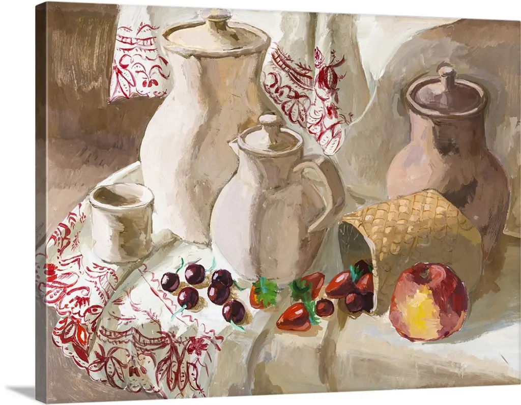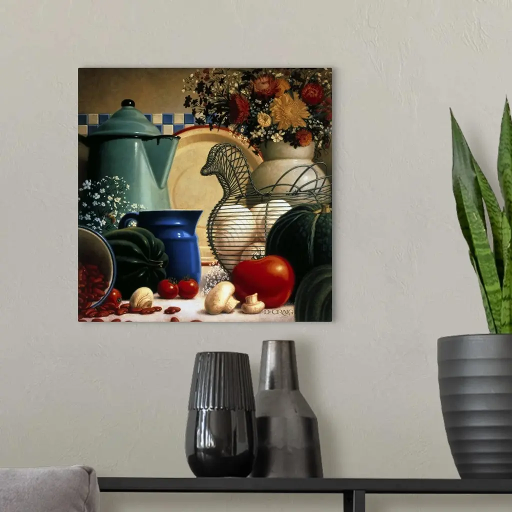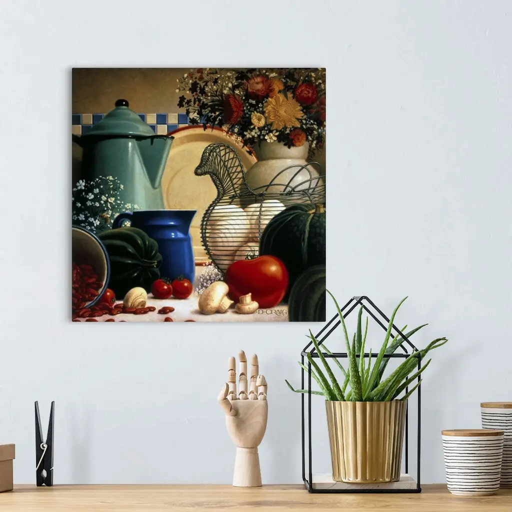 A still life depicting various kitchen items, including a hen-shaped basket for eggs, a coffee pitcher, a plate, a smaller pitcher (possibly for cream), a vase filled with flowers, and various vegetables (mushrooms, acorn squash, kidney beans, and a tomato).