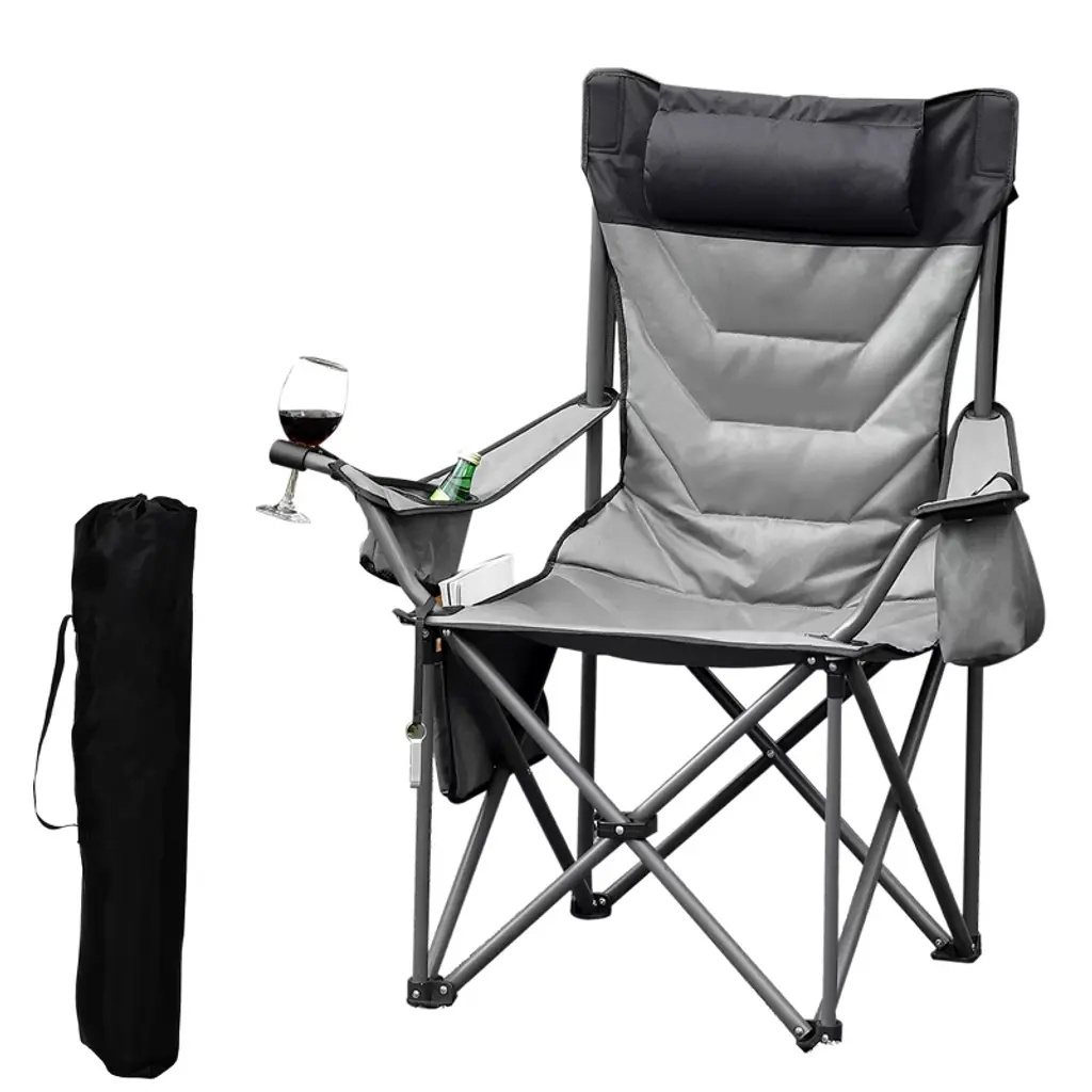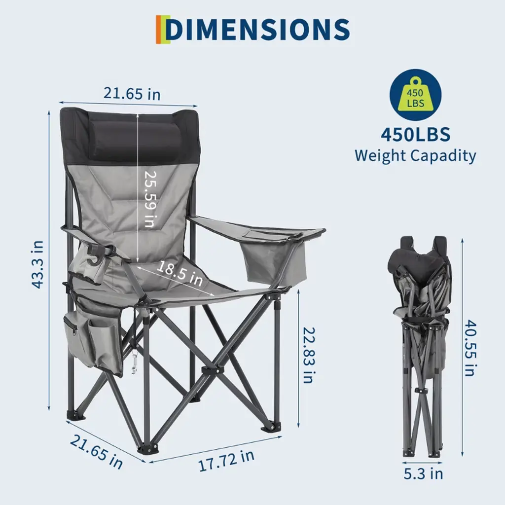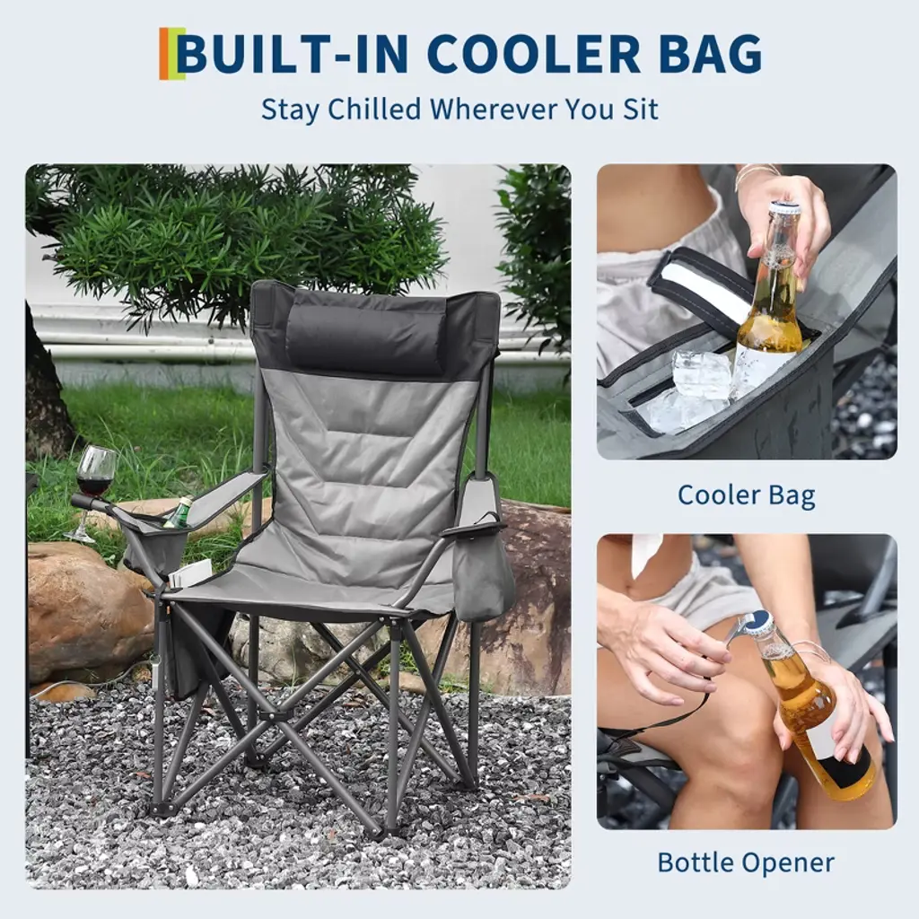 Oversized heavy-duty camping chair supports 500 lbs with steel frame and 600D fabric. Padded high back. Includes cooler bag, cup/wine holders, bottle opener, side pockets. Folds fast for easy carry.